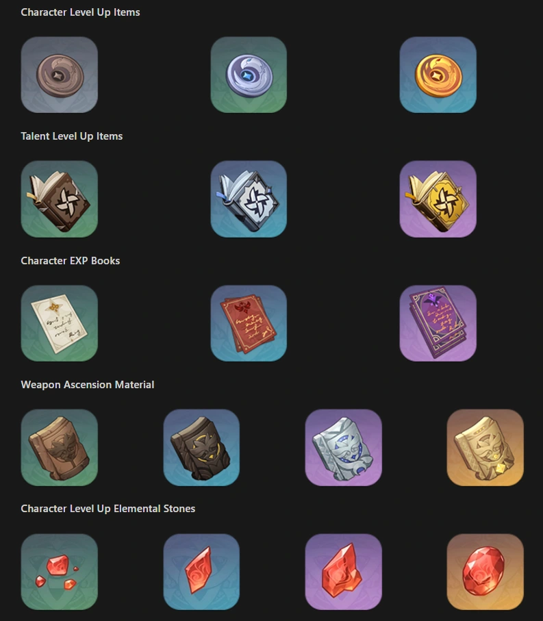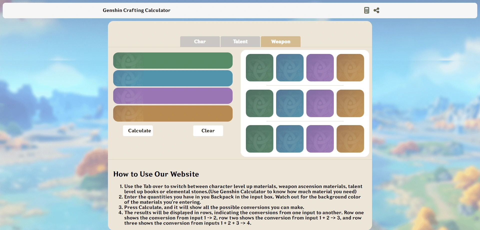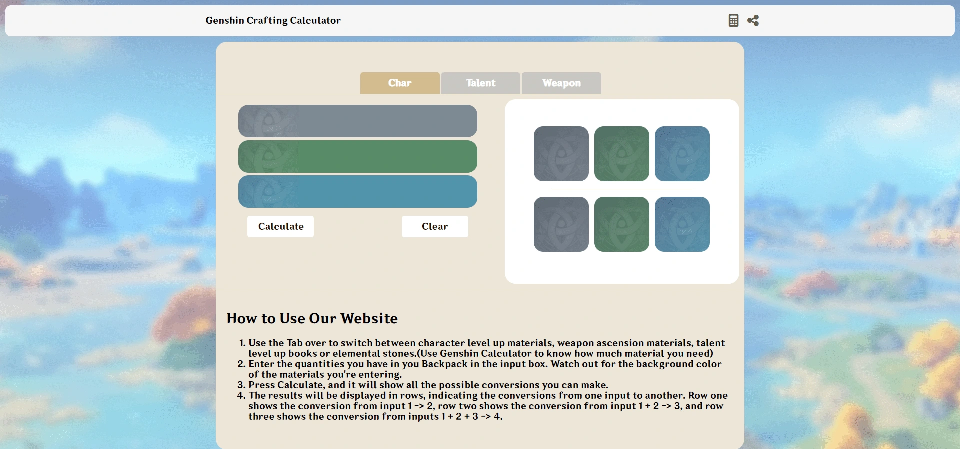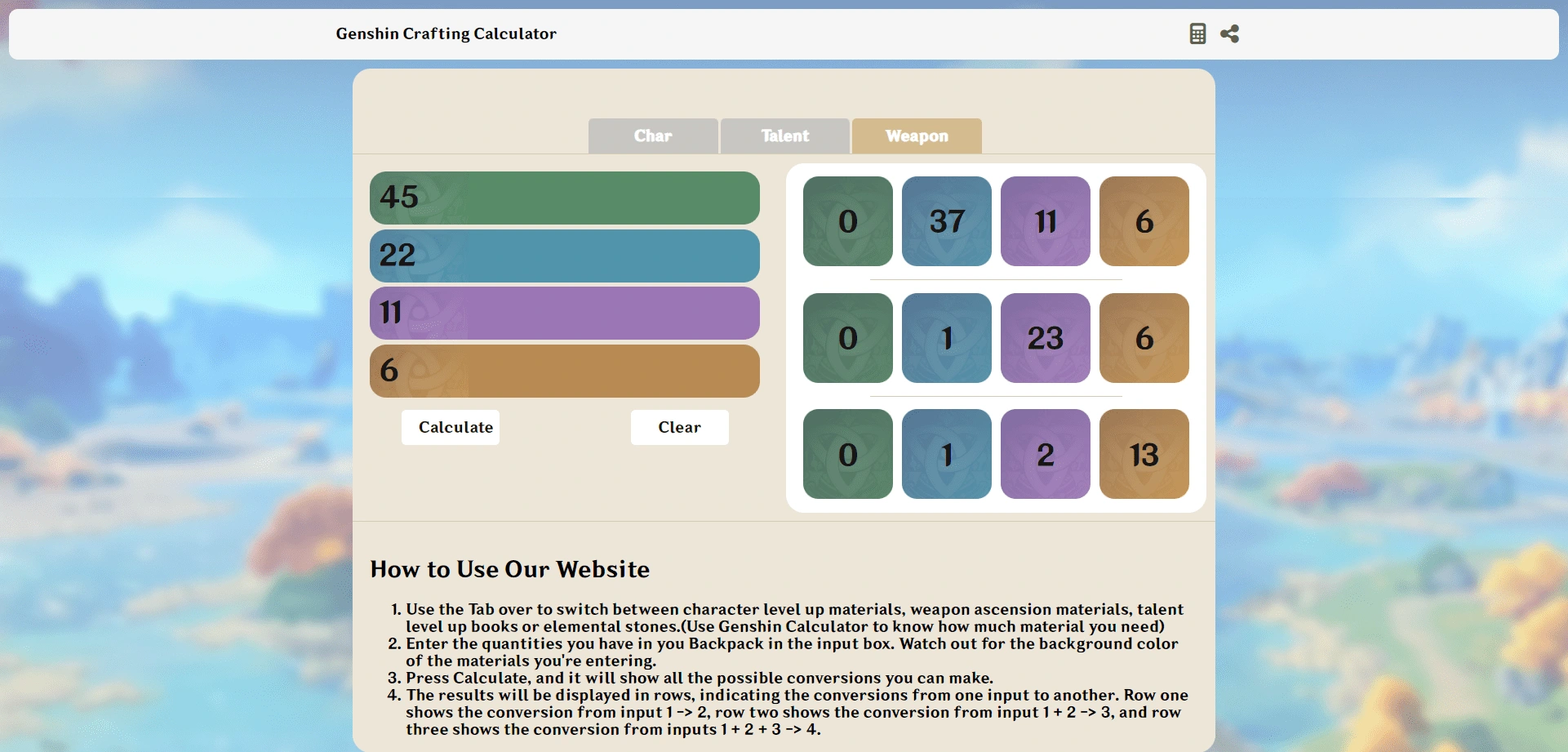 This web application is designed to assist players of Genshin Impact in calculating the materials needed for various crafting purposes, such as character level-up materials, weapon ascension materials, talent level-up books, or elemental stones. The calculator eliminates the need for manual calculations by providing a user-friendly interface.