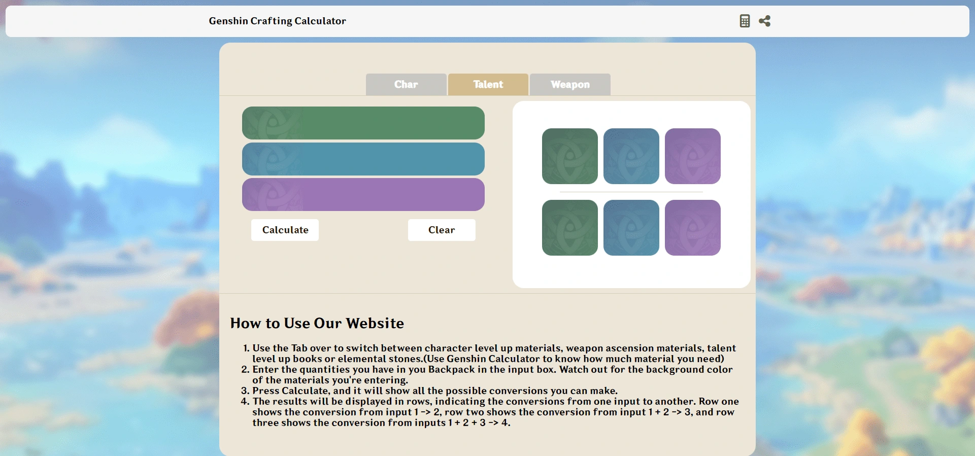 To use the Genshin Impact Crafting Calculator, follow these steps: