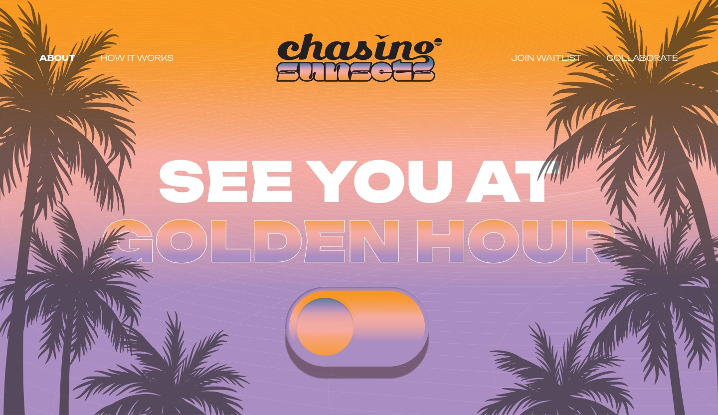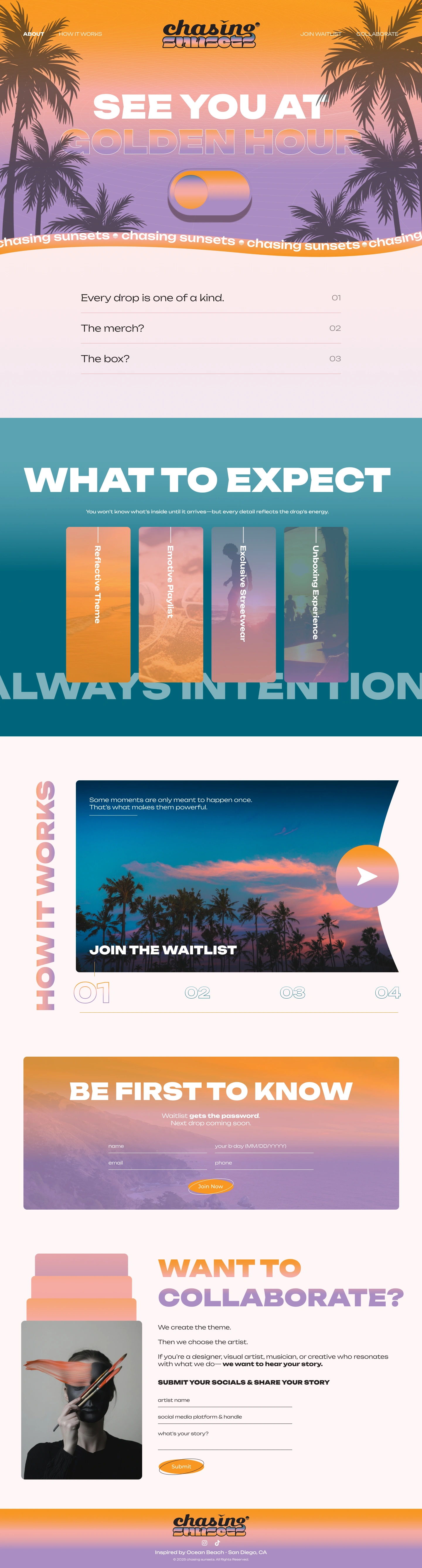 Chasing Sunsets is a curated streetwear and art-infused drop brand. The site needed to reflect a sense of mystery, exclusivity, and strong visual storytelling. Key features include: