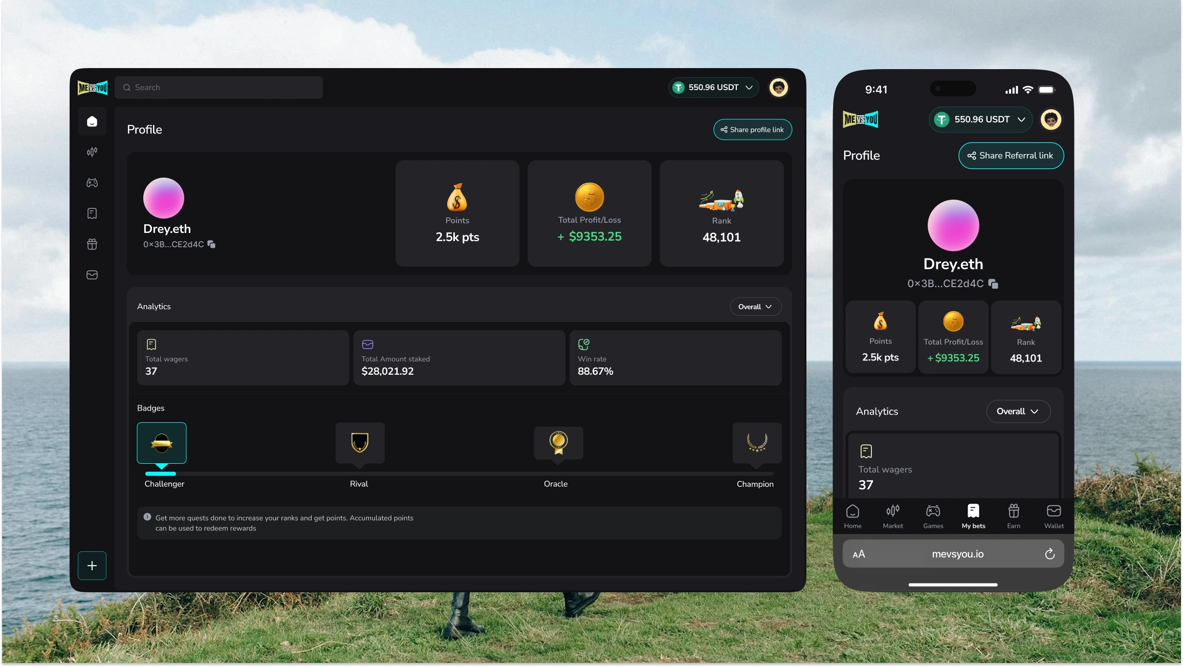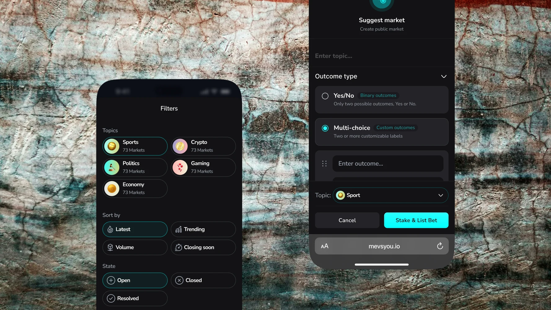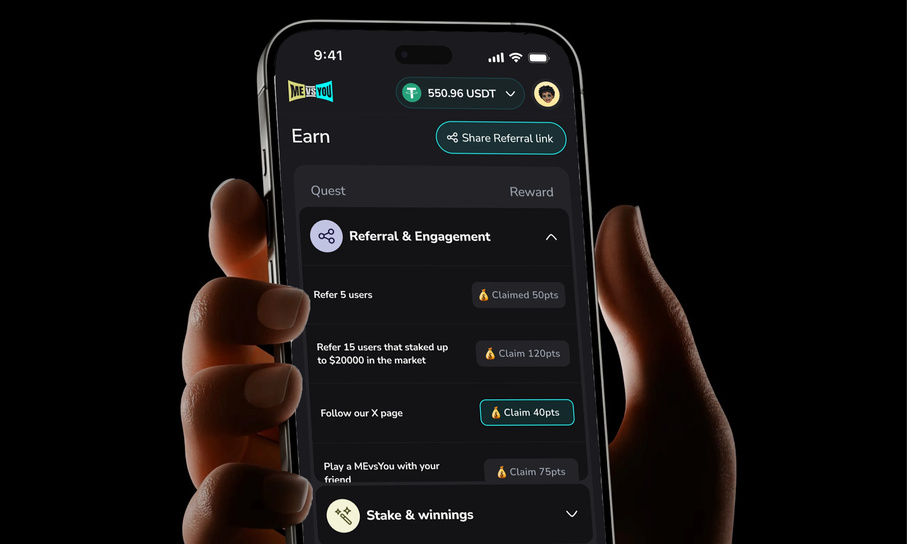 MEvsYOU is a decentralized prediction market and peer-to-peer staking platform built for Africa. It blends forecasting, social competition, and lightweight gaming , allowing users to stake against each other, not faceless markets.