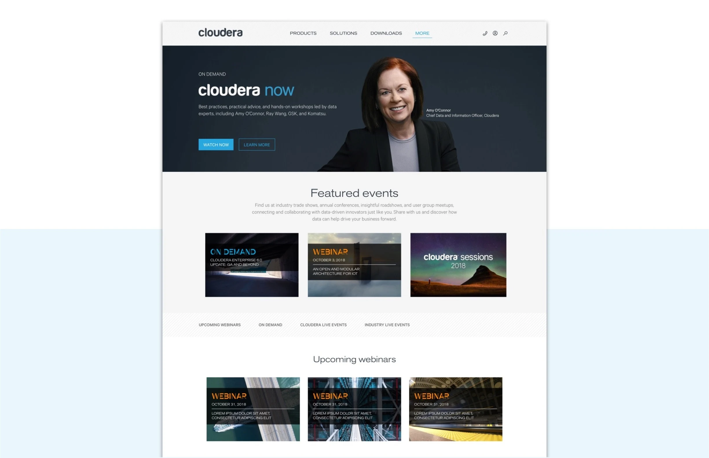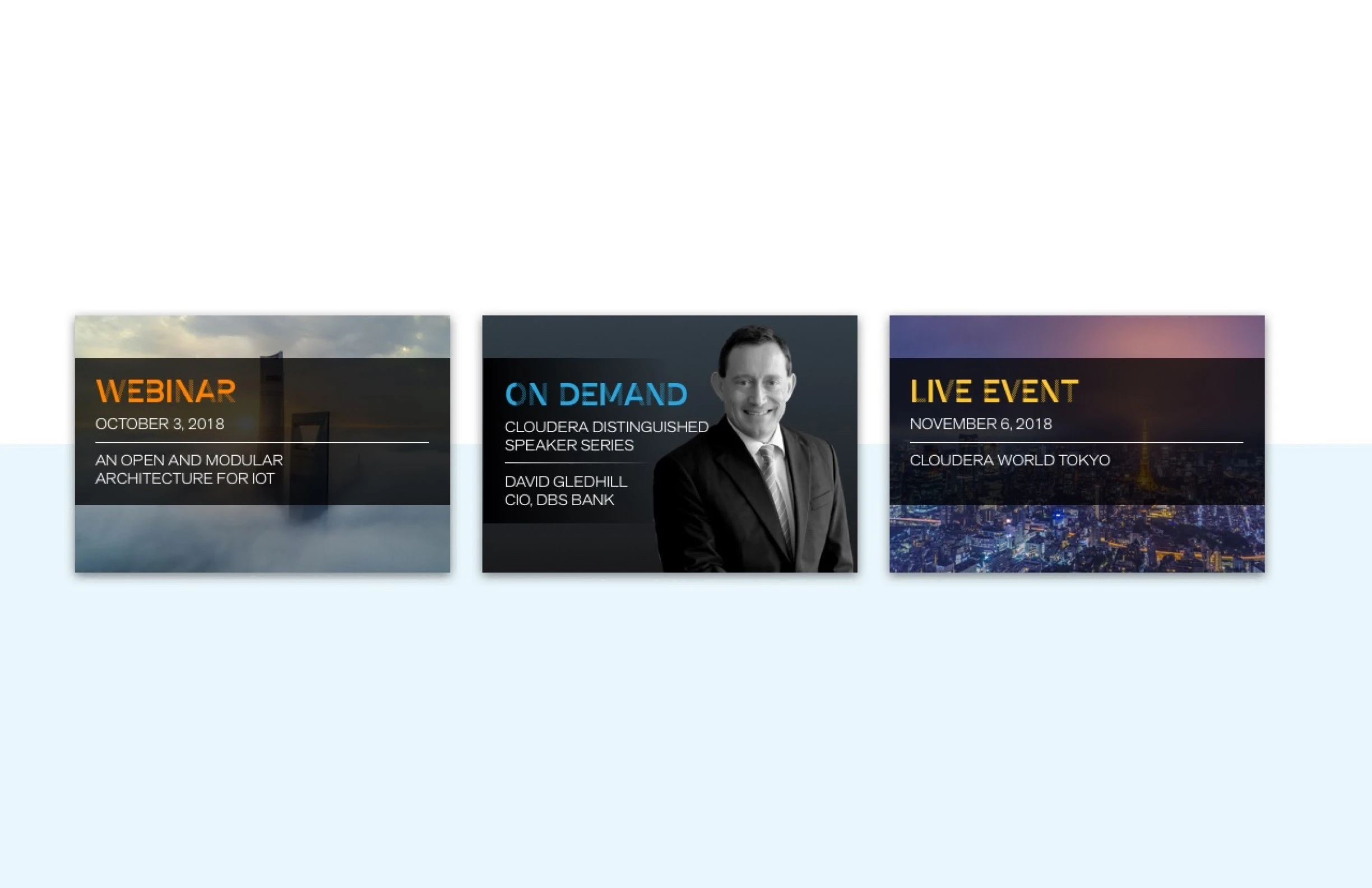 Cloudera wanted to enhance its online event and webinar presence and needed to organize the content generated through these events in a visually appealing way. As the designer, my task was to develop a versatile template that could accommodate various background images while effectively conveying event information through key color styles.