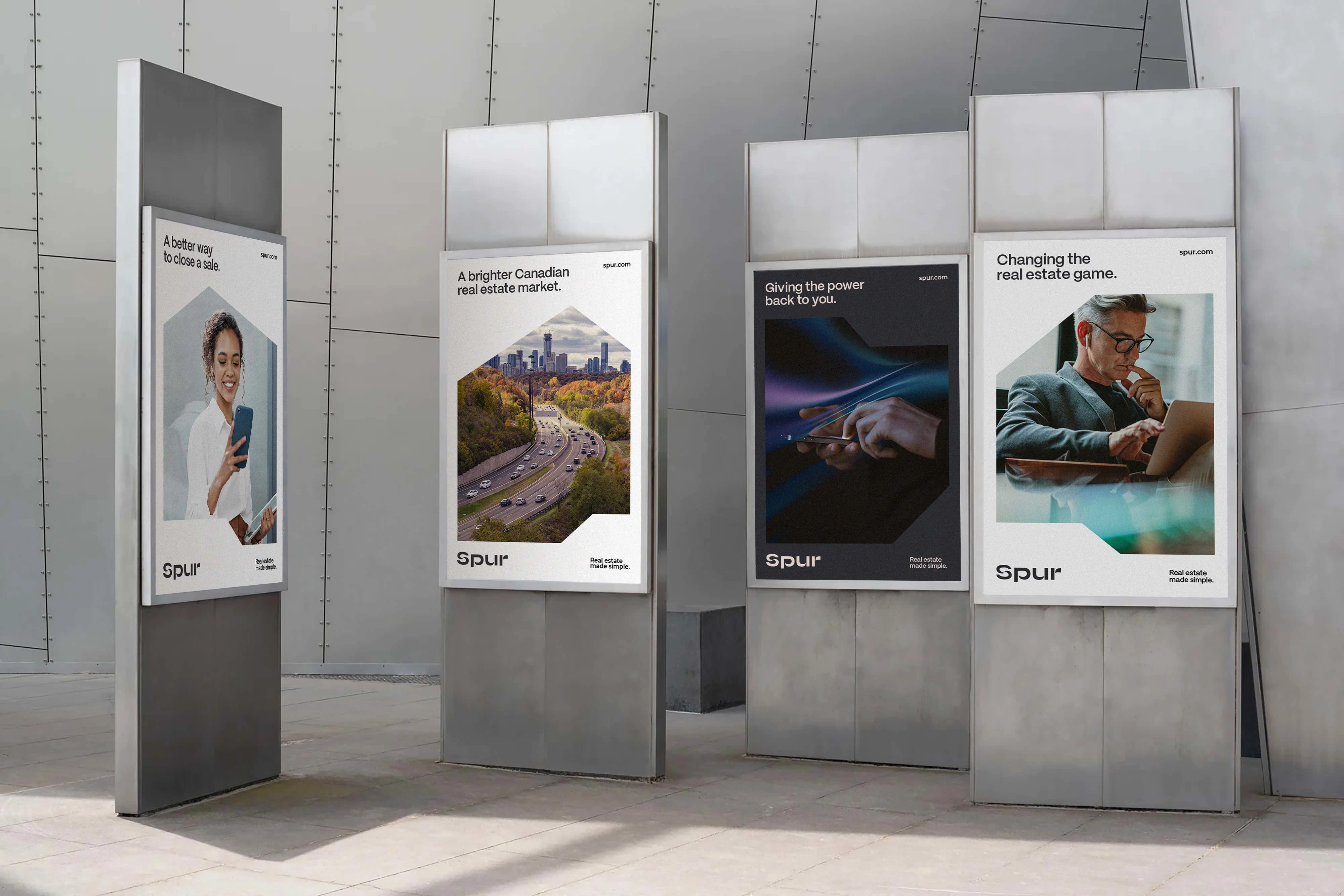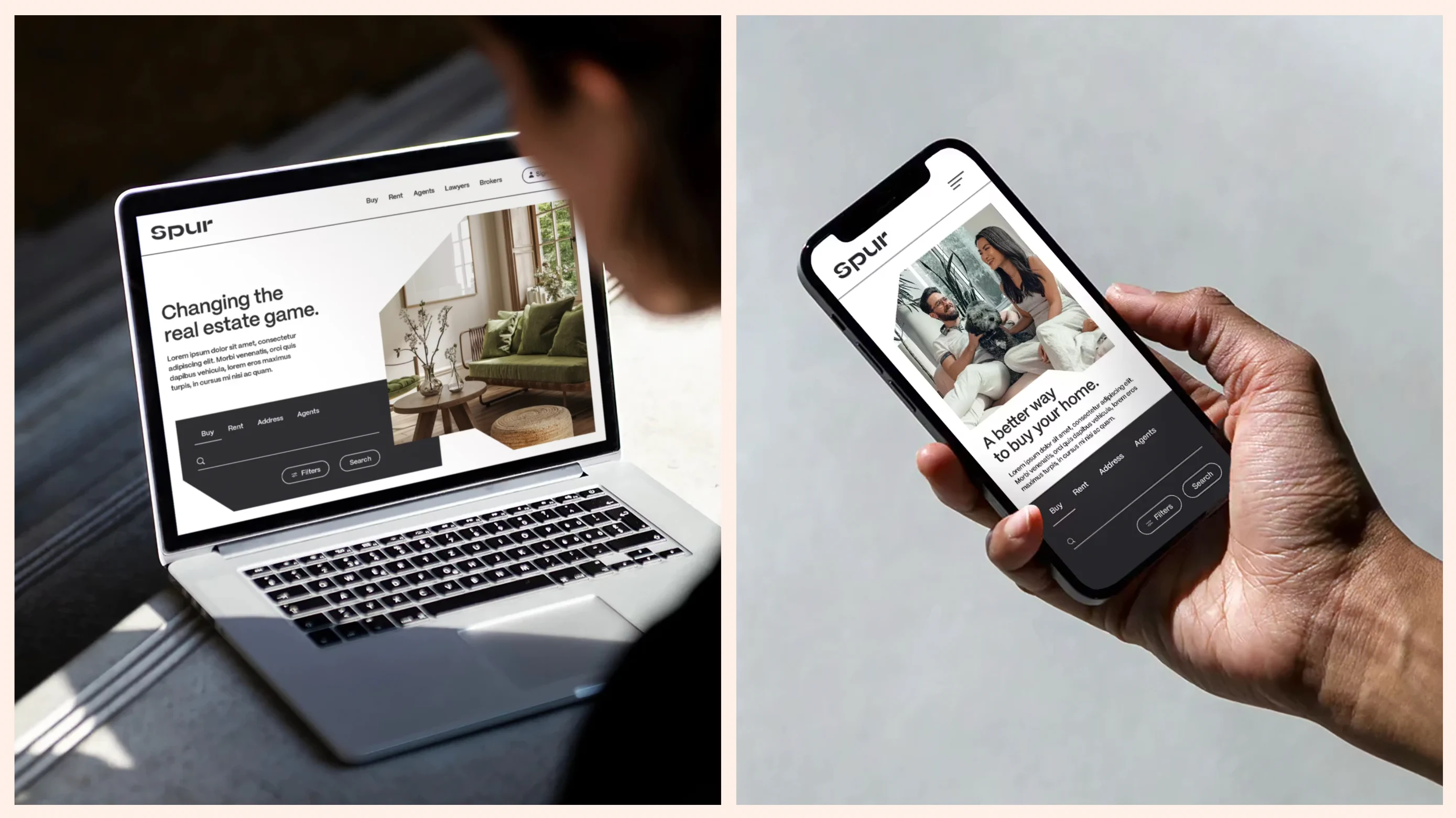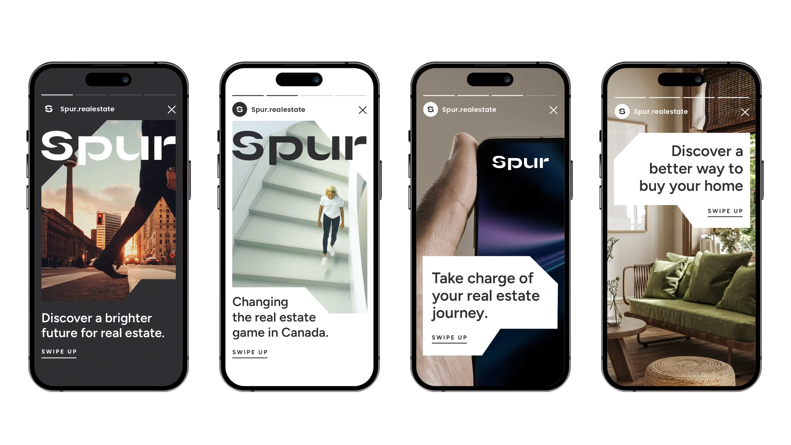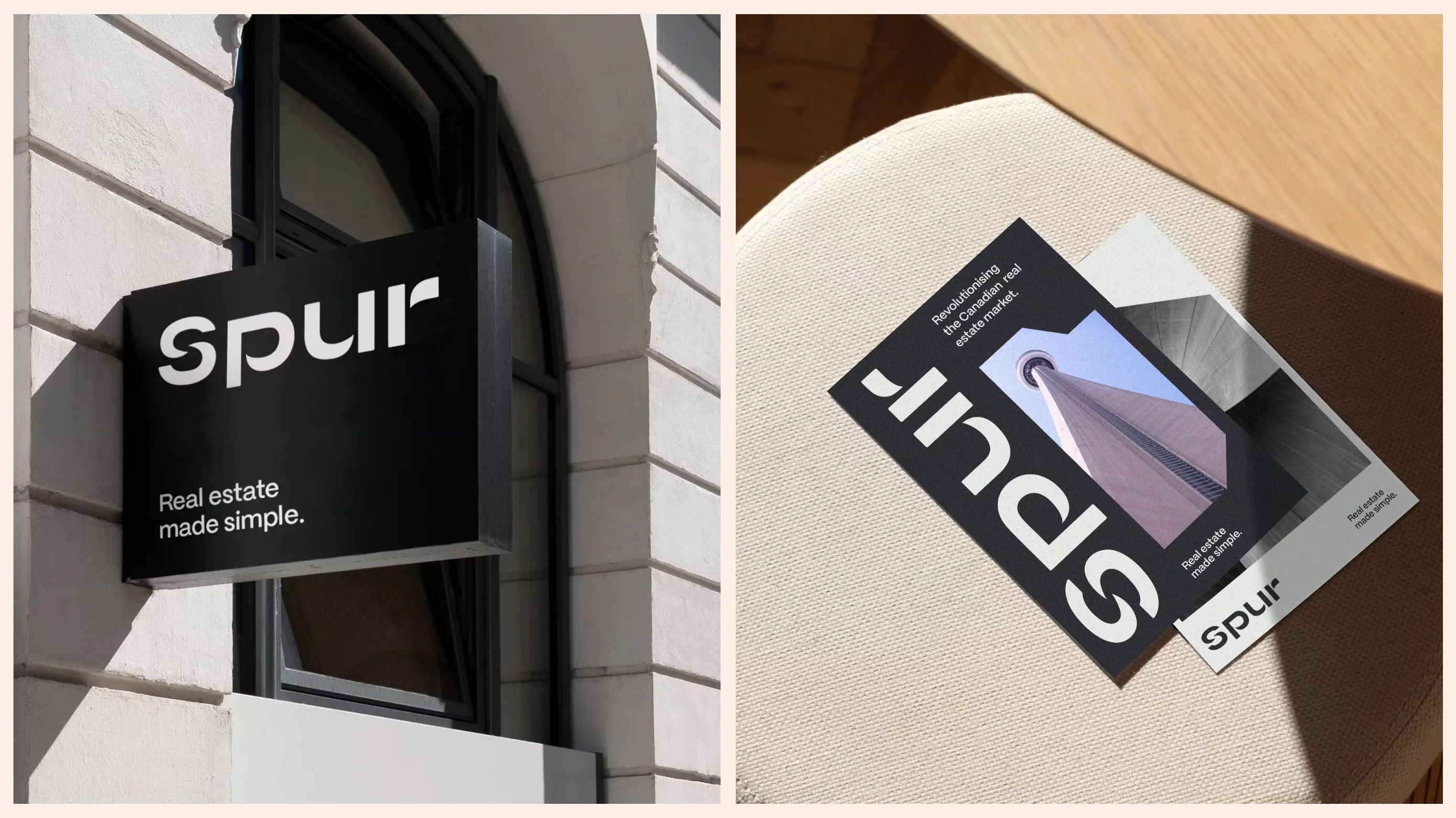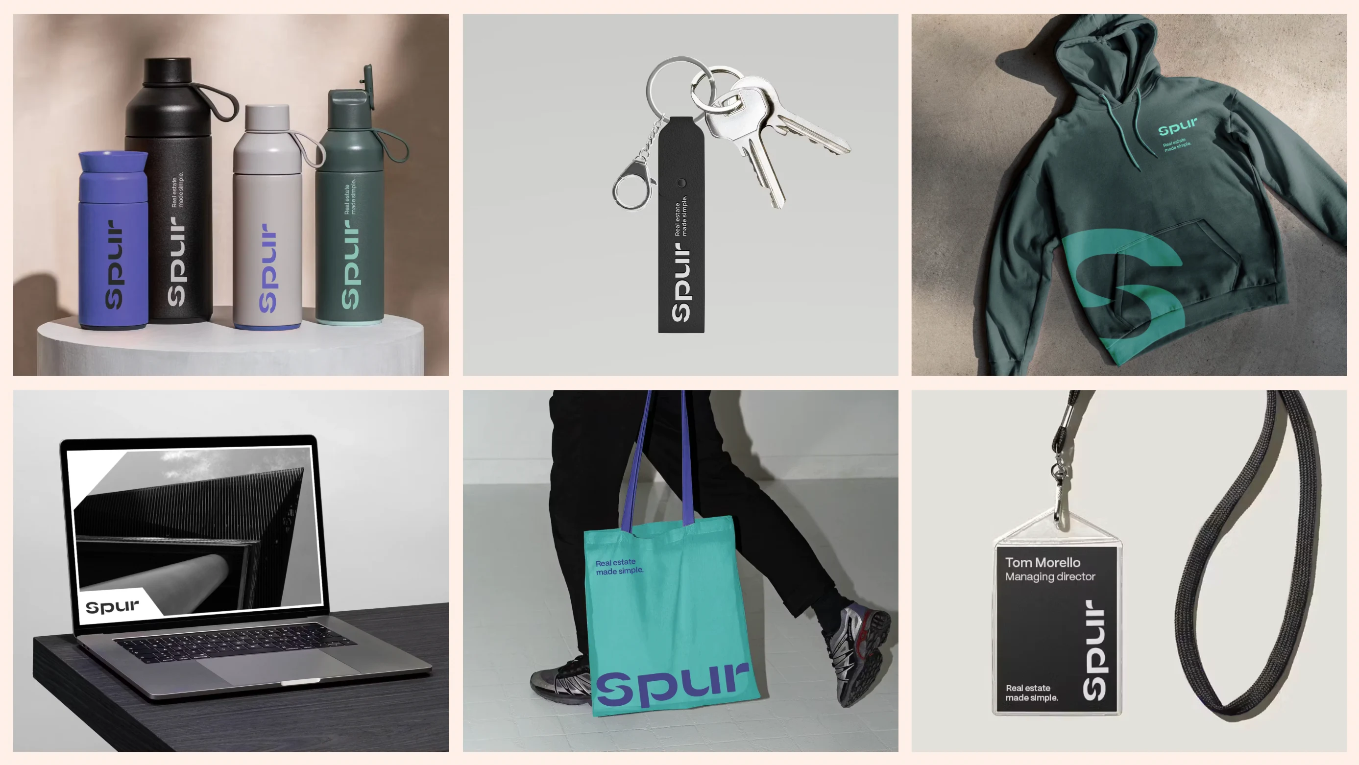 The visual identity centres around the concept of ‘home’, expressed through abstract architectural shapes that serve as flexible containers for text and imagery. The custom logotype features an ‘S’ that symbolises the connections and journeys Spur helps facilitate. The overall visual language feels modern and tech-driven, while the use of neutral tones and bold, immersive photography lends a sense of credibility, relevance, and forward-thinking energy.