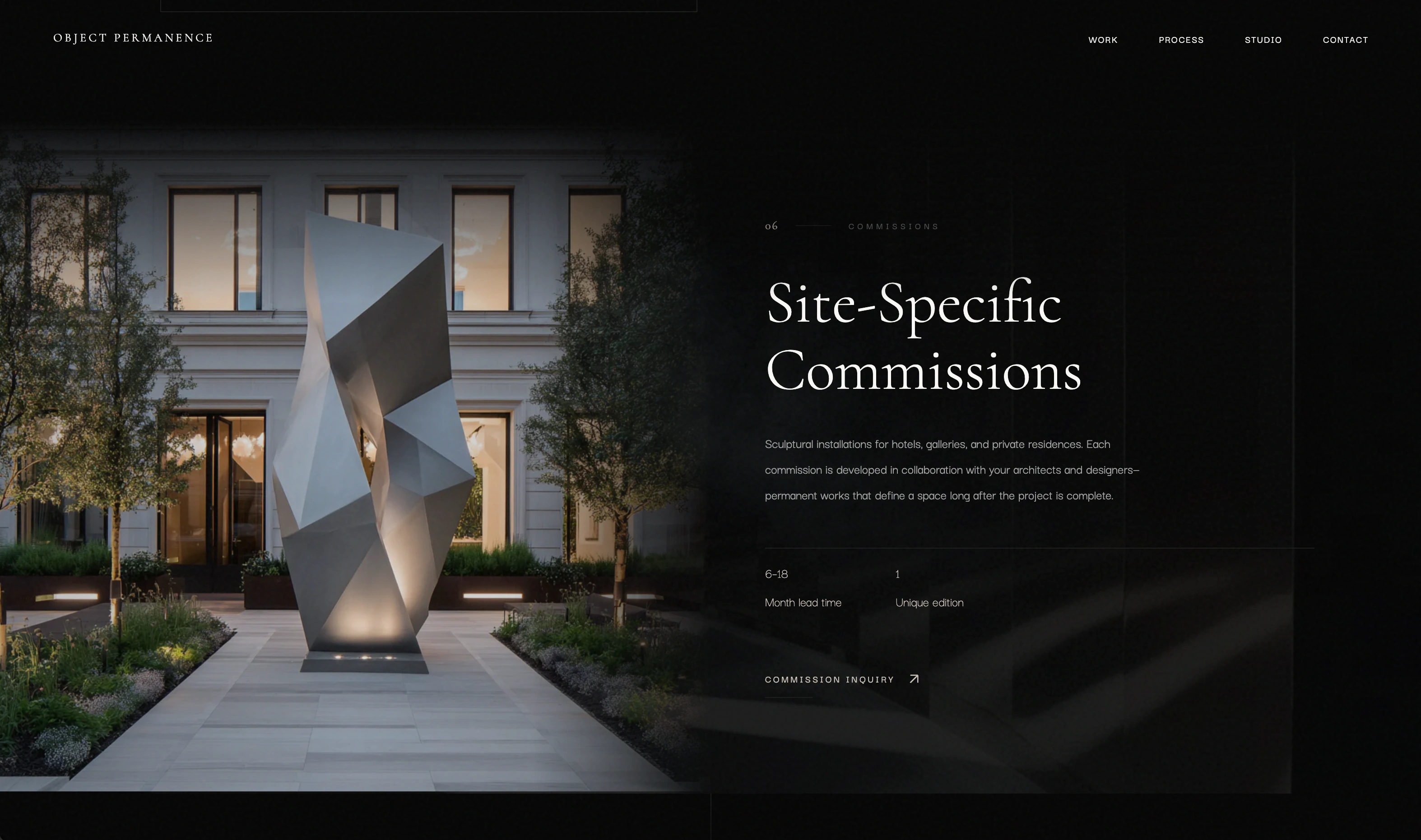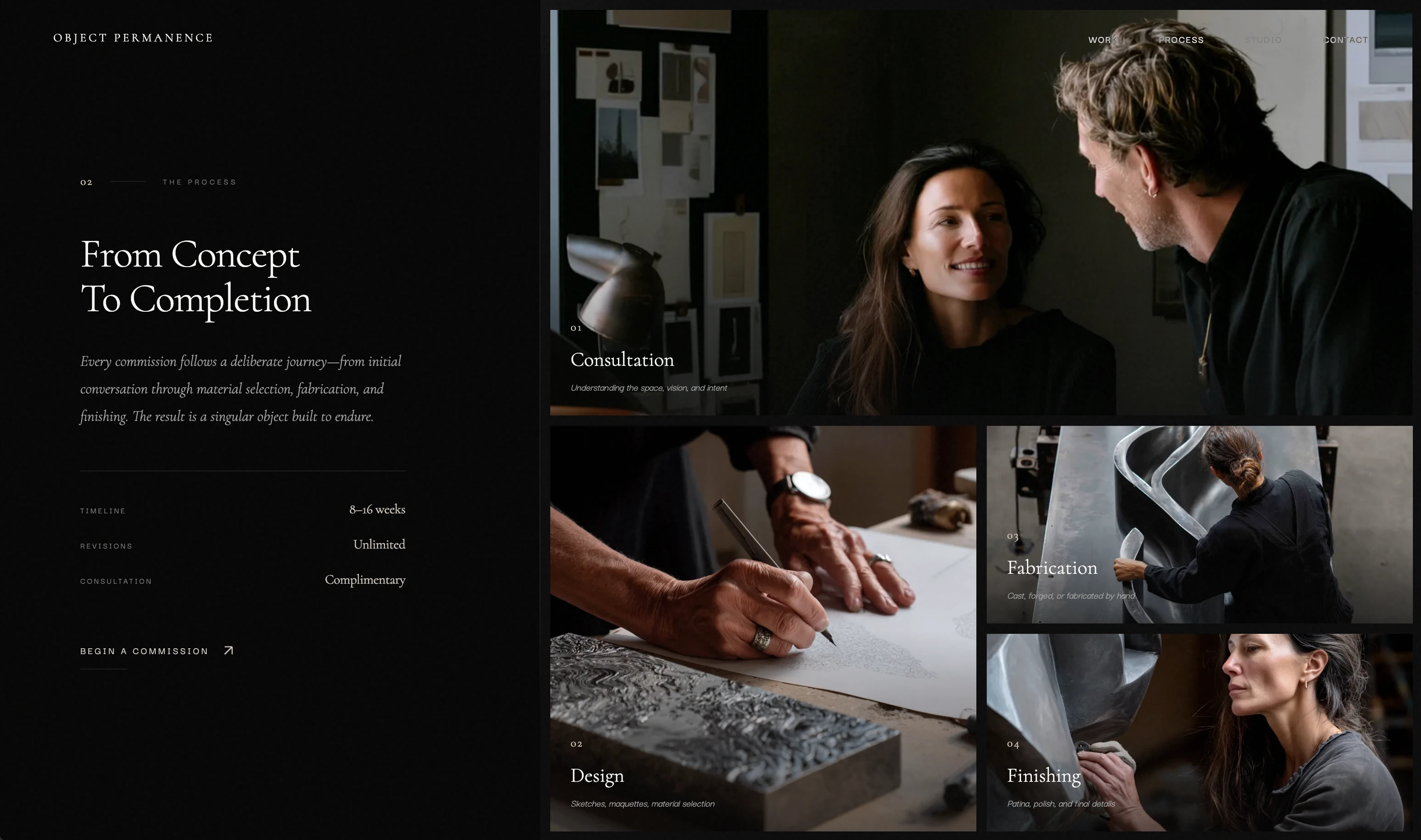 Object Permanence isn't a real studio. It's a design exercise: something that felt like the work it represents—unhurried, confident, a little severe.