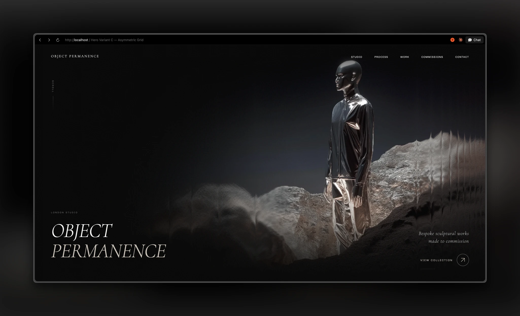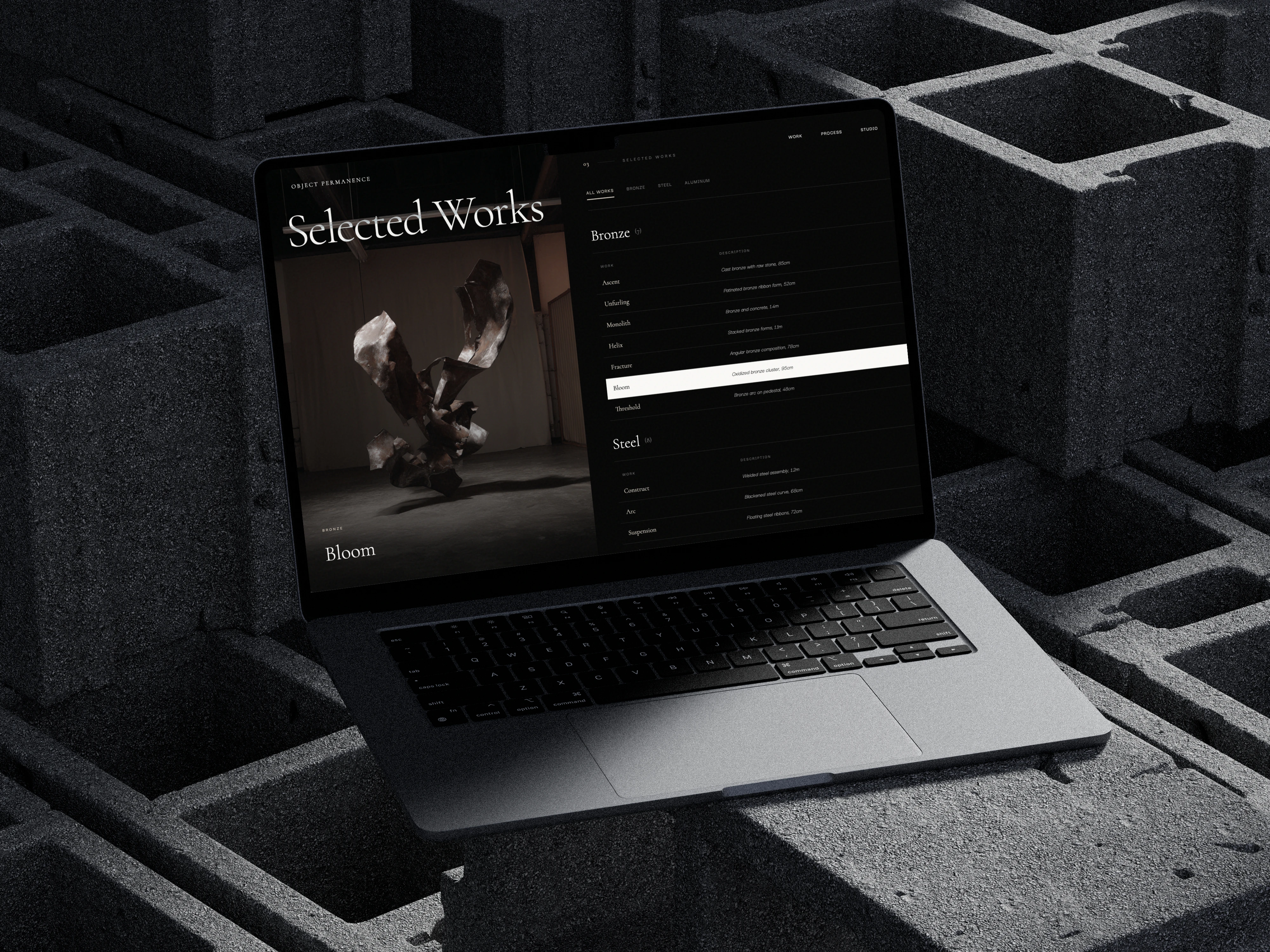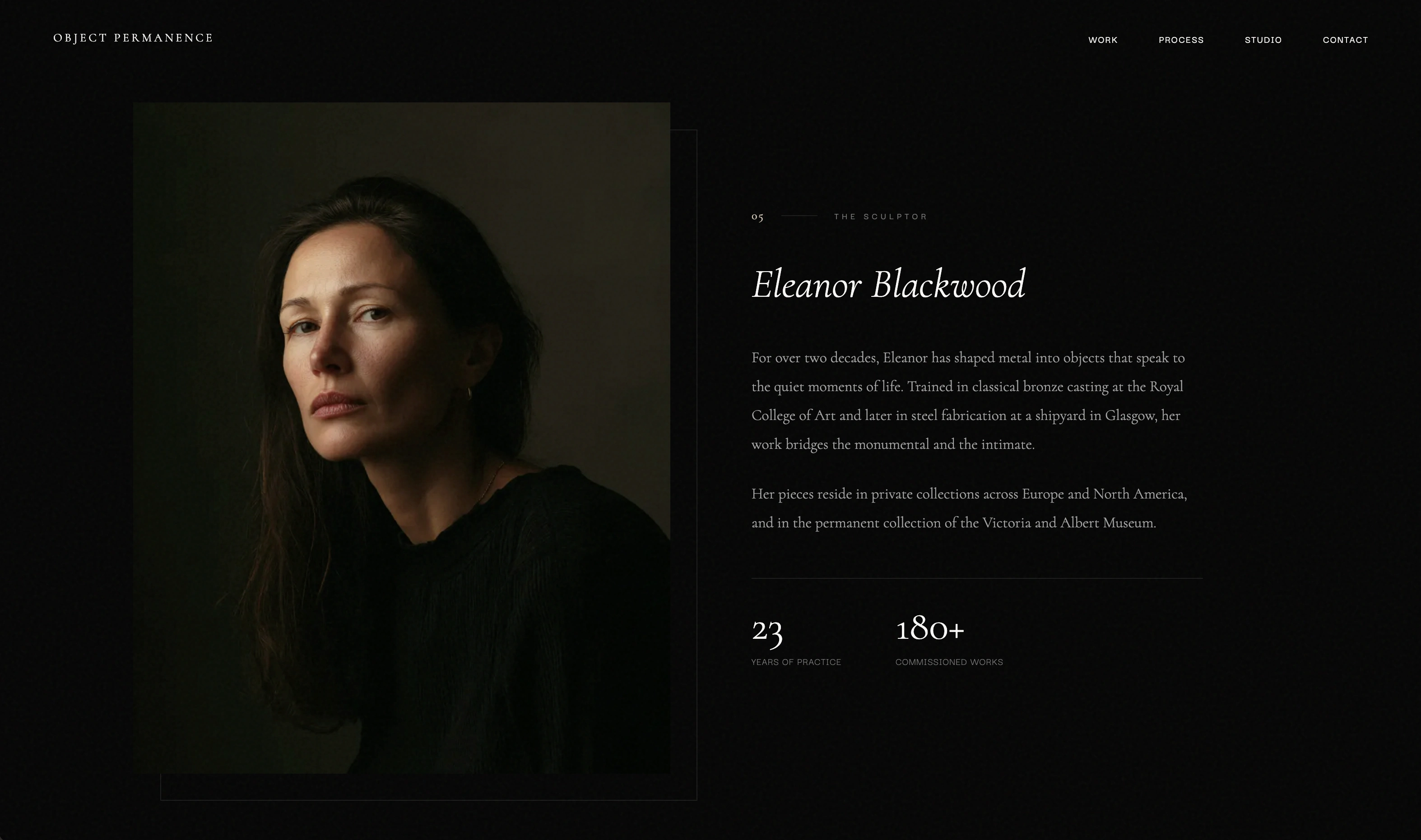 A dark, premium portfolio for a fictional sculptor—exploring typography, texture, and slow, deliberate interactions