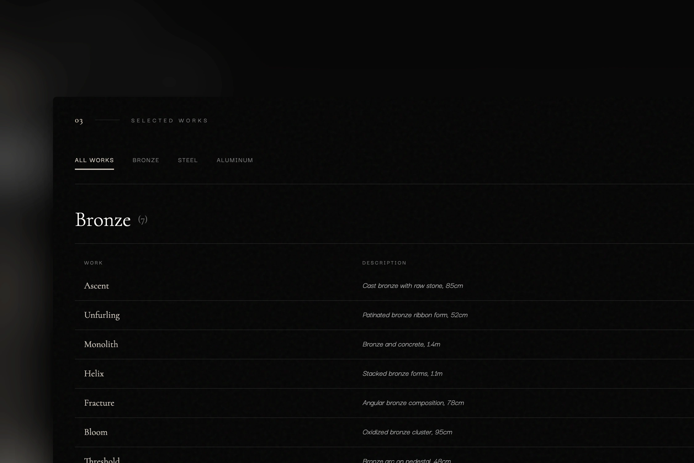 No hero shots, no grid layouts. The restraint says: the work speaks for itself. Even the filter tabs—Bronze, Steel, Aluminum—are about materiality, not category. Everything reinforces what this imaginary person cares about.