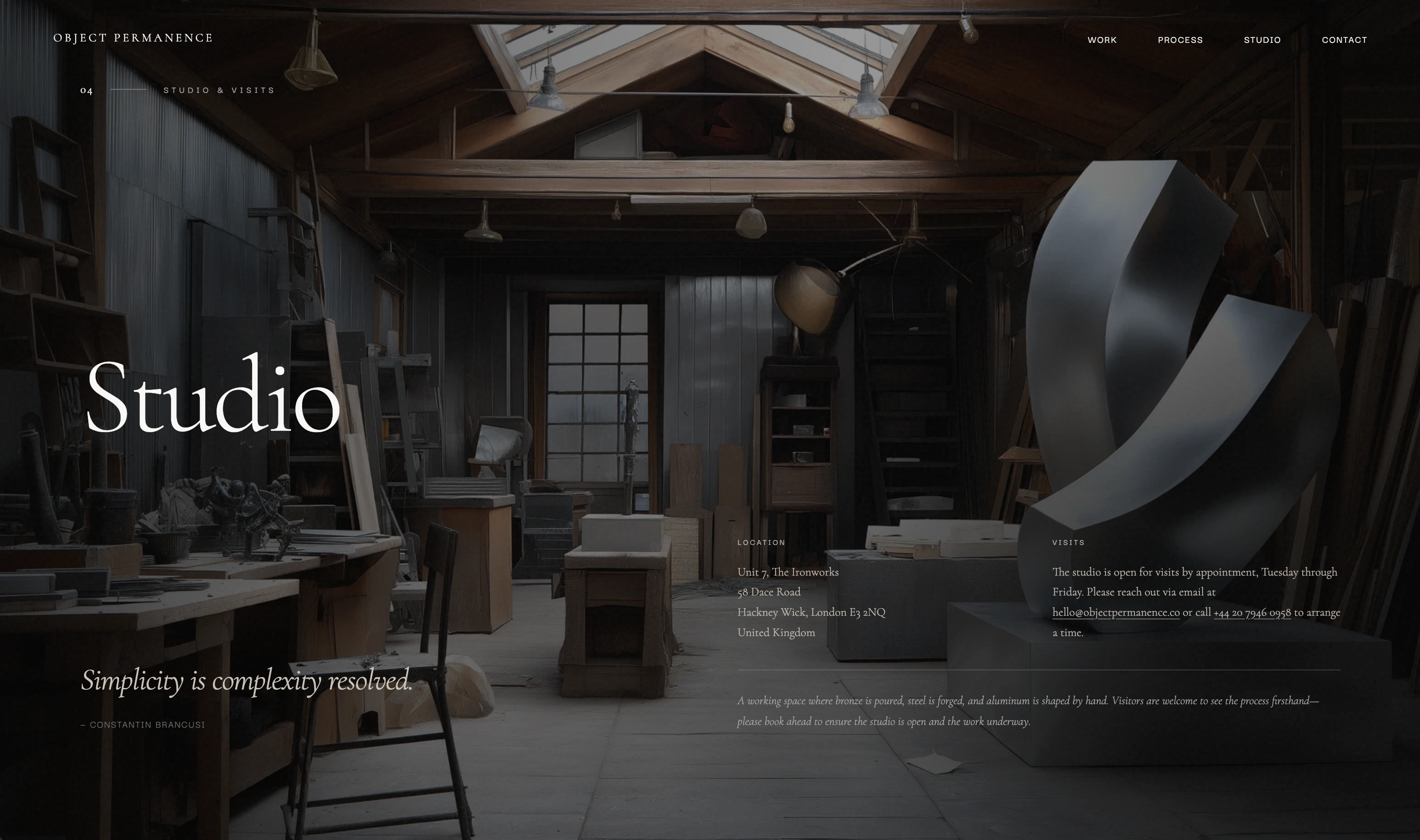 The site includes a studio address in Hackney Wick, a Brancusi quote, a sculptor named Eleanor Blackwood with pieces in the V&A. None of it is real, but it feels real—and that's the point. Good brand design makes you believe, even for a moment.