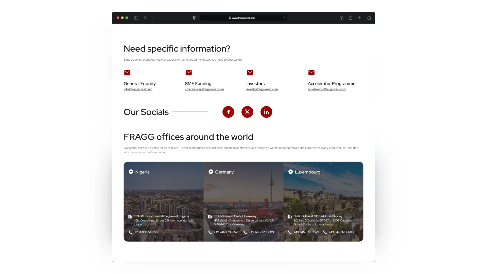 FRAGG Invest required a platform to represent their commitment to impact investing and cater to their diverse audience of corporate investors, SMEs, and stakeholders across three regions: Nigeria, Germany, and Luxembourg. The pltaform needed to reflect FRAGG’s values, streamline user engagement, and align with their global operations.