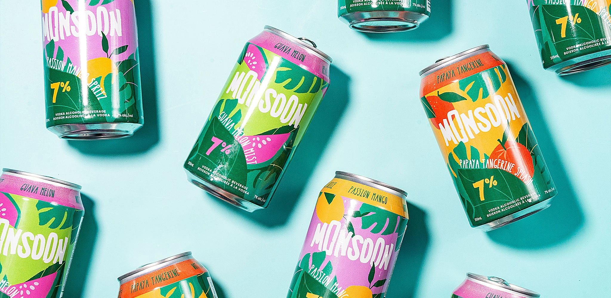 Tropical alcoholic beverage. Created retro tiki-inspired packaging with hand-drawn illustrations emphasizing higher alcohol content and natural ingredients.
