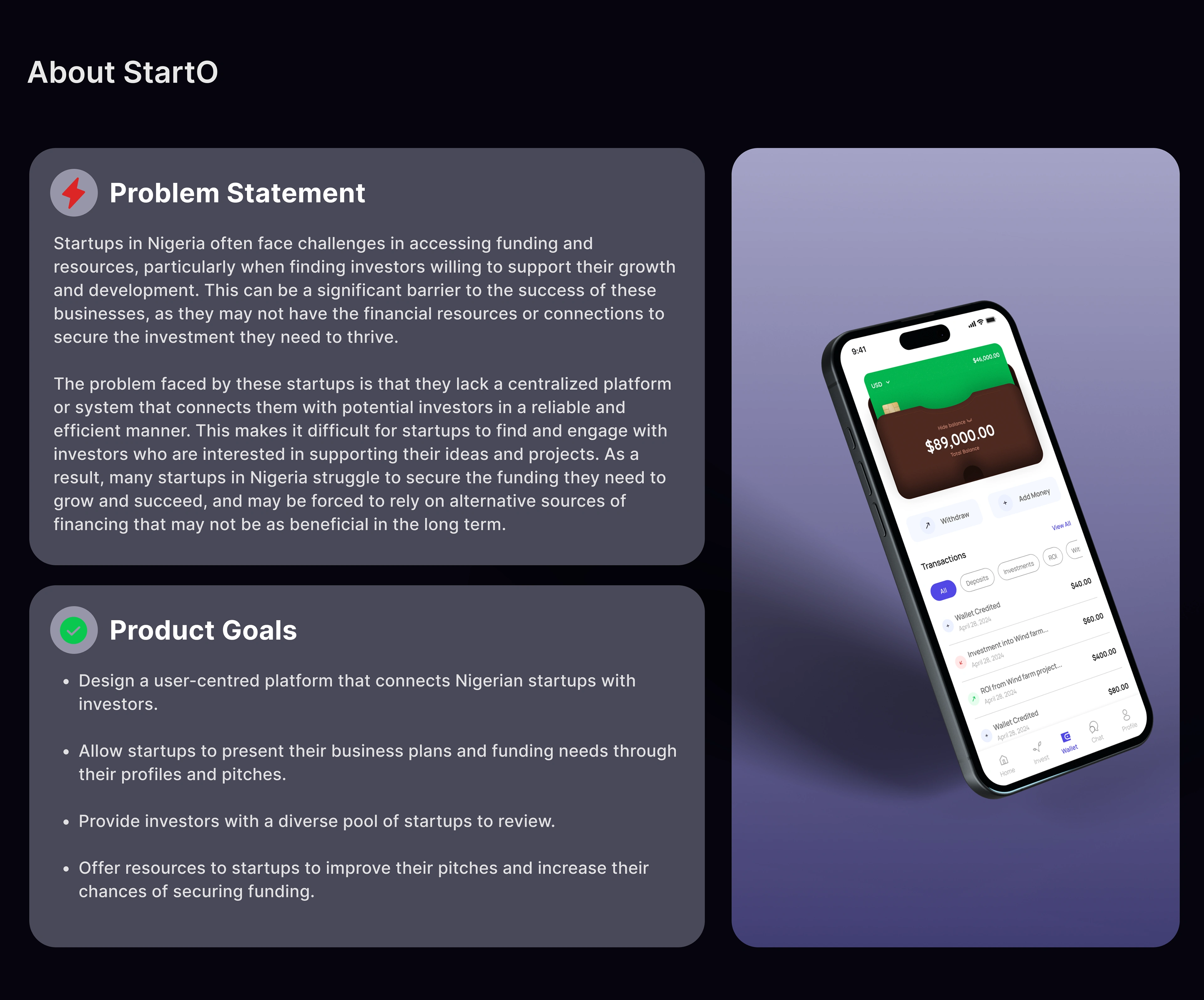 Designed the StartO mobile app, creating an intuitive experience that helps startups manage resources, track growth, and connect with investors.
