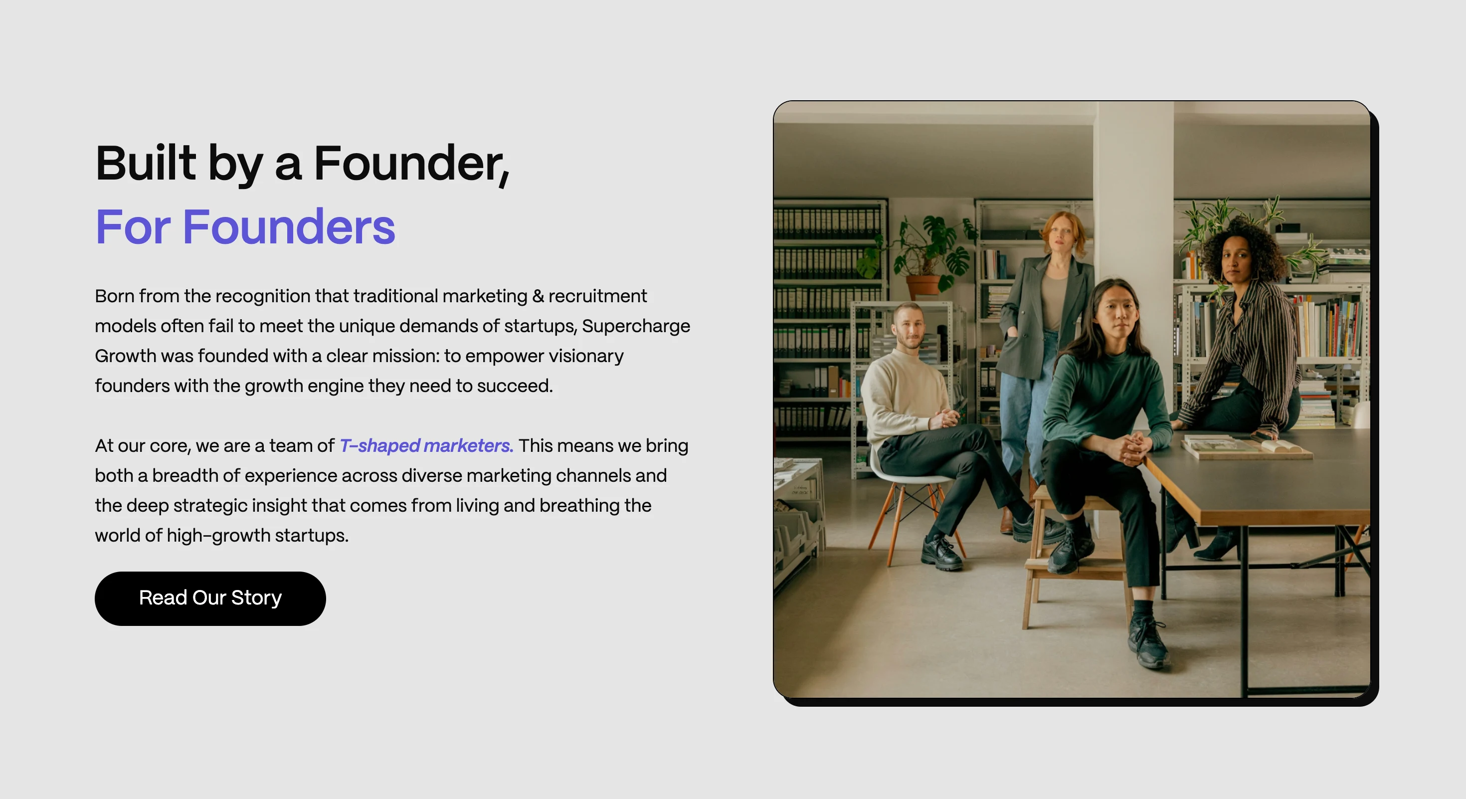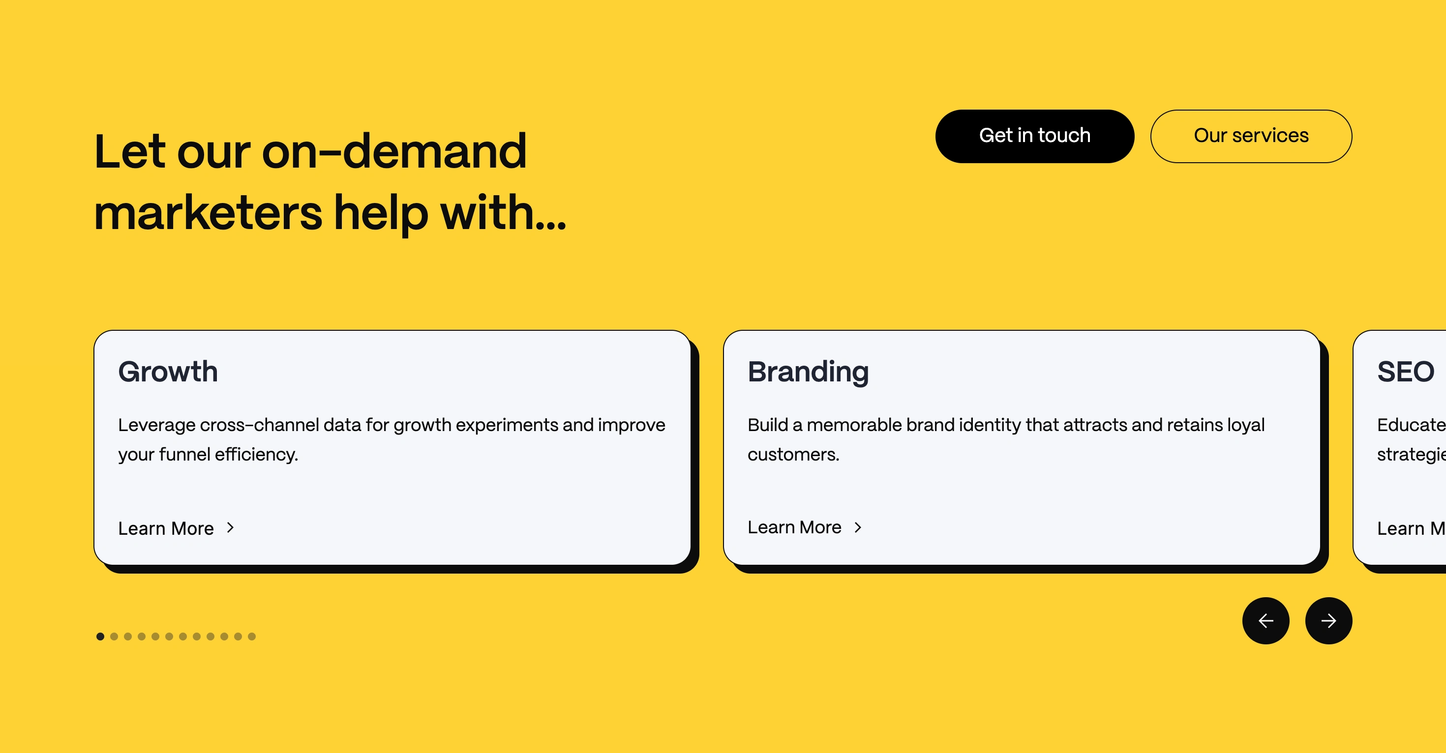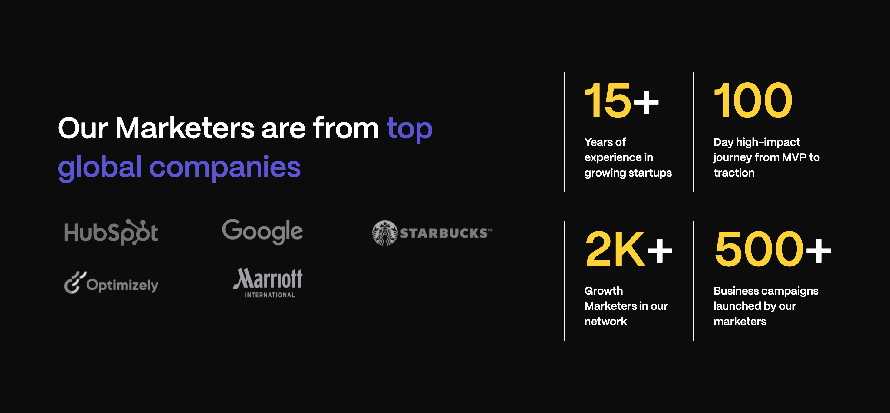 Services grid — “Let our on-demand marketers help with...” section featuring 12 service cards (Growth, Branding, SEO, Social Media, Content, Paid Search, Paid Social, Outbound Marketing, Founder Branding, CMO, Graphic Designer, Email), each with a title, short description, and “Learn More” link to the contact page.