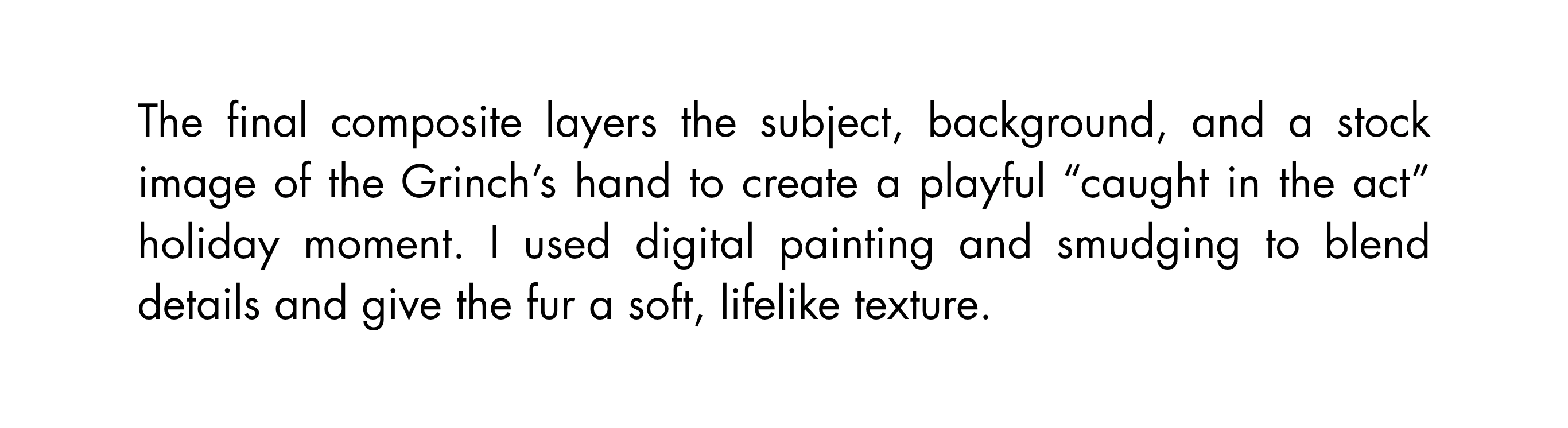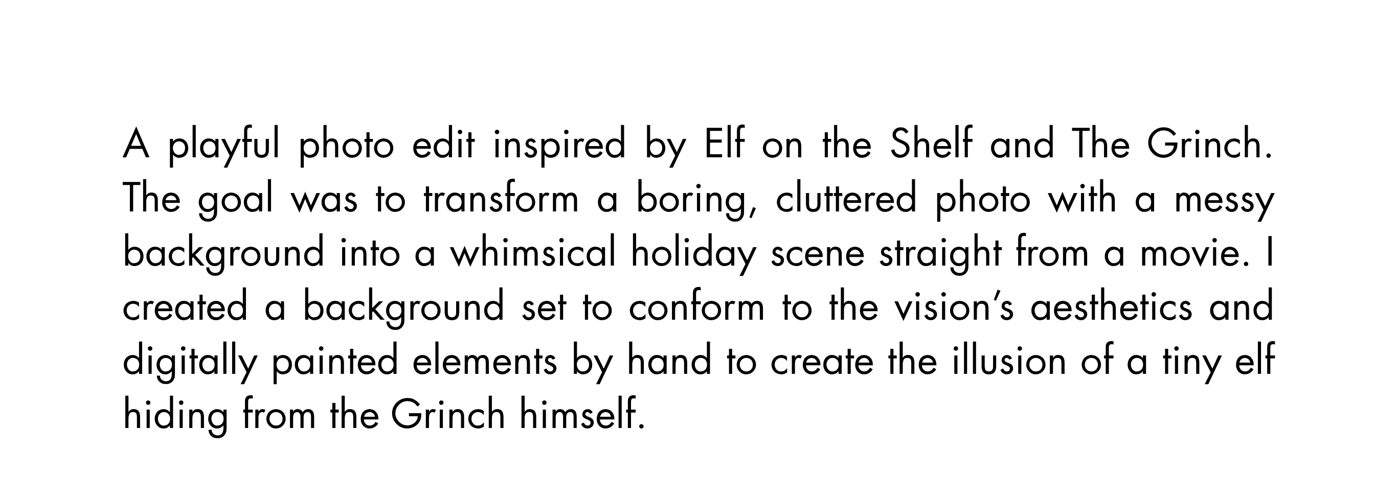 This project showcases my approach to creative photo editing and compositing. It blends photography and digital art to build a whimsical, cinematic holiday scene. The goal was to transform a simple portrait into a playful “Elf on the Shelf” moment filled with detail, depth, and festive imagination. Each element was layered and blended to bring the story to life.