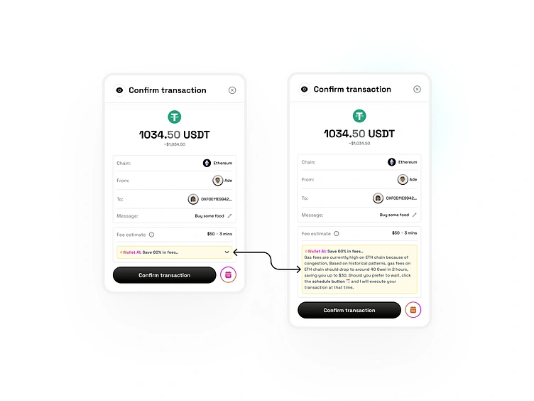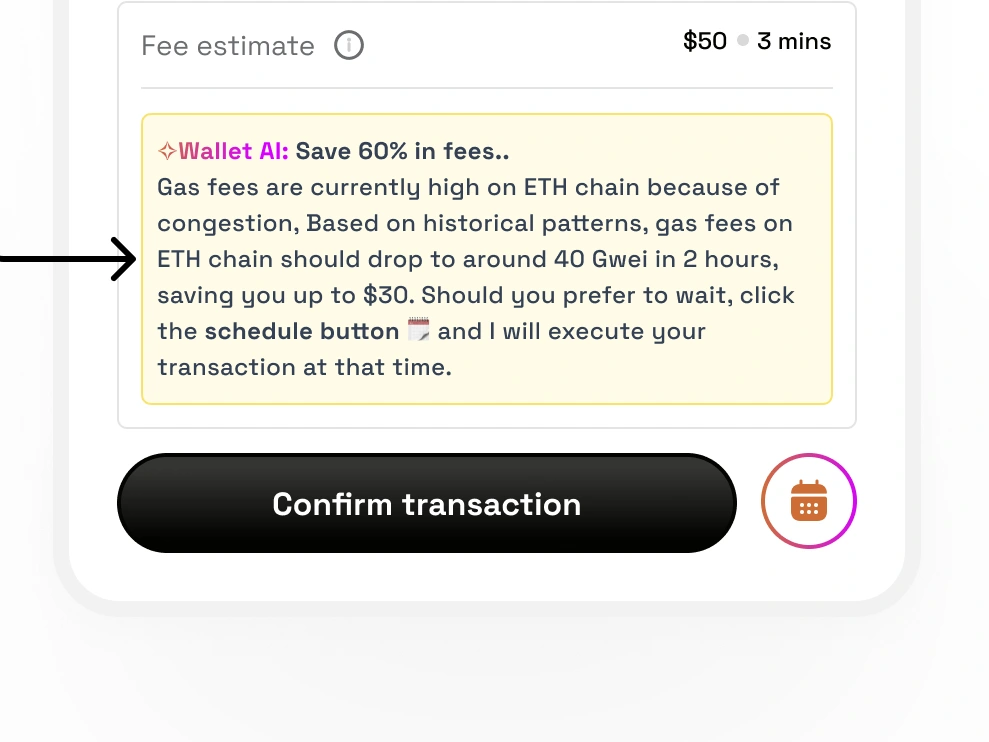 Using AI to help users avoid paying high gas fees where necessary, might be on a swap, transfer or any other transaction. AI alerts users, suggesting a better time to execute the transaction with lower gas fees. Using the schedule action allows the AI automatically schedules the transaction for a later time when fees are lower.