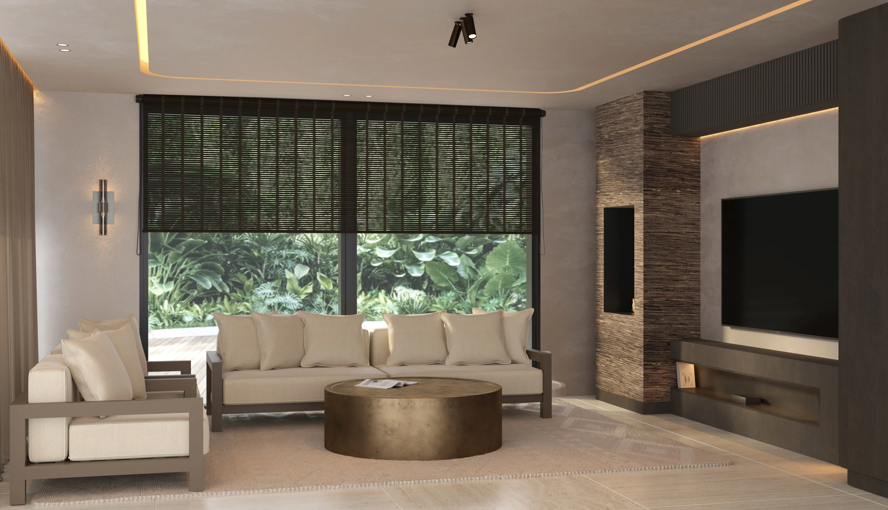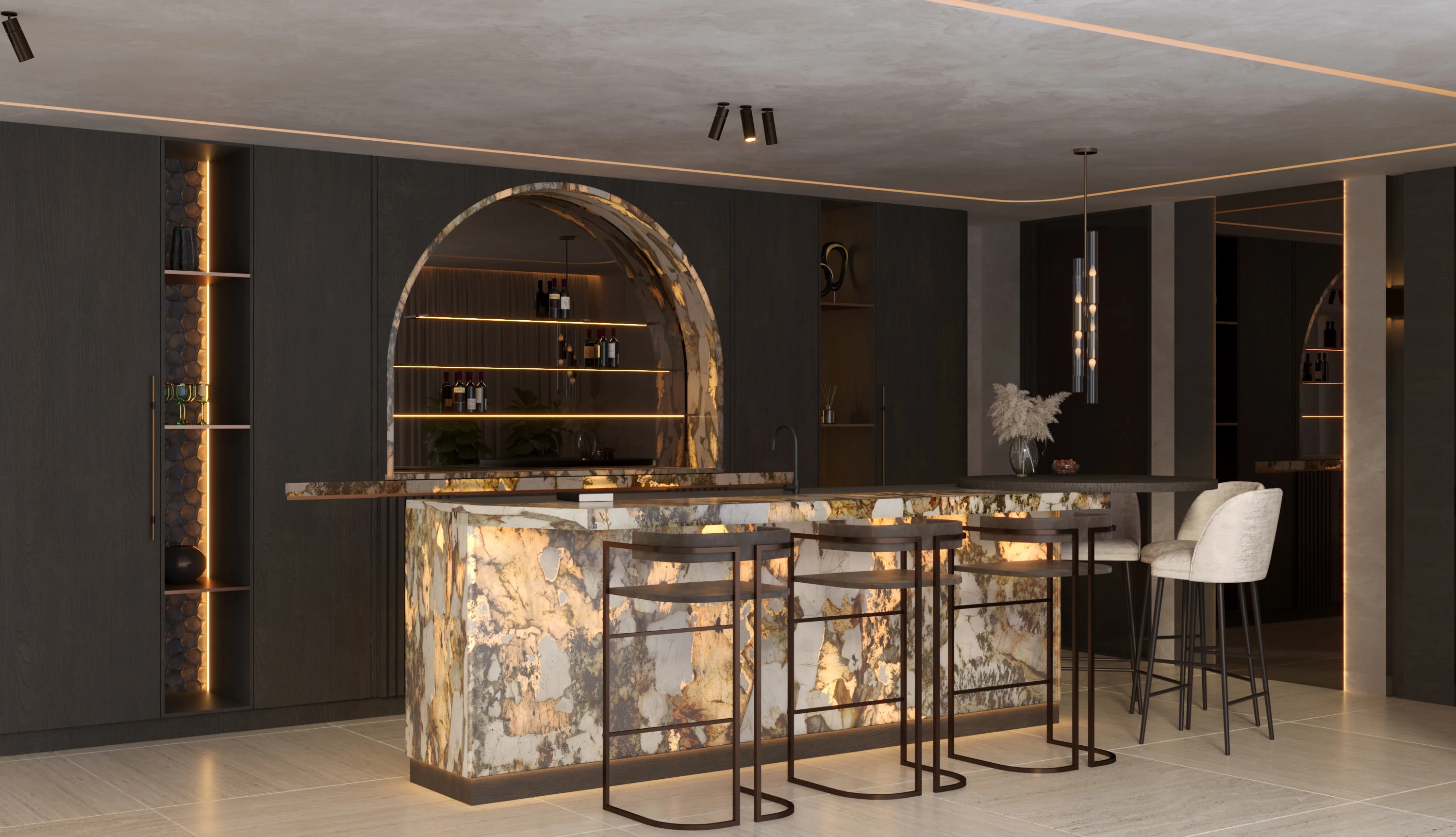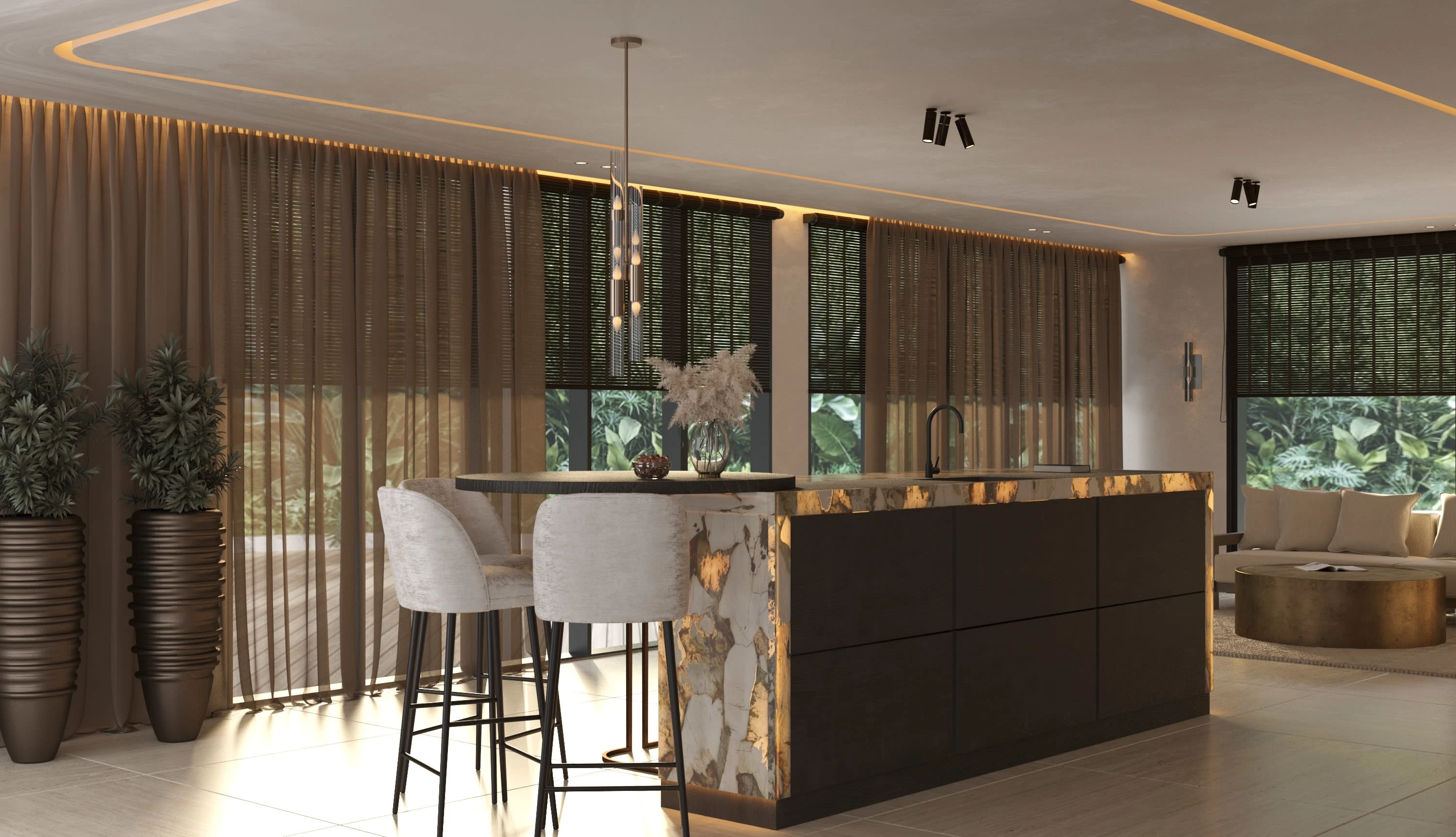 This 3D visualization shows a modern luxury pool house interior, blending natural textures with warm lighting to create a sophisticated and relaxing atmosphere.