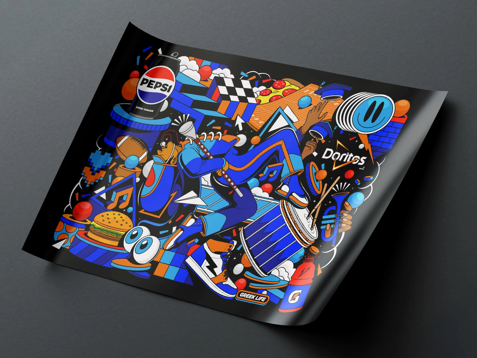I created a vibrant 2D illustration for PepsiCo Multicultural, celebrating HBCU culture for their HBCU Takeover Tour with Doritos. This key visual highlighted seven colleges during their homecoming celebrations, bringing energy, spirit, and pride to the campaign!