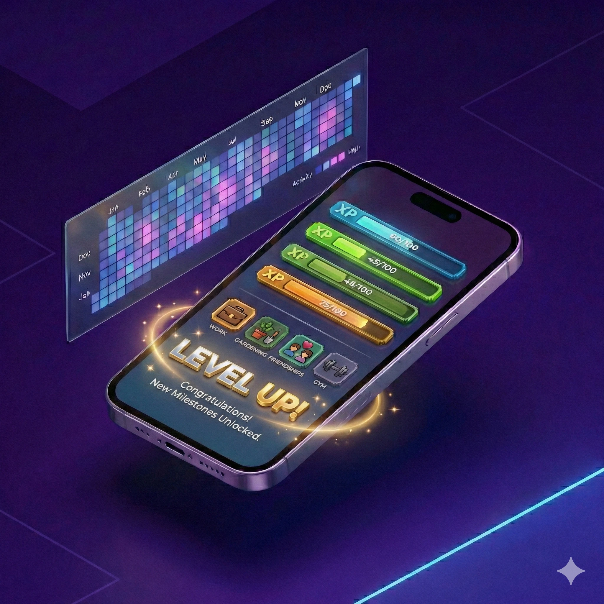 RPG Visuals: To drive the "game" feel, the UI includes dedicated XP bars for each attribute and satisfying level-up animations that provide immediate positive reinforcement.