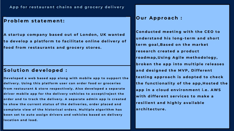 Developed a web based app along with mobile app to support the delivery. Using this platform user can order food or groceries from restaurant & store.