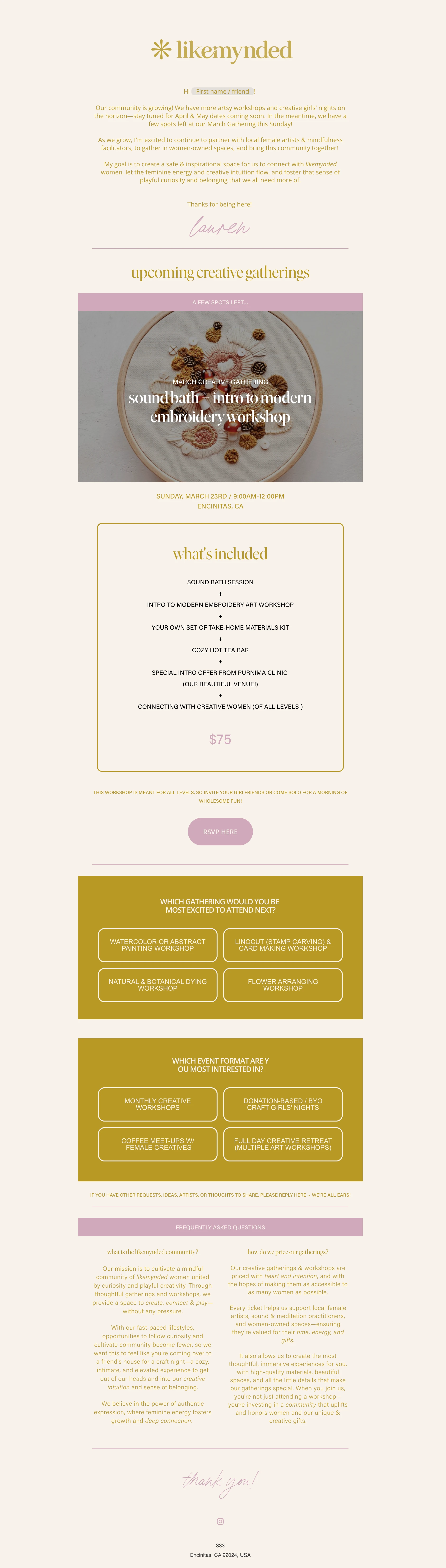 I designed a monthly e-newsletter for a female creative community in Flodesk.