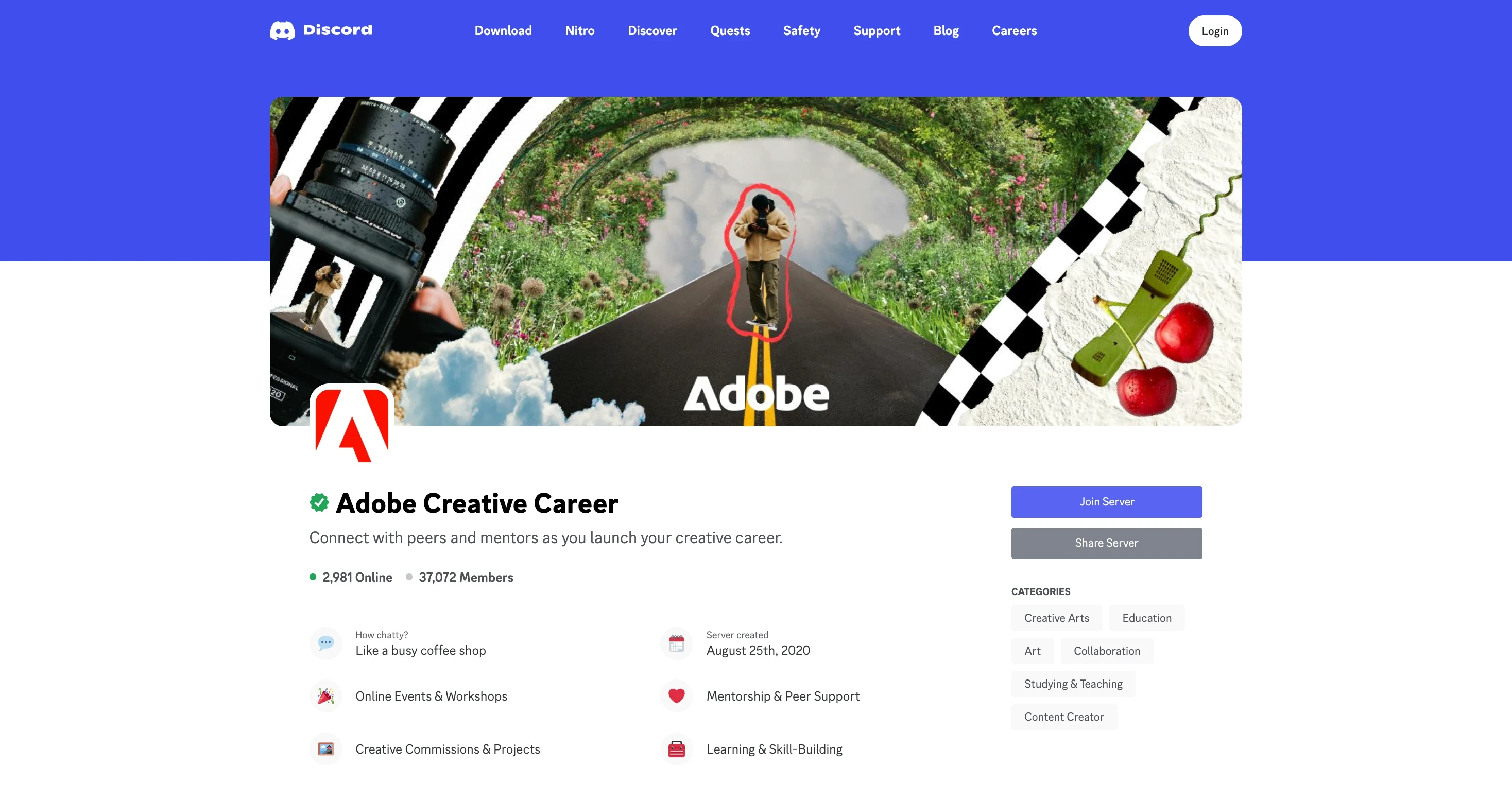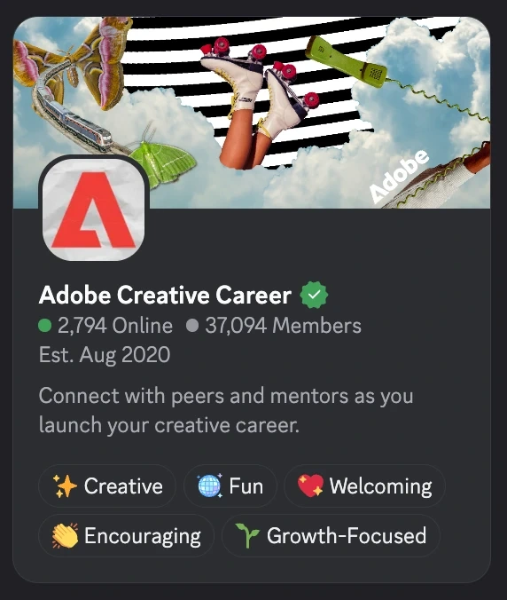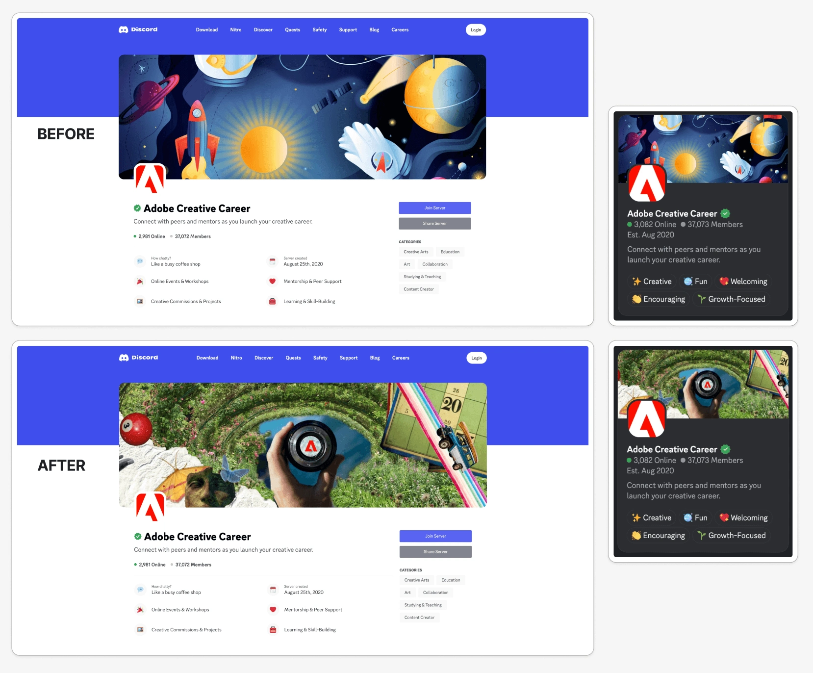 I designed a series of banners for the Adobe 'Creative Career' Discord server, home to over 36,000 creative professionals. My goal was to evolve their aesthetic to be more inclusive and forward-thinking, creating a set of three banners that would energize the space and welcome all members.