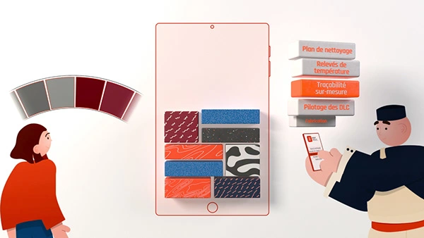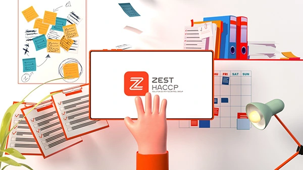 A motion graphics mixing 2D and 3D animation for Zest HACCP, an application for monitoring and simplifying a sanitary control plan using digital tools.
