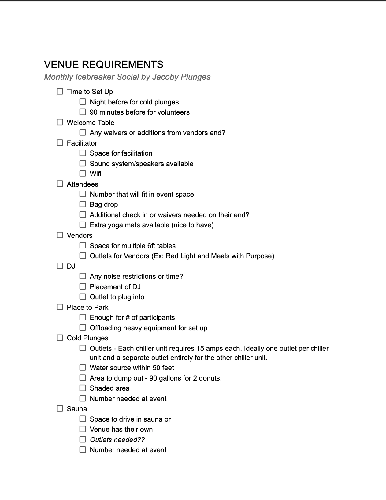 Based on the unique needs of this client (ex: two 15 amp electrical plugs outside for cold plunge chillers), created a venue walkthrough guide to re-use for each venue under consideration.