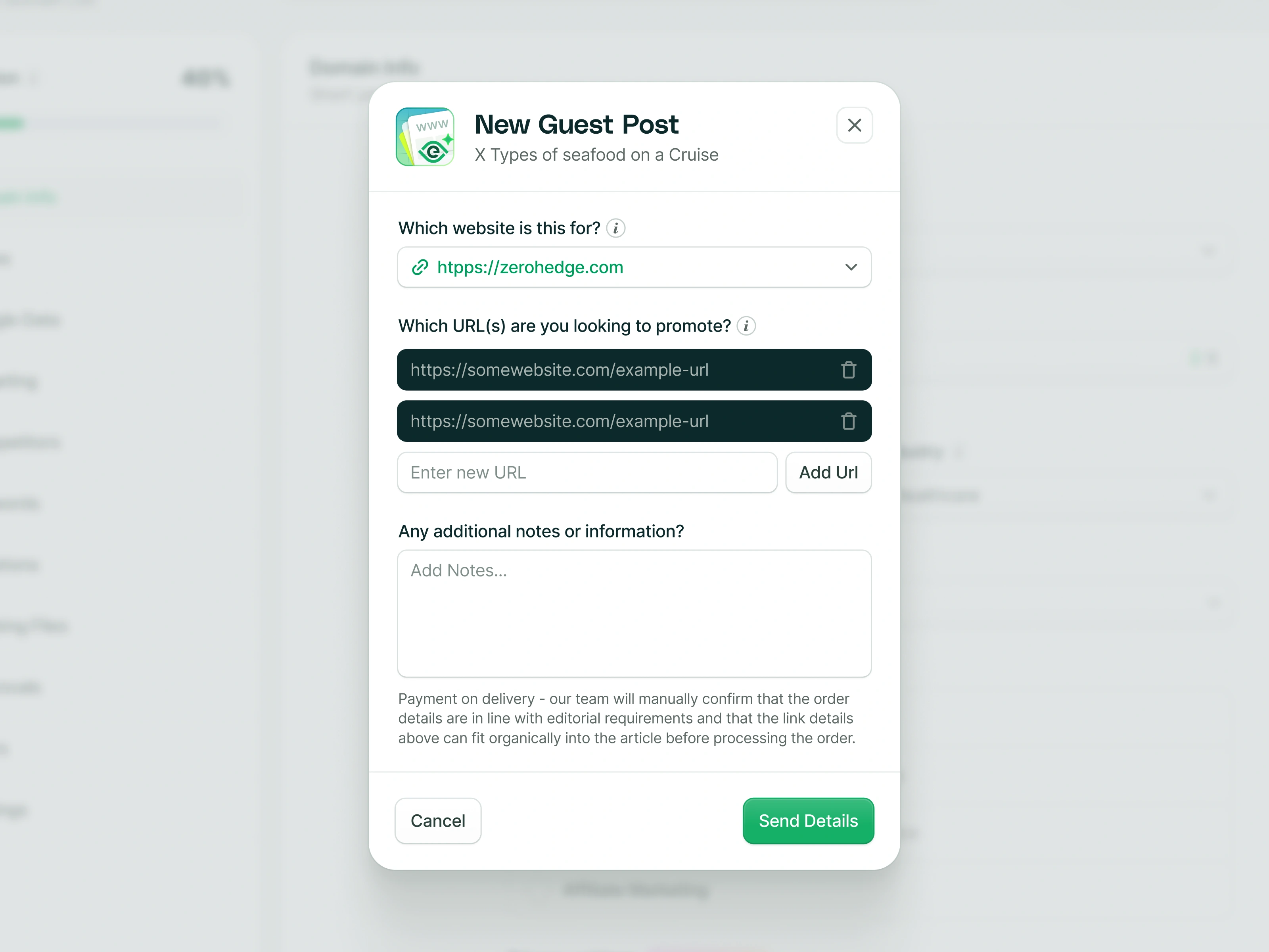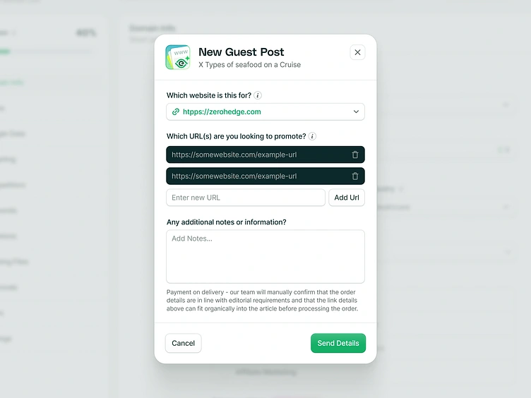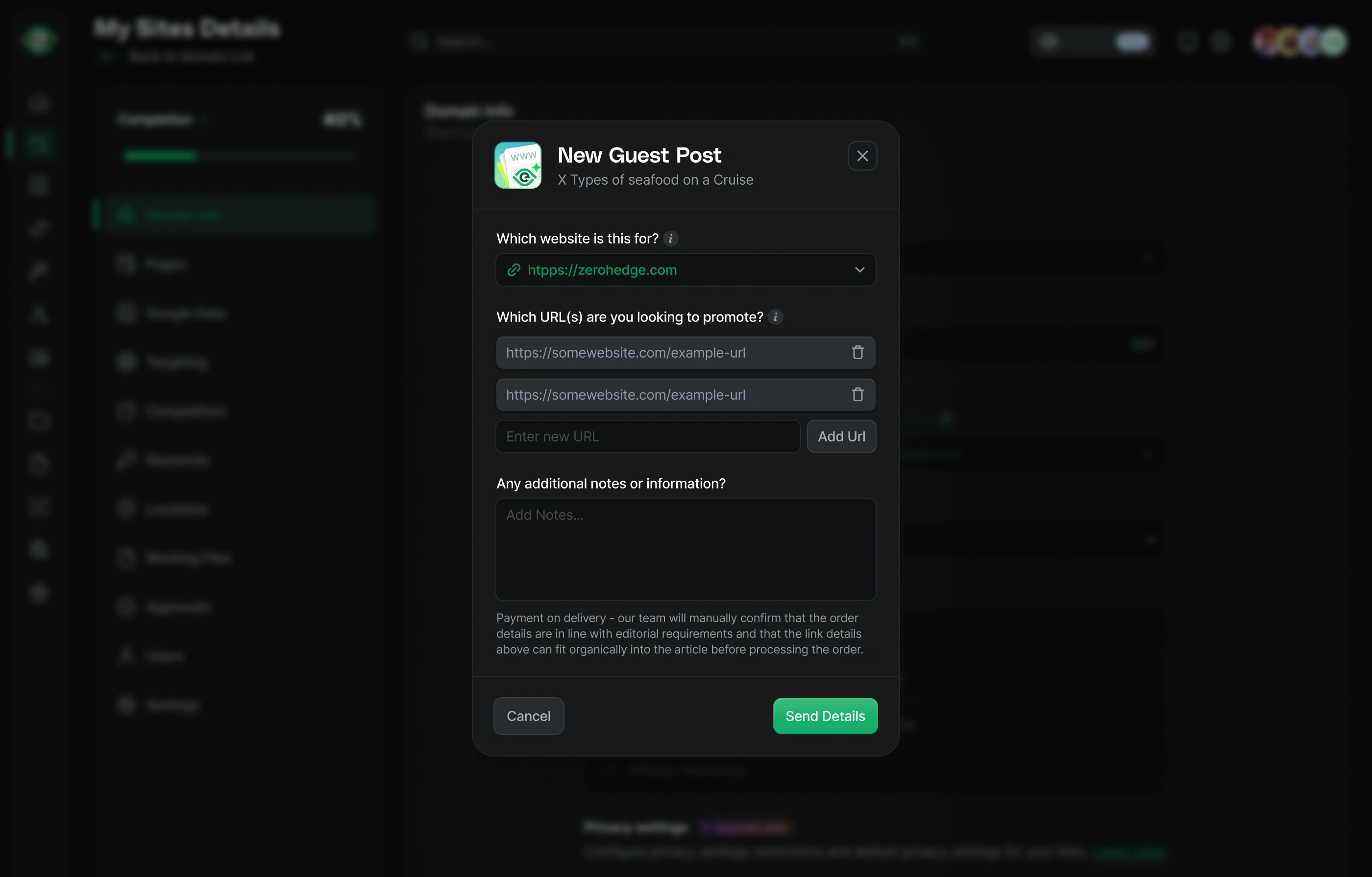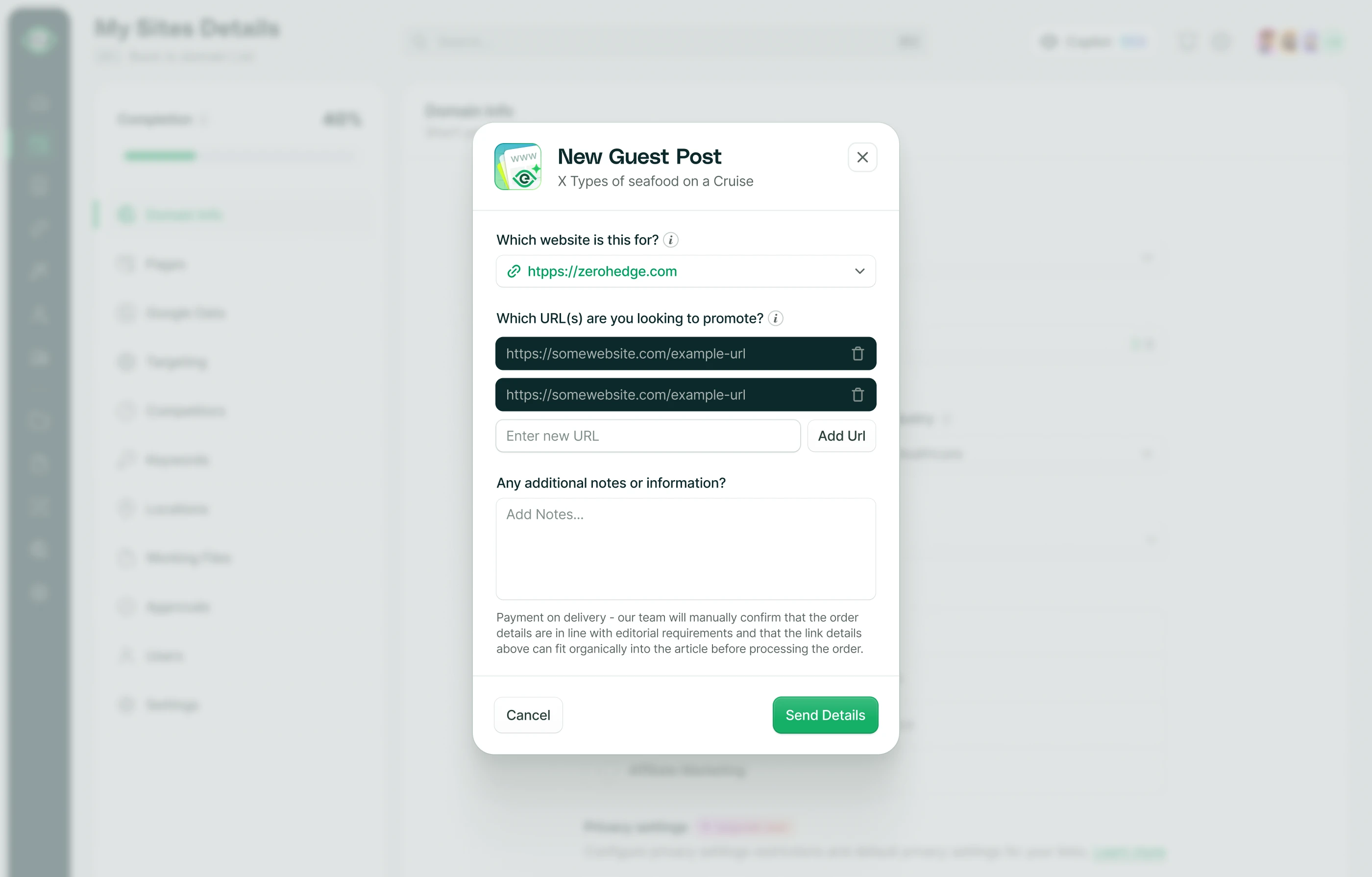 Order content modal for a SEO Platform