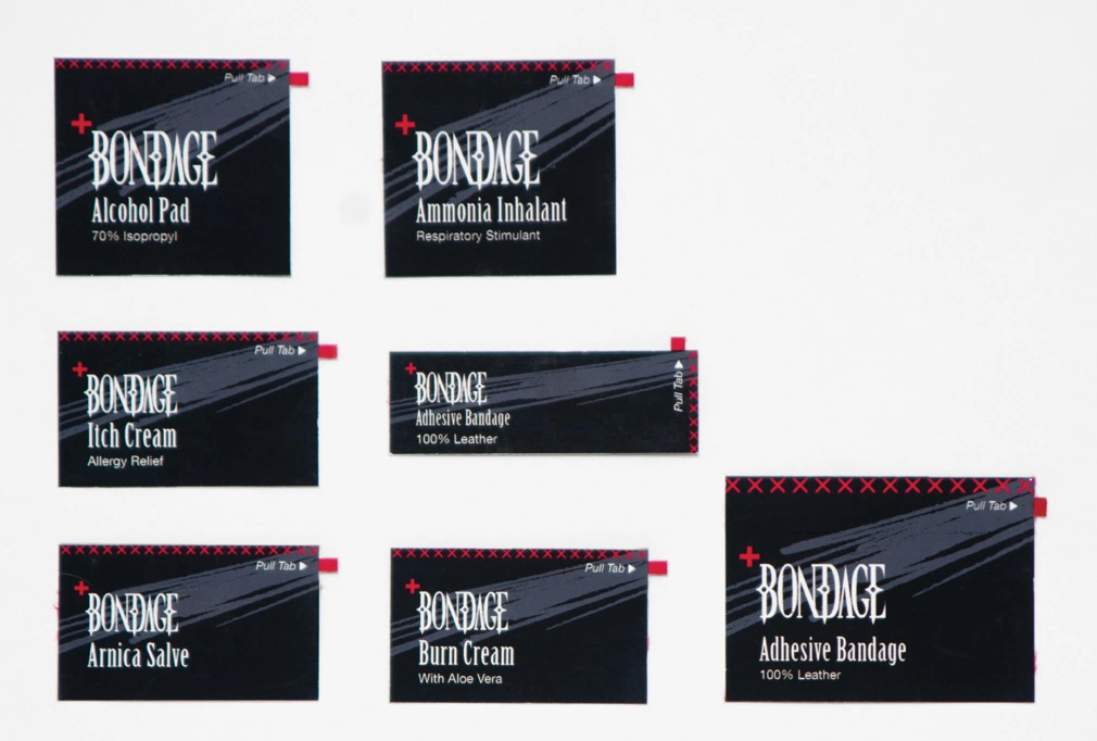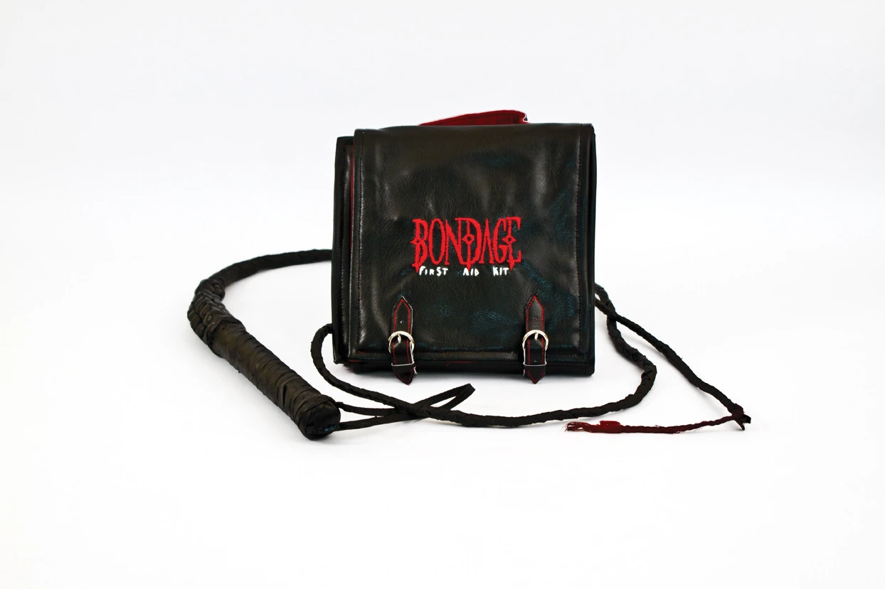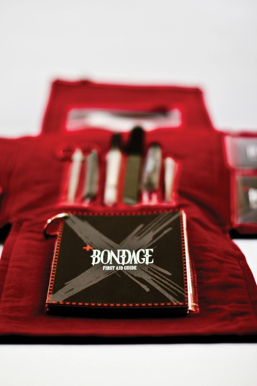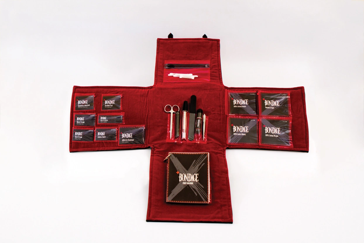 To fully immerse the user in the BDSM culture, the kit was designed using a tactile palette of materials: black leather, red and black velvet, metal studs, stitched typography, and durable plastics. The packaging rolls open like a traditional medical tool kit, forming the shape of a red cross when laid flat — symbolizing care, preparedness, and respect for consent and safety.