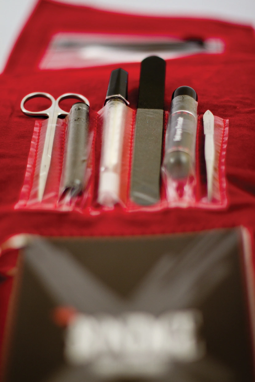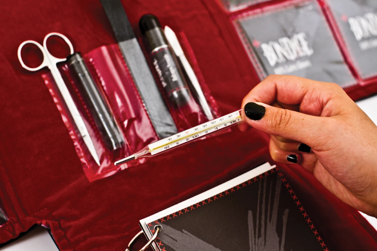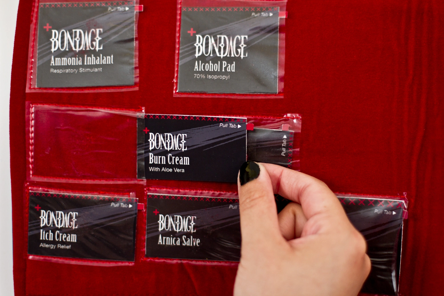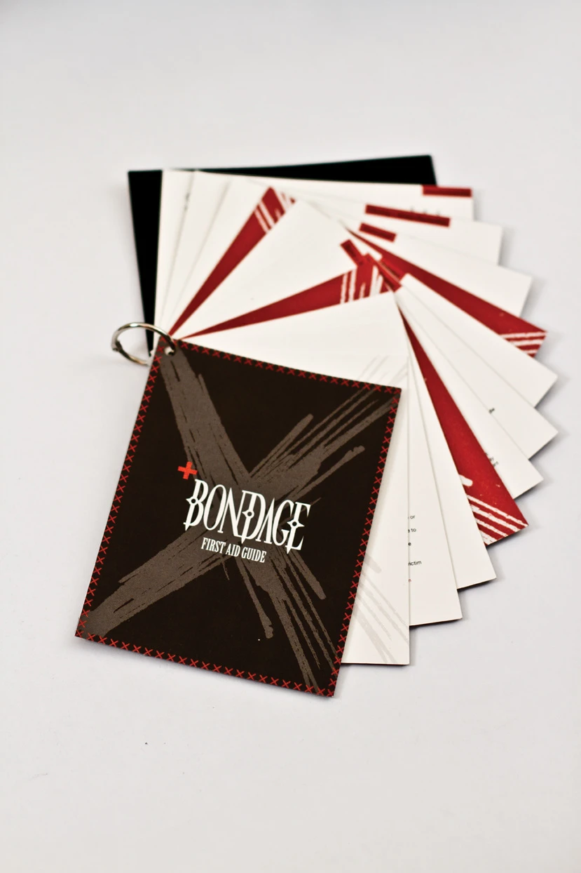 To fully immerse the user in the BDSM culture, the kit was designed using a tactile palette of materials: black leather, red and black velvet, metal studs, stitched typography, and durable plastics. The packaging rolls open like a traditional medical tool kit, forming the shape of a red cross when laid flat — symbolizing care, preparedness, and respect for consent and safety.
