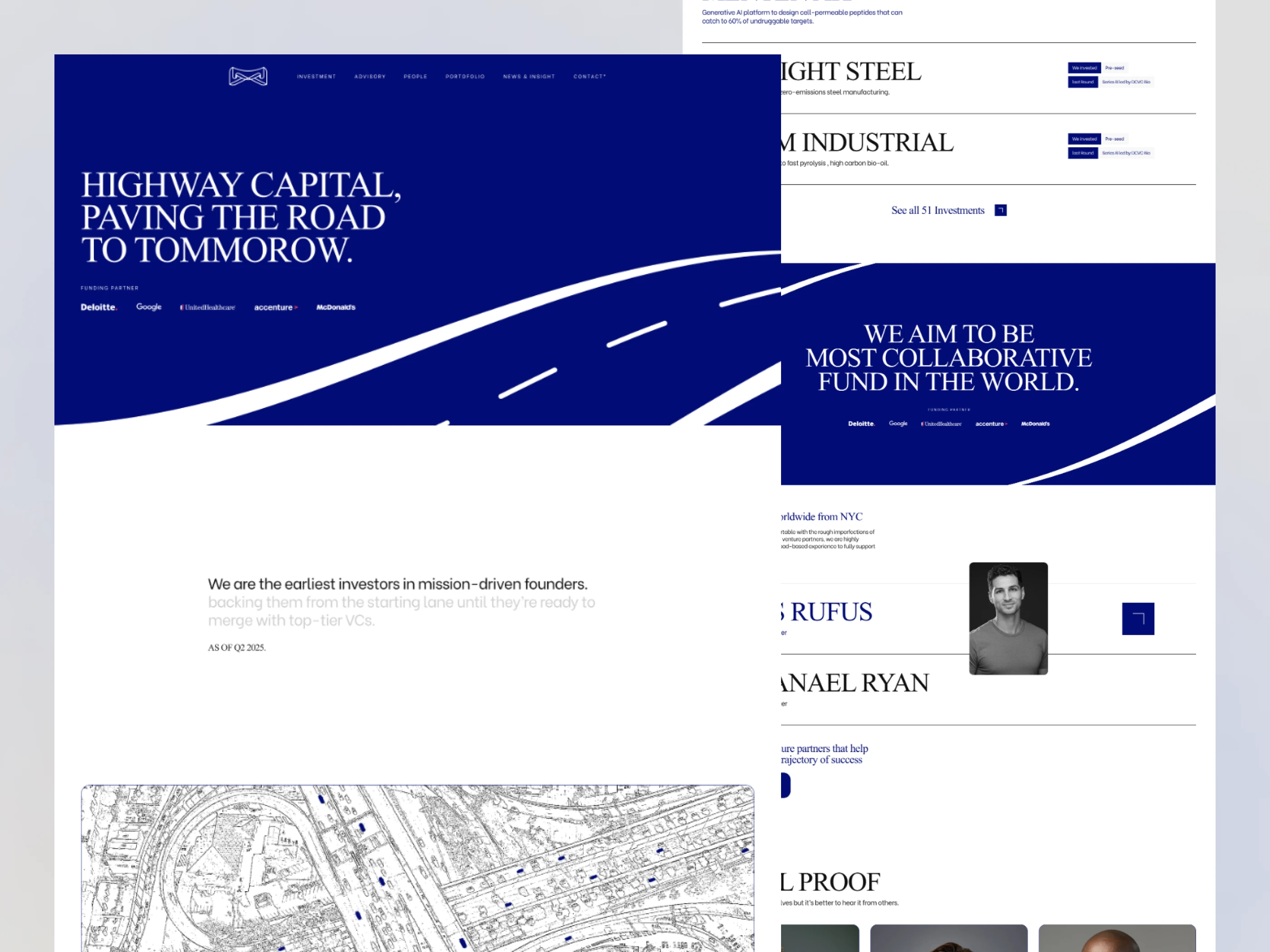 Designed this landing page to present a venture capital firm with a bold and modern identity, blending minimal layouts with strong typographic hierarchy. The highway-inspired visuals reinforce the brand’s narrative of paving the road to tomorrow, while crisp blue-and-white contrasts establish trust and authority. Clear investor highlights, partner showcases, and social proof sections are structured to communicate credibility and long-term vision, making the experience professional yet approachable.