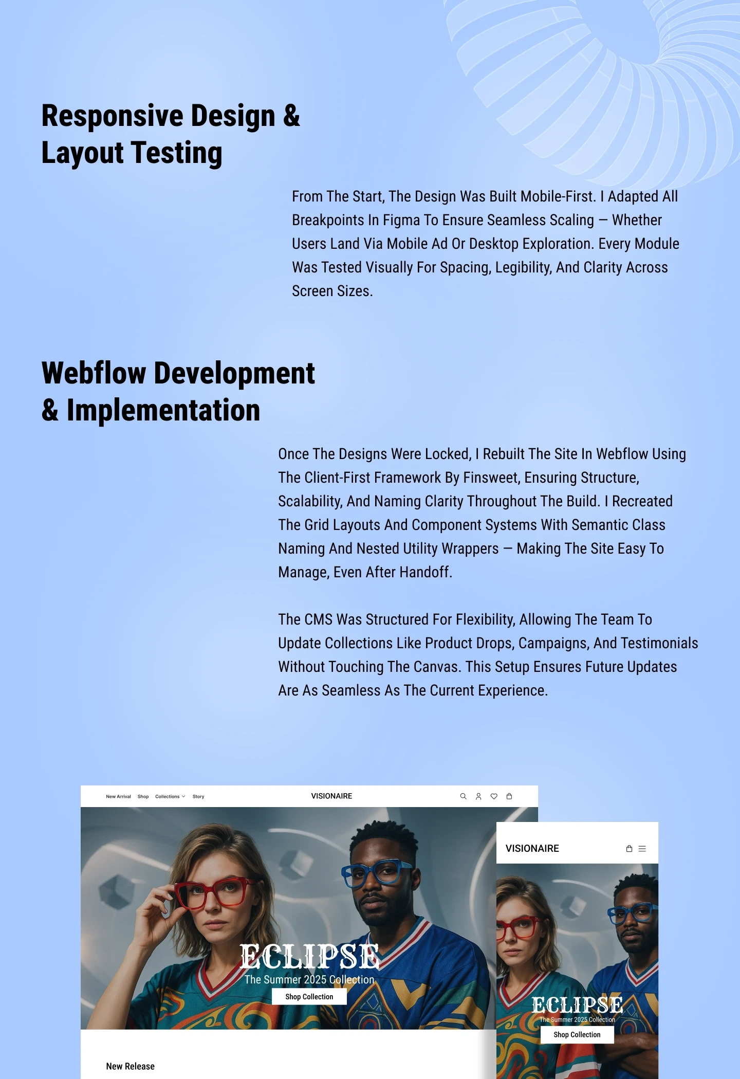 My role was to create a scroll-driven experience that feels more like a fashion editorial than a traditional storefront. Tools: Figma & Webflow