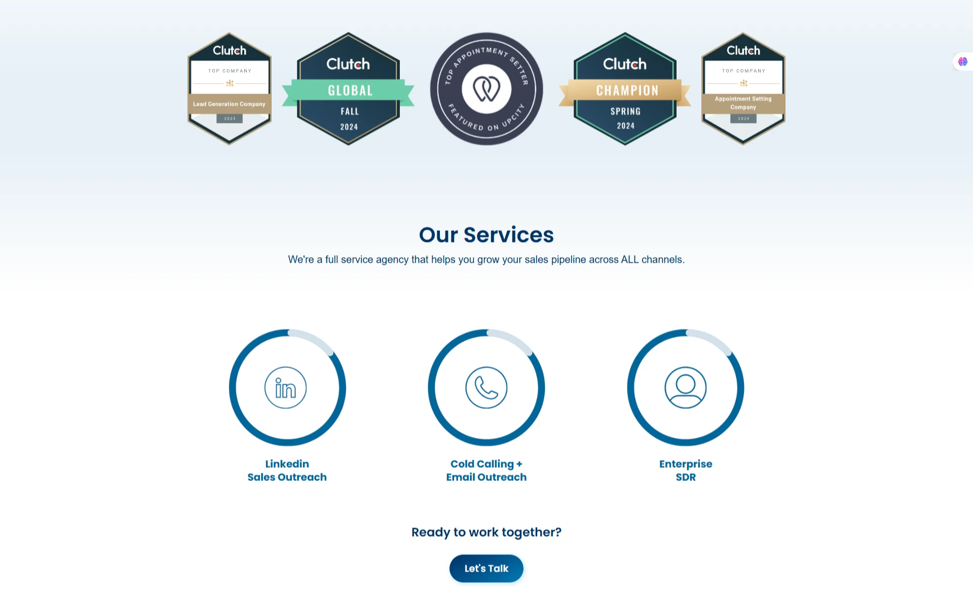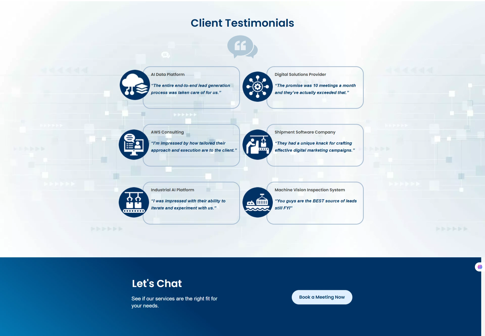 Built a modern marketing website for a B2B lead generation agency using Bubble. The website was designed to present the company’s services clearly, build trust with testimonials and industry badges, and drive conversions through strong call-to-action sections such as contact requests and meeting bookings.