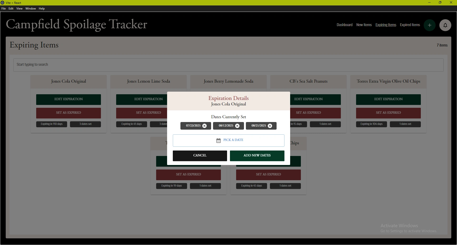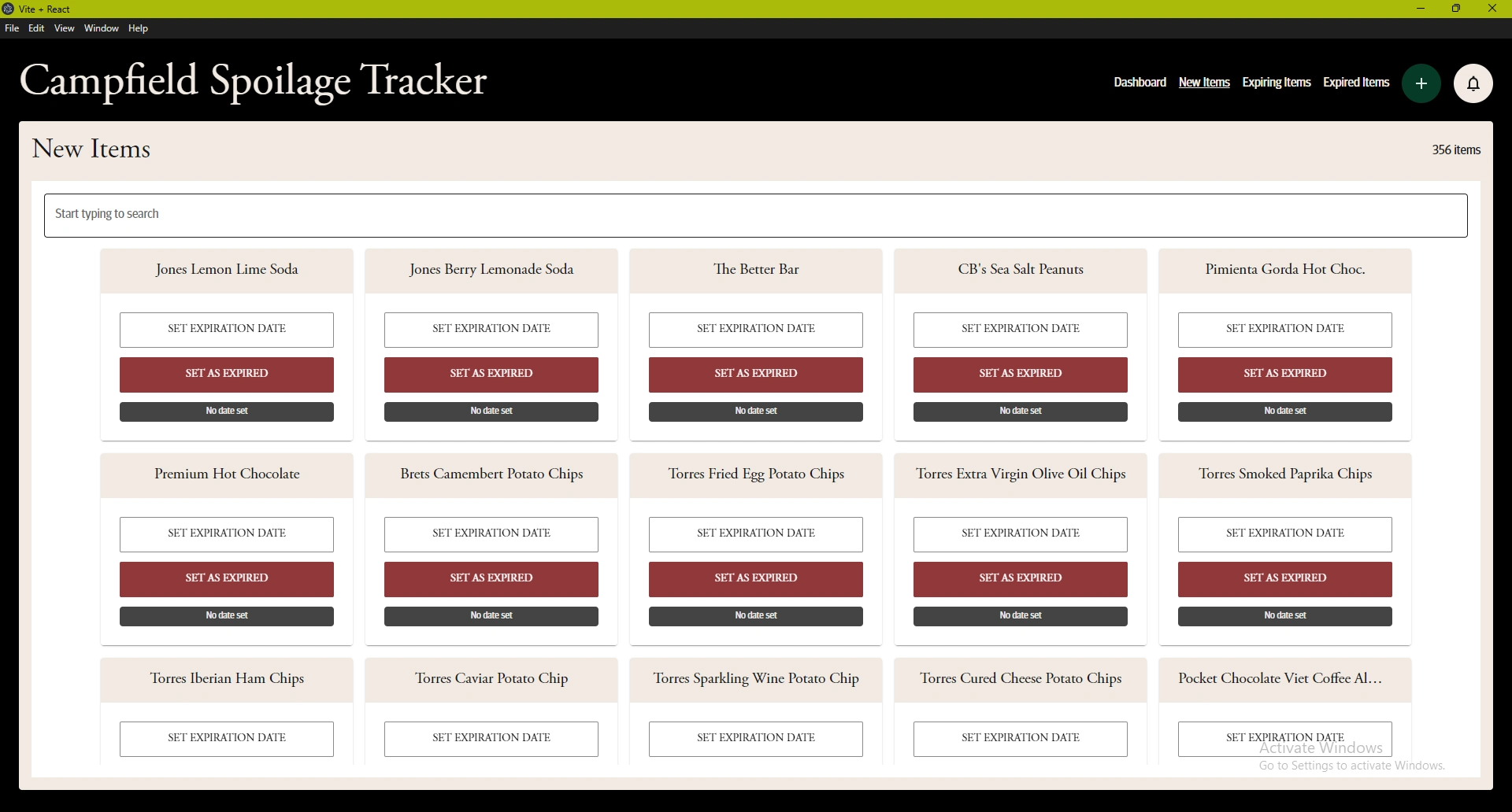 The dashboard view is under development. I have plans to add key indicators of change in item spoilage over time as well as some graphs to visually reflect that data.