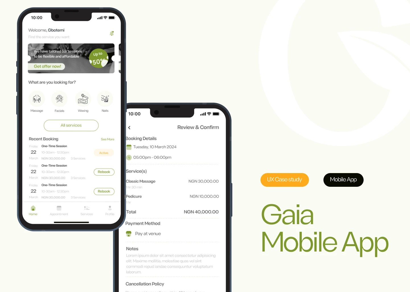 Gaia is a spa and wellness hub that offers flexible booking sessions designed to simplify the process of booking their spa and wellness sessions. The hub aimed to use the Gaia app, which allows users to schedule spa treatments, make payments, and find spa locations effortlessly. Our goal was to streamline operations, enhance the customer experience, and boost session bookings with a simple and efficient mobile app.