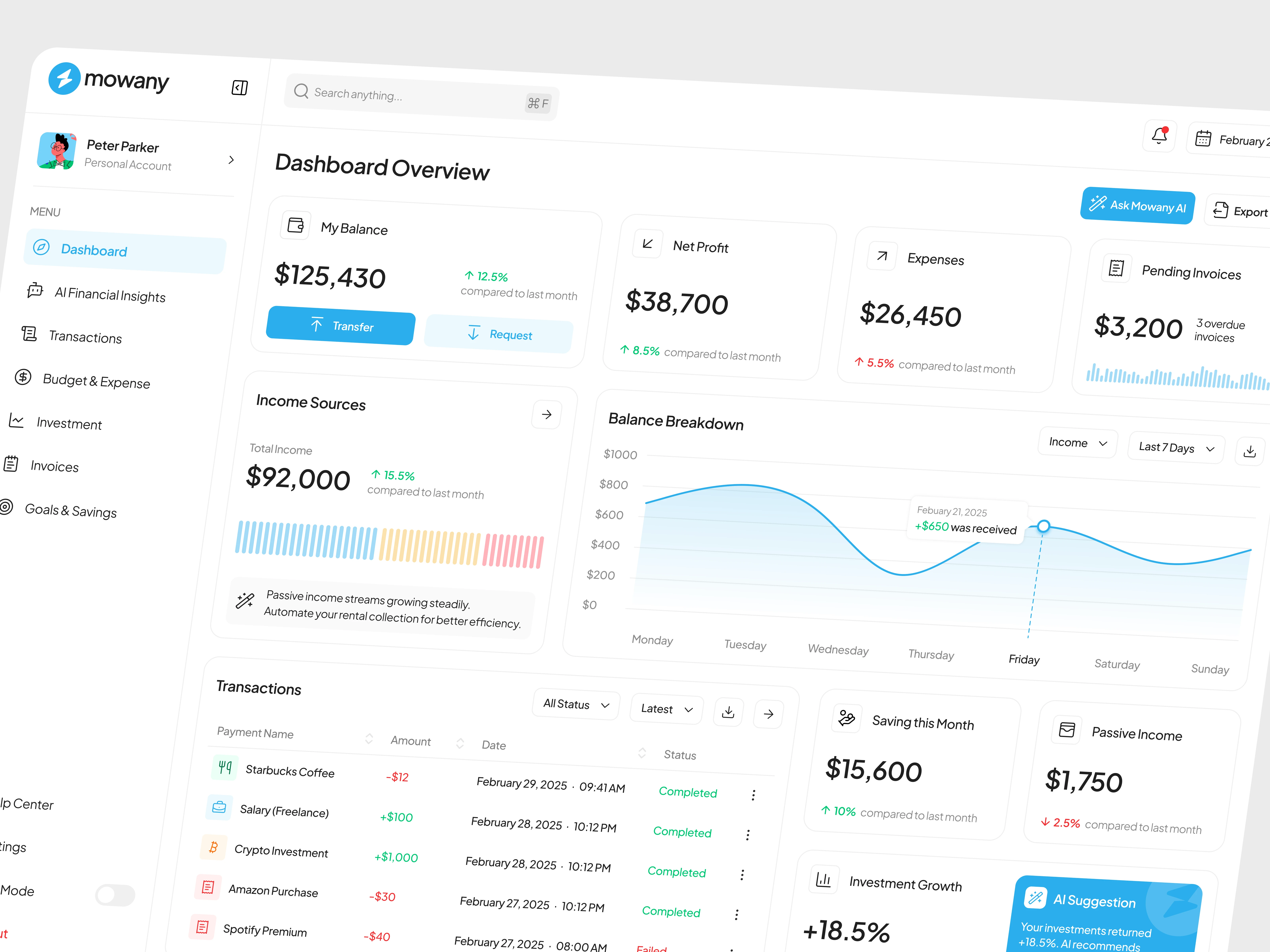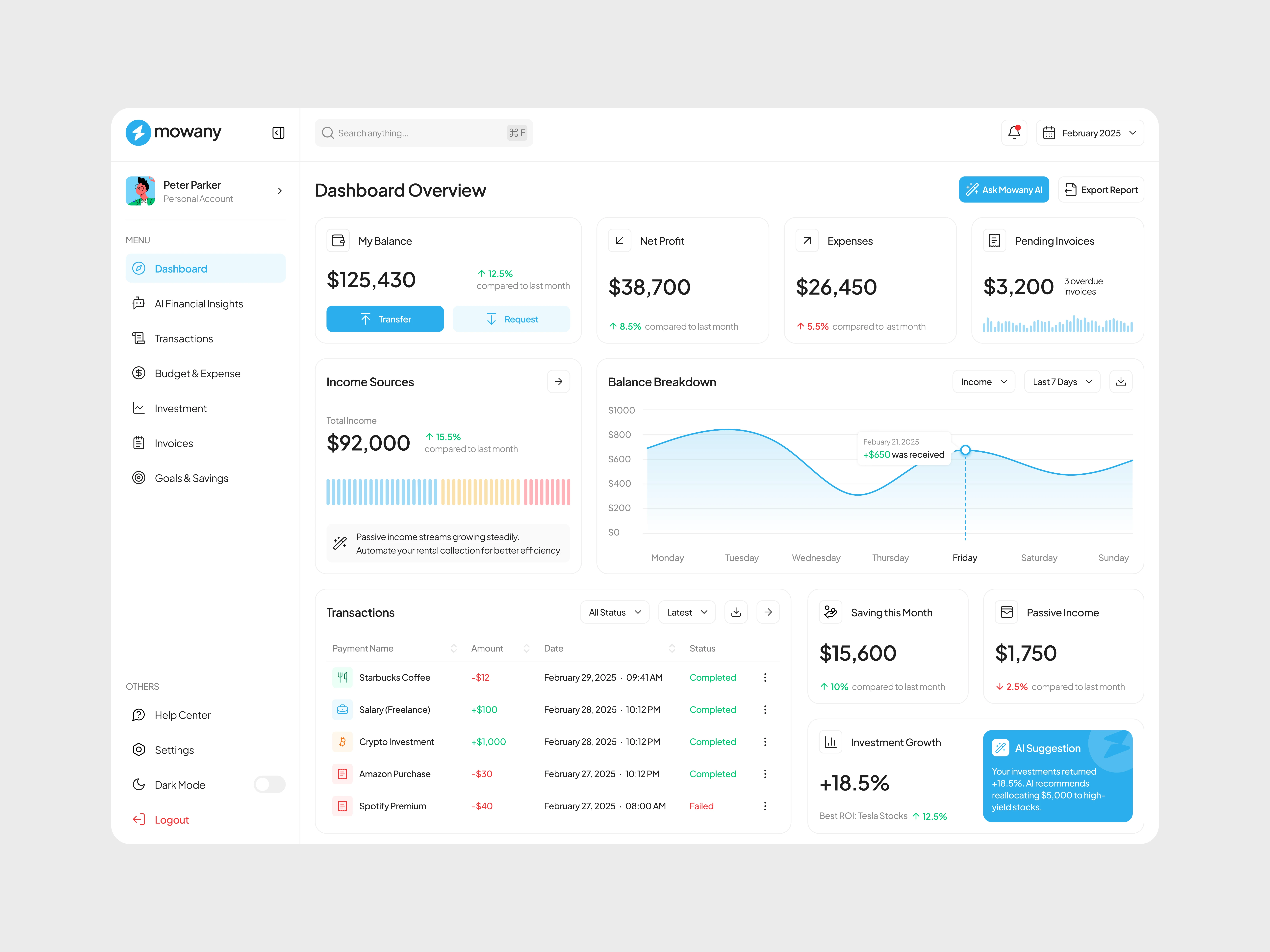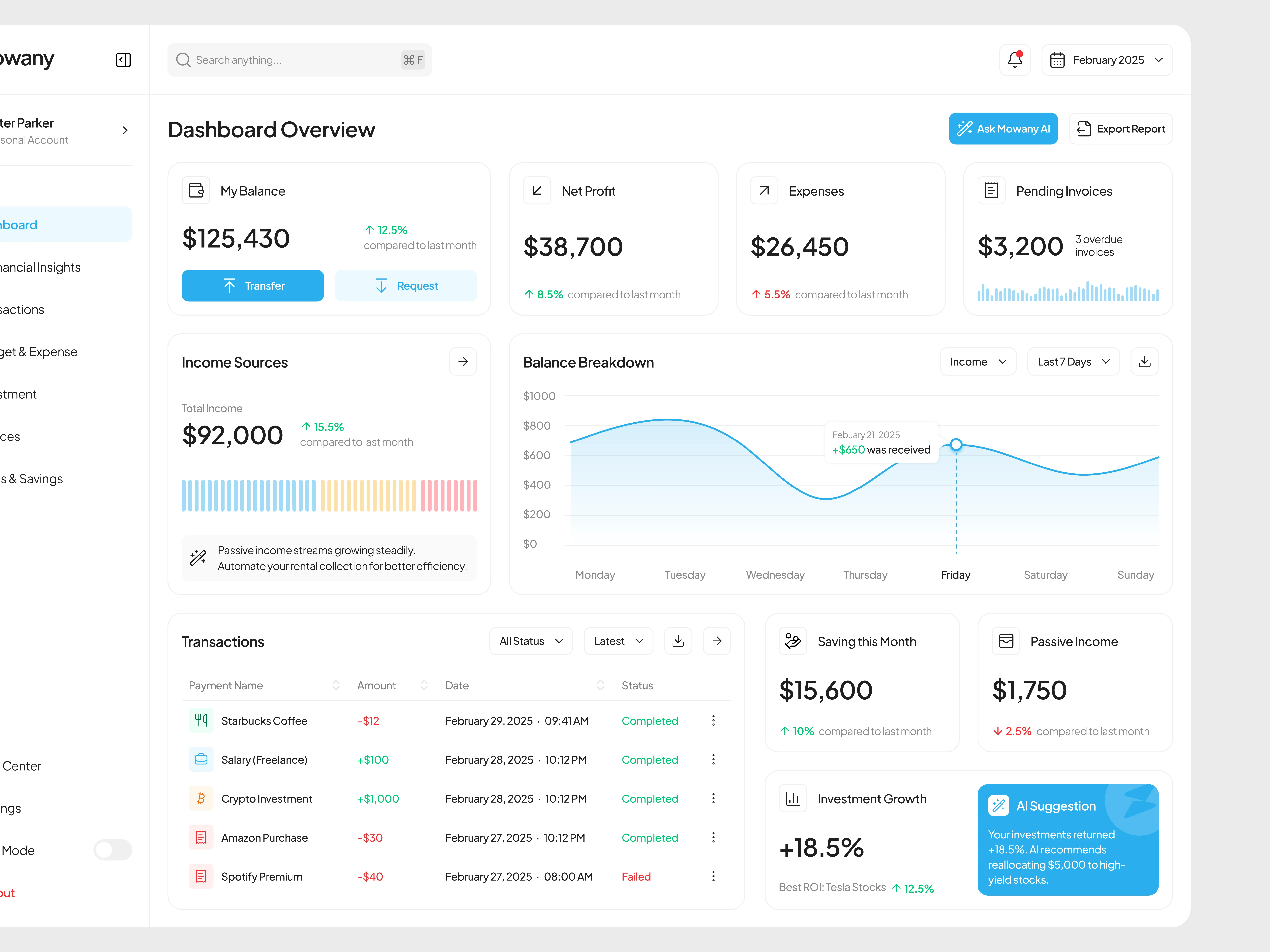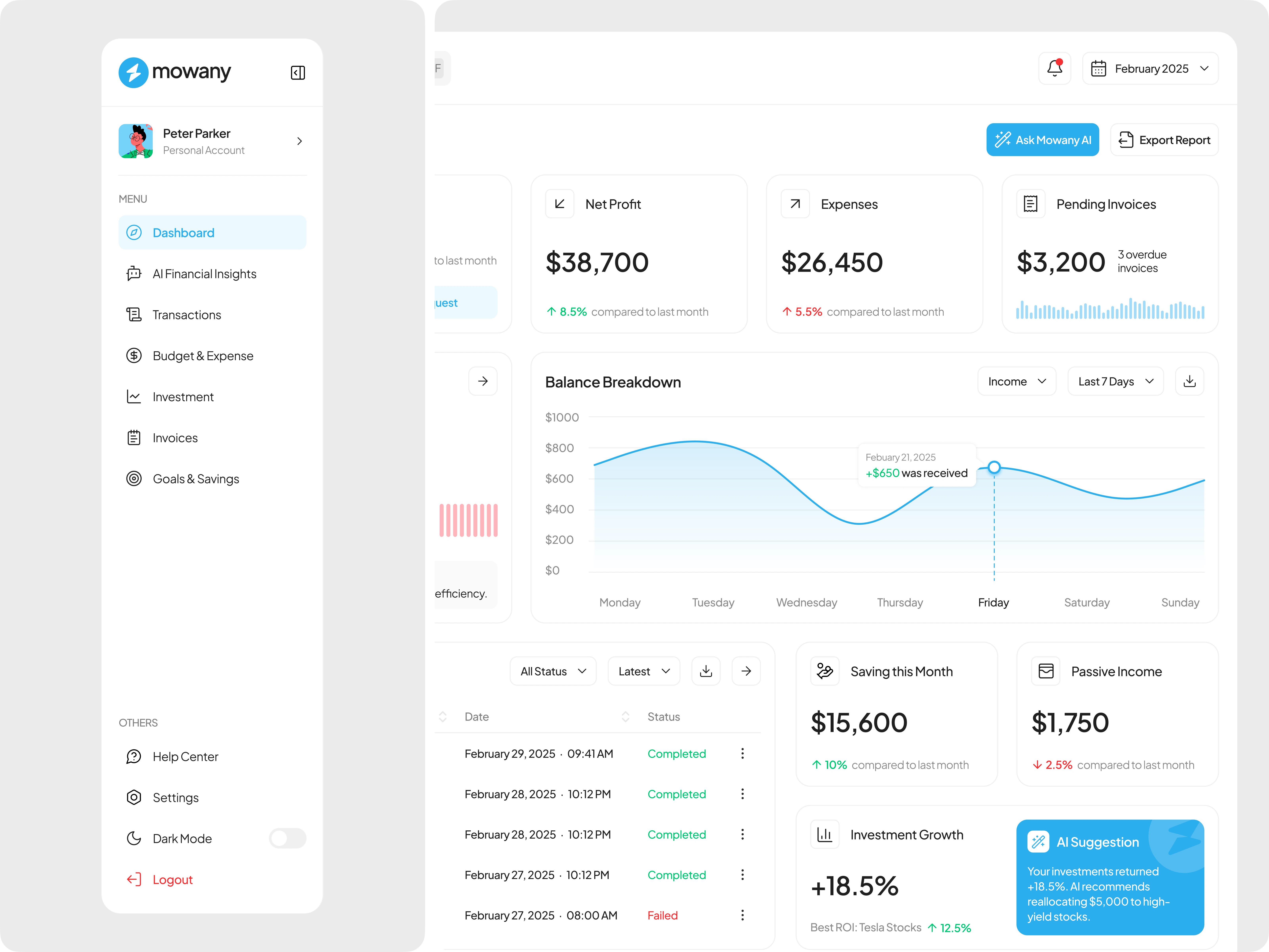 Mowany is a next-generation financial dashboard powered by AI, designed to transform the way users manage their finances. With an intuitive and modern interface, it delivers real-time insights into income, expenses, and investments, helping users make smarter financial decisions. AI-driven analytics detect spending patterns, suggest budget optimizations, and provide predictive investment insights to maximize financial growth.