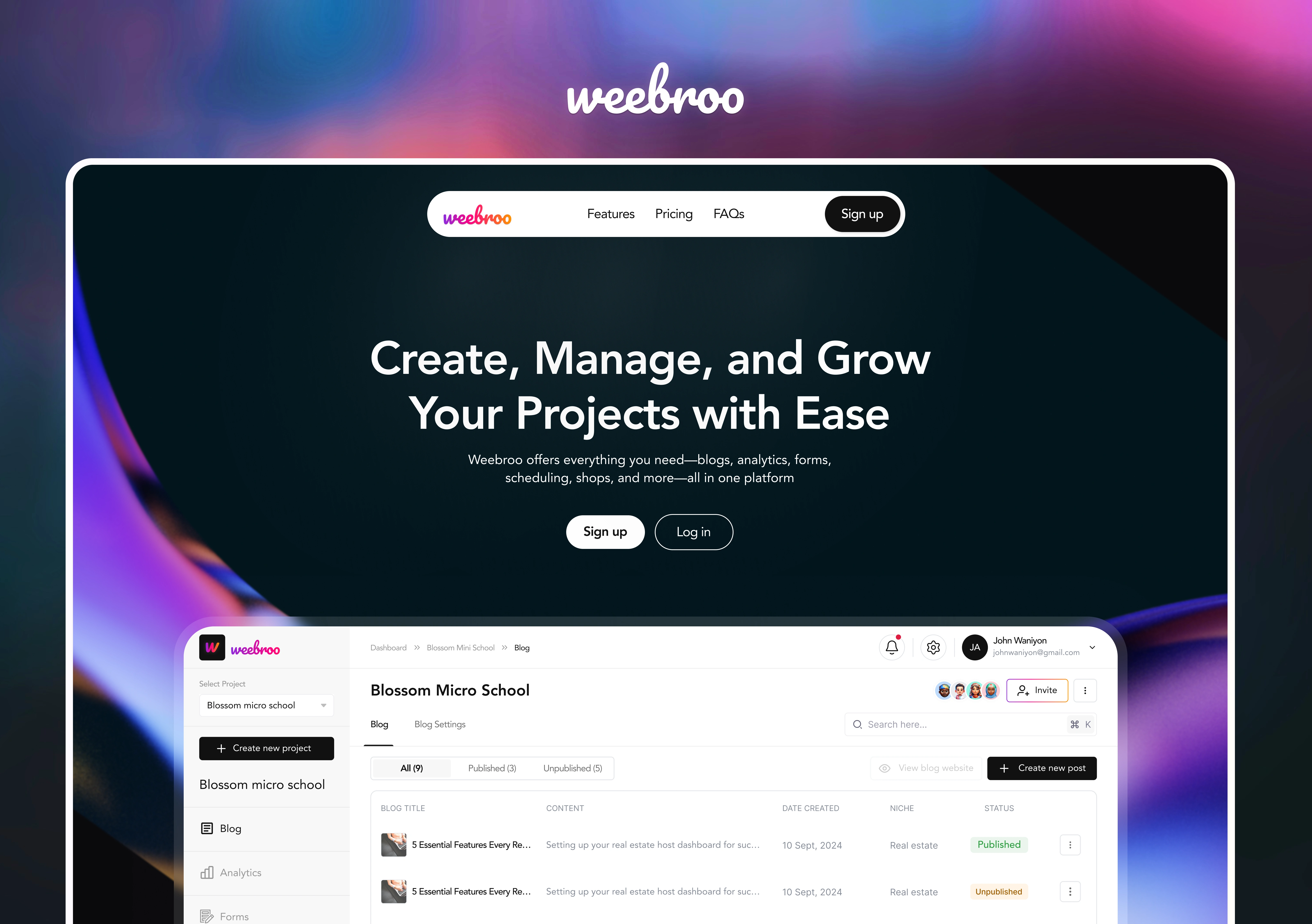 Weebro is an all-in-one platform designed to help users create, manage, and grow their projects seamlessly. It brings together everything needed to build and scale, from blogs, analytics, and forms to scheduling, shops, and collaboration tools all in one place.