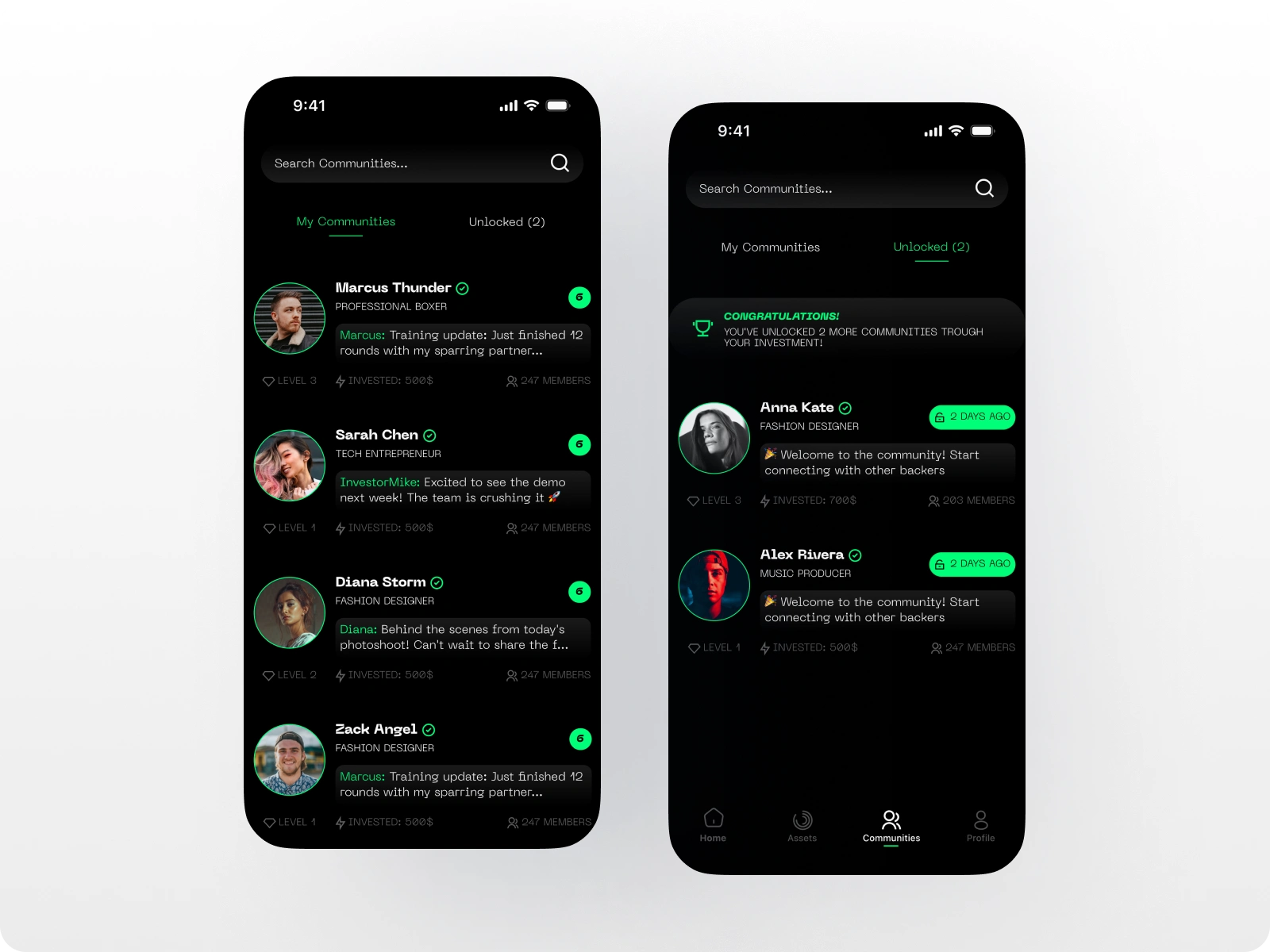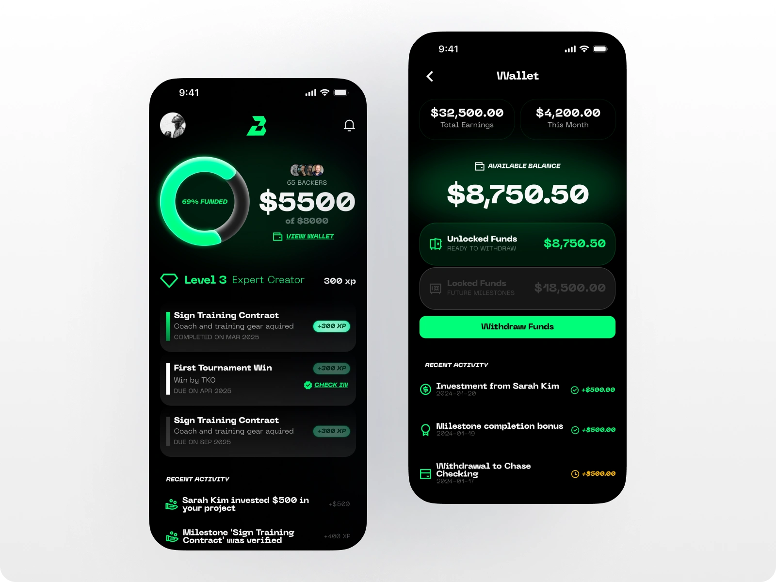 Dark-mode screens with glowing green highlights make investments instantly understandable. Real-time graphs and asset breakdowns provide financial transparency.