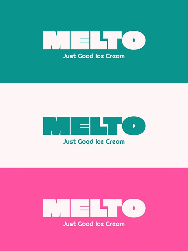The Melto identity is built around strong, rounded typography and a high-contrast colour palette inspired by classic ice cream flavours.