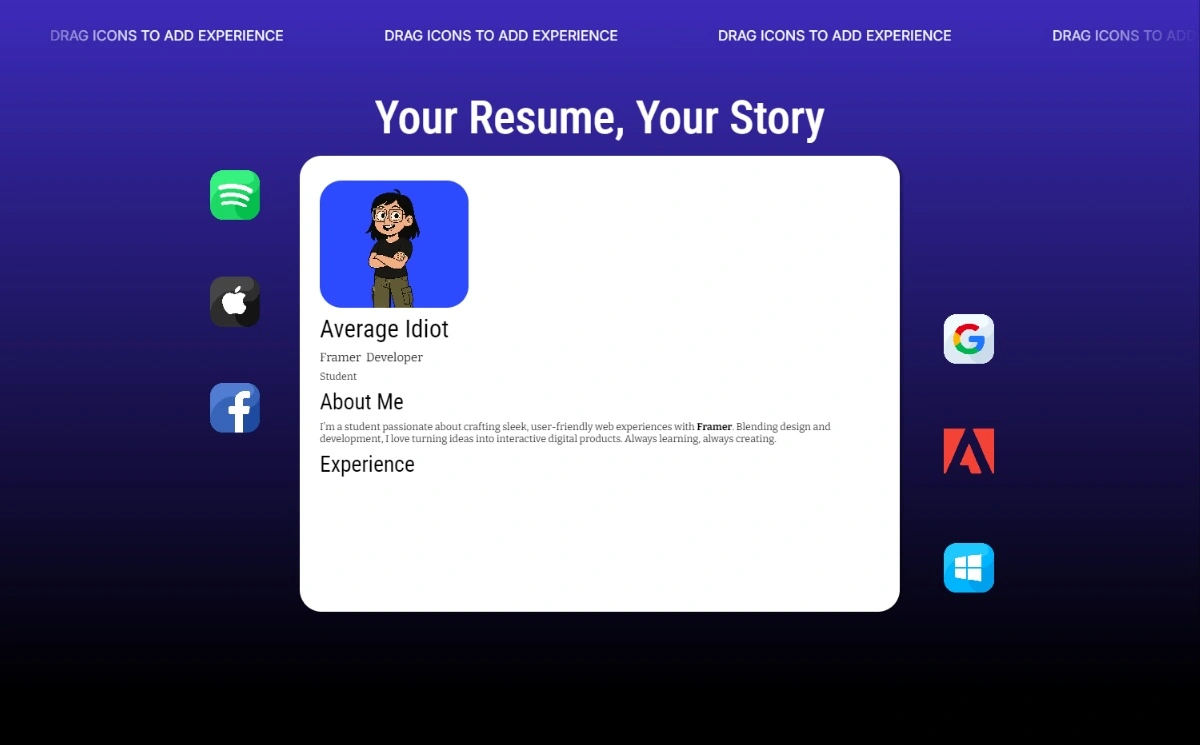 The template introduces an interactive resume-based design at its core. In the hero section, a resume is surrounded by floating company logos that can be dragged and added under the experience section. This simple interaction solves the problem in three ways:
