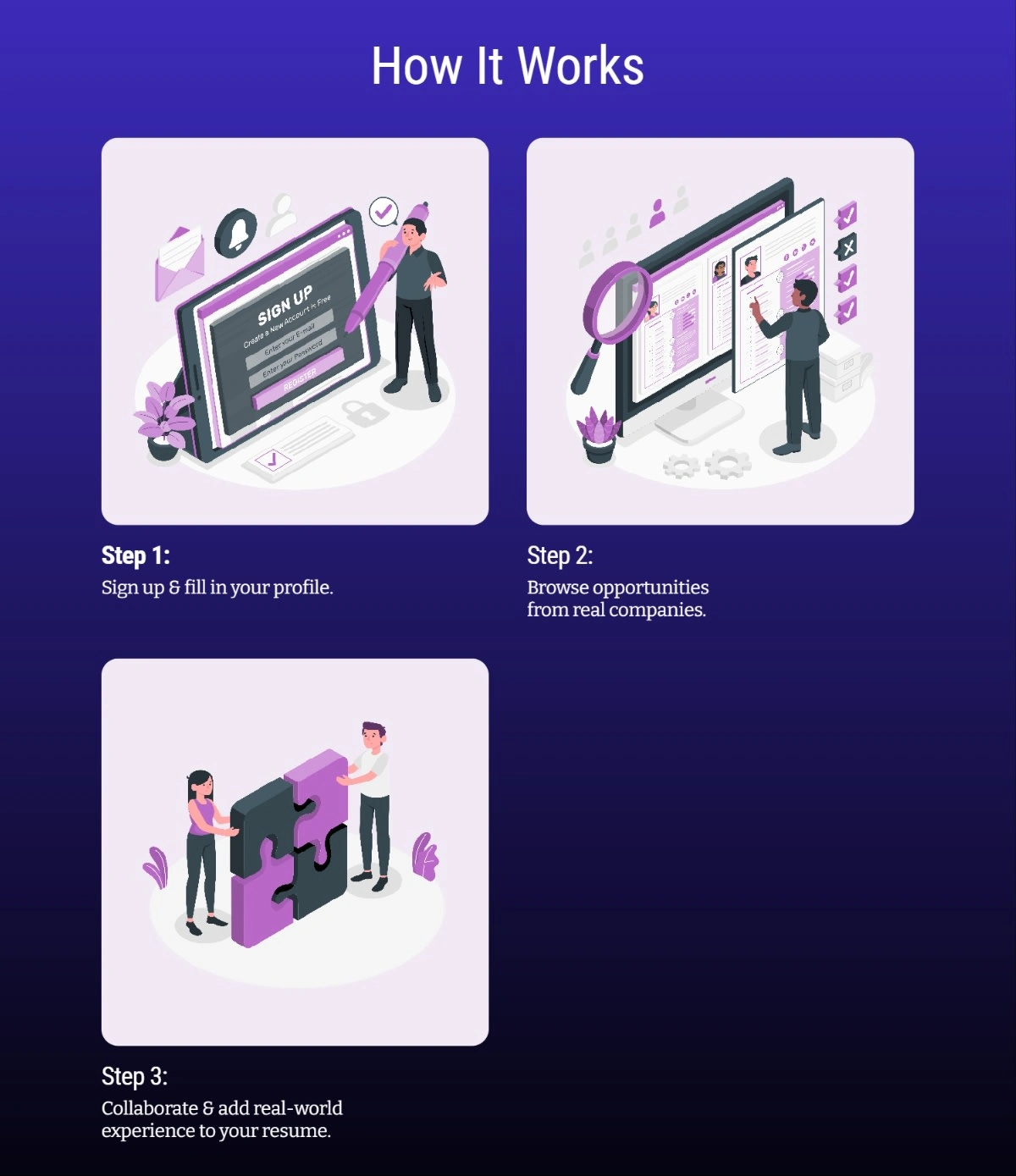 Clear Value Proposition — The template instantly communicates the platform’s purpose: helping students gain experience that matters.