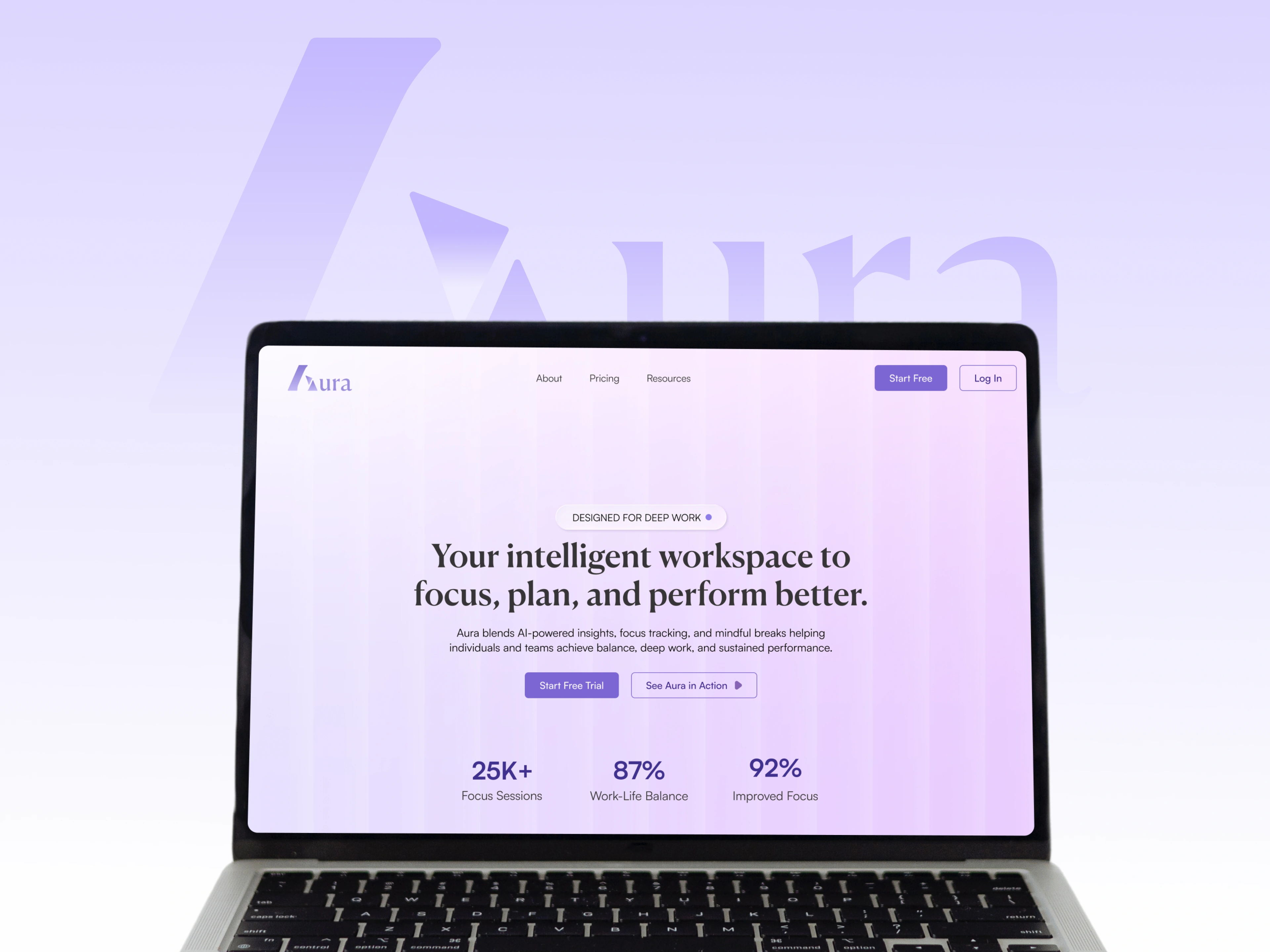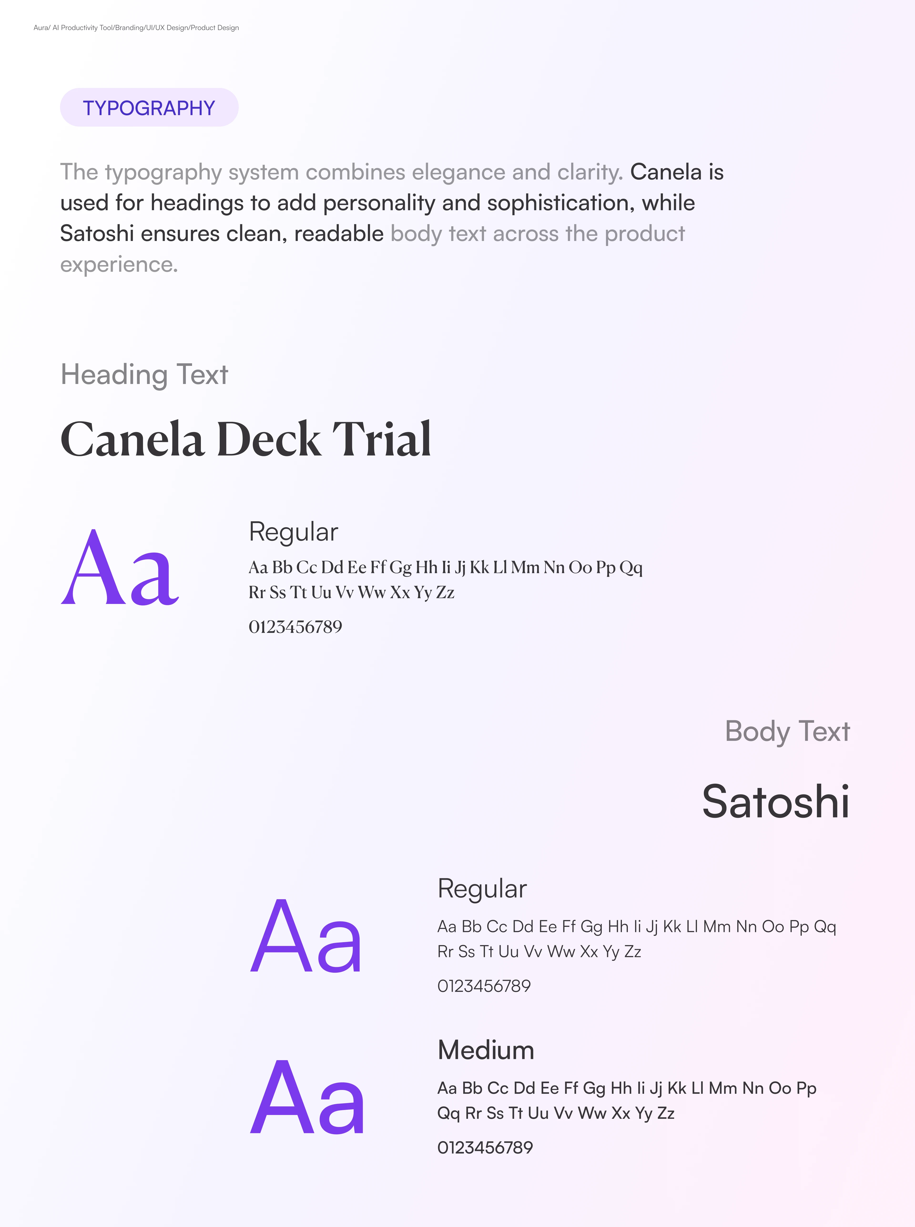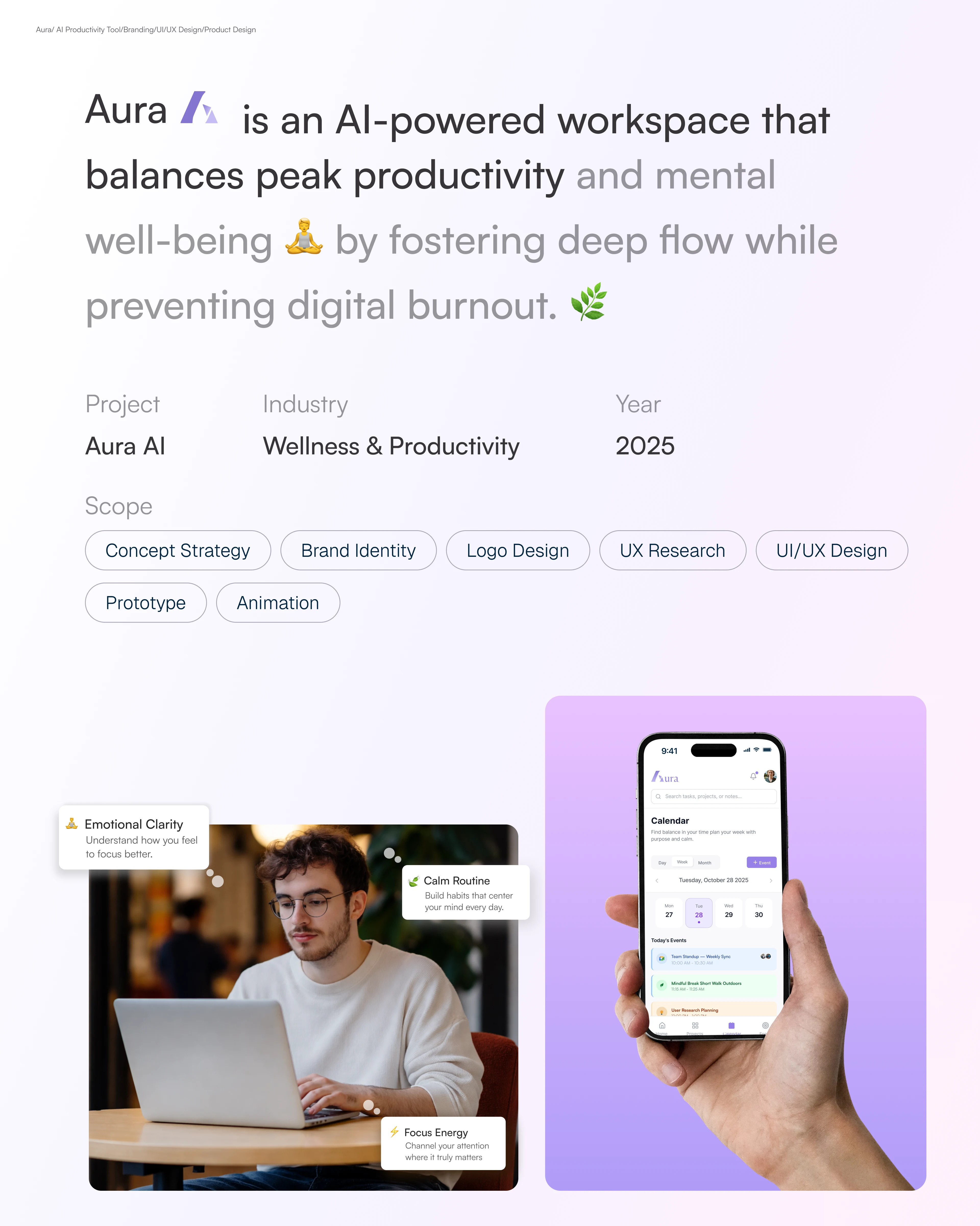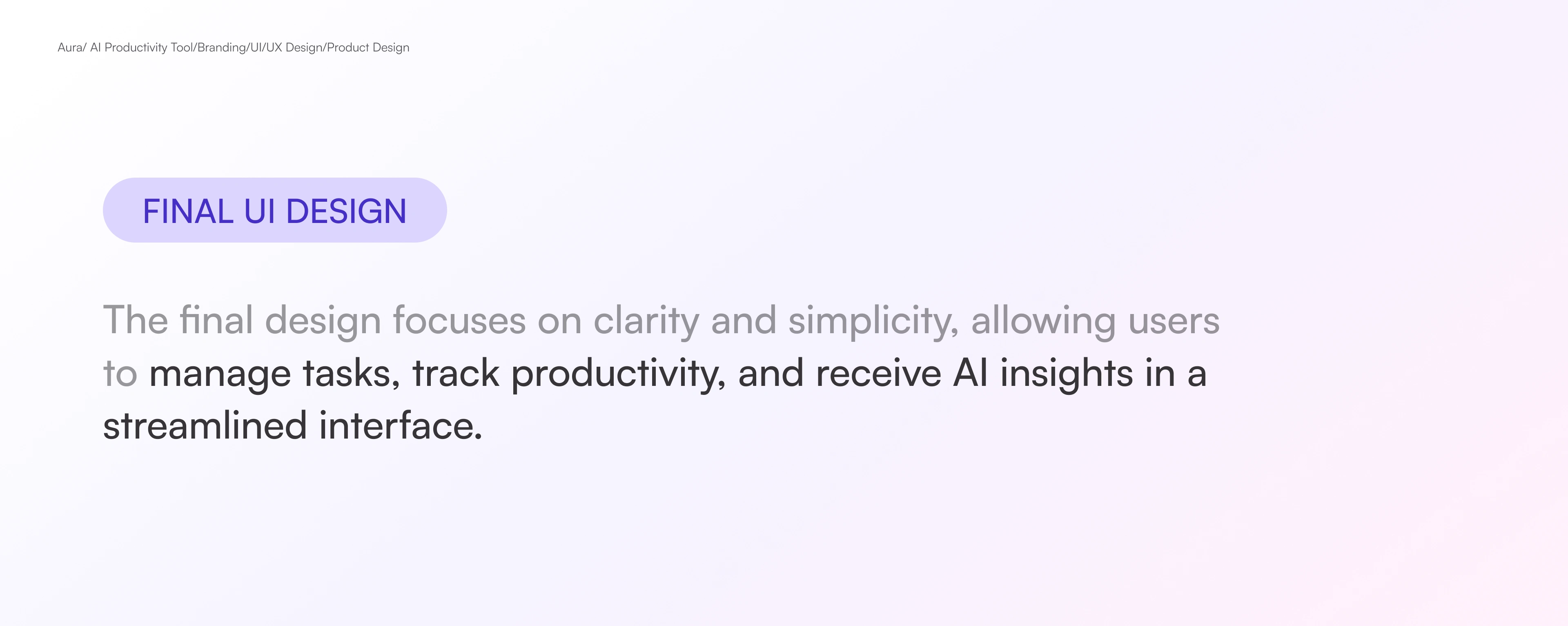 Design Language — Soft gradients, generous whitespace, rounded components. Every detail was chosen because Aura's users are already staring at harsh interfaces all day. This one needed to feel like relief the moment it loaded.