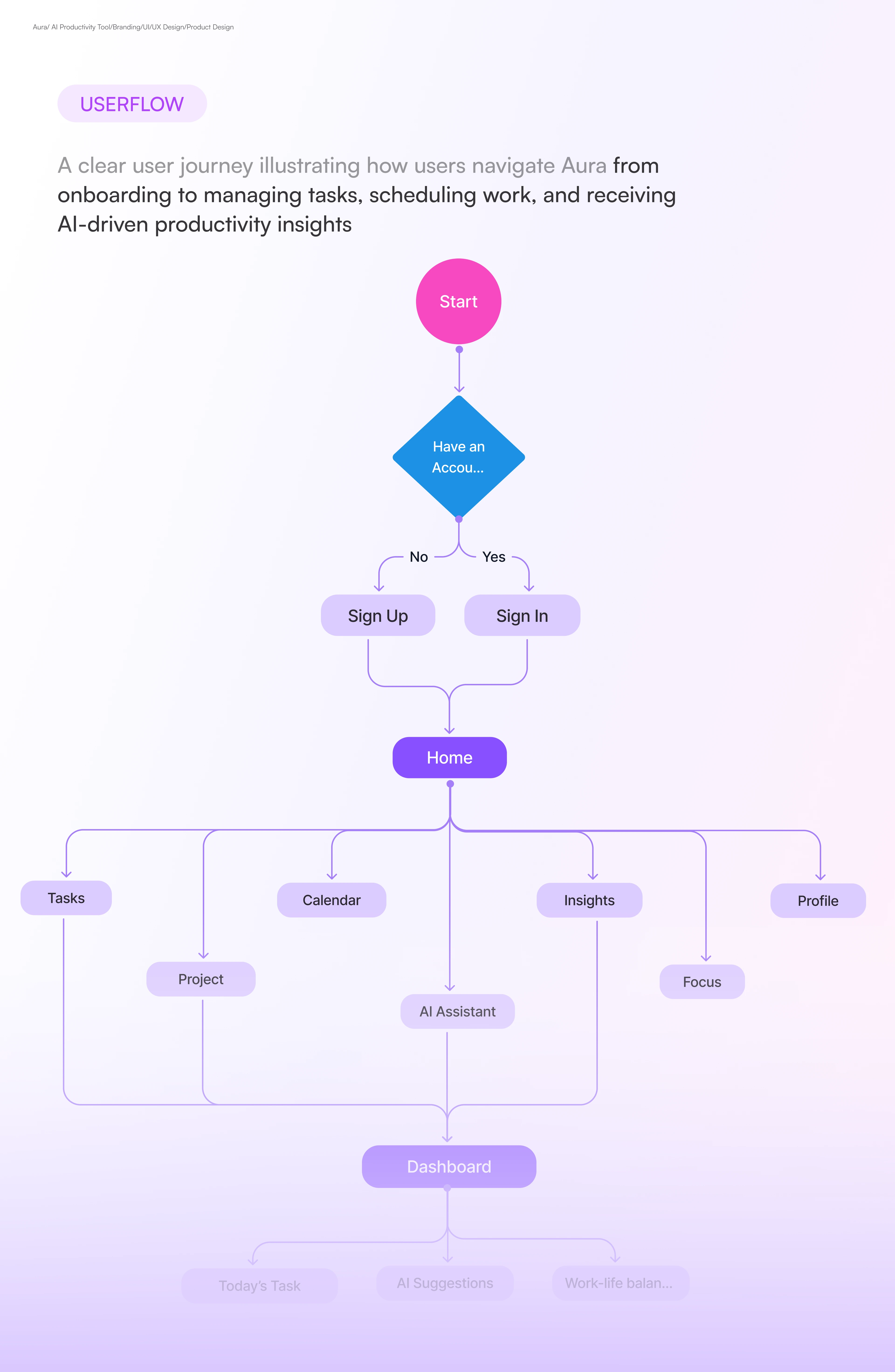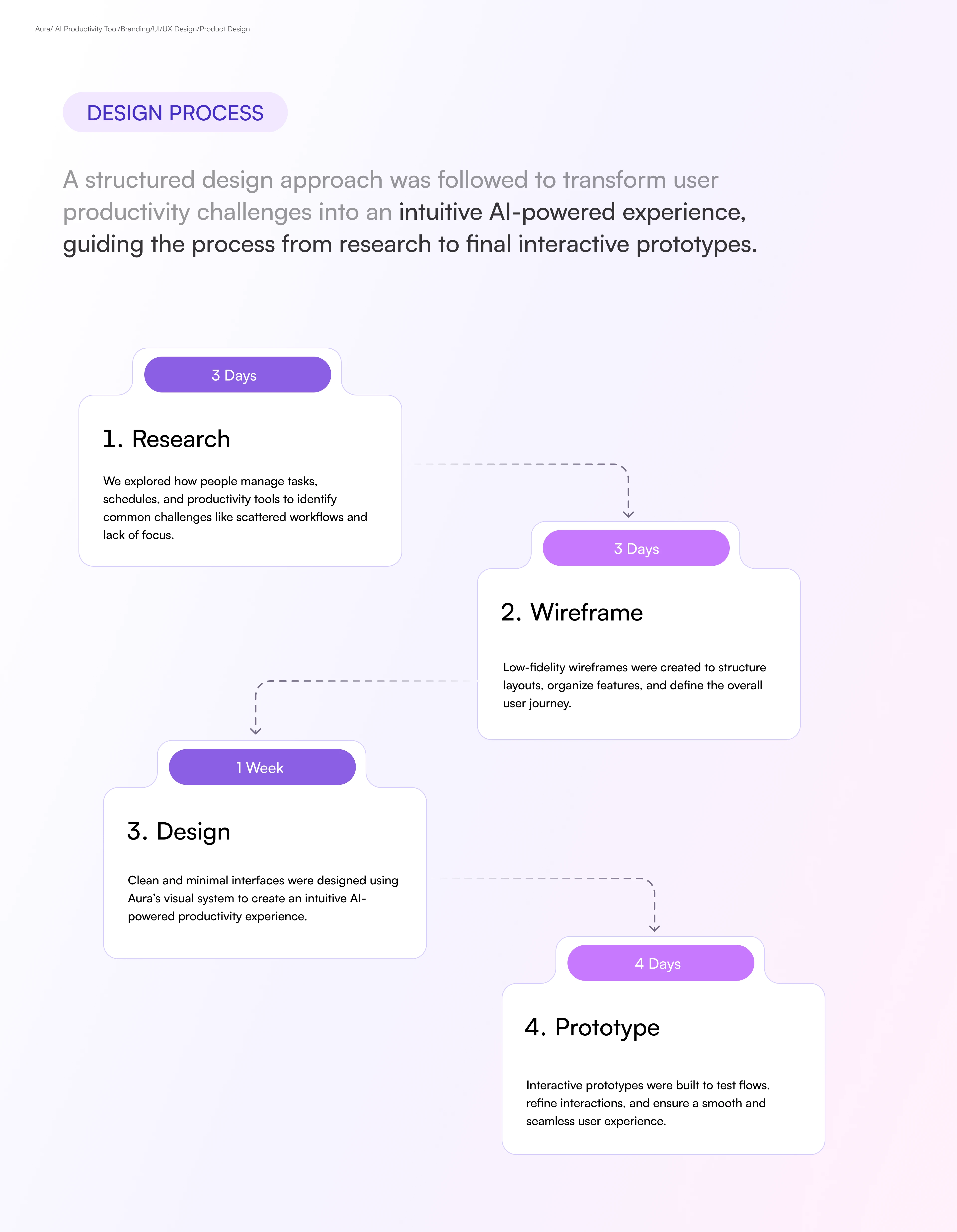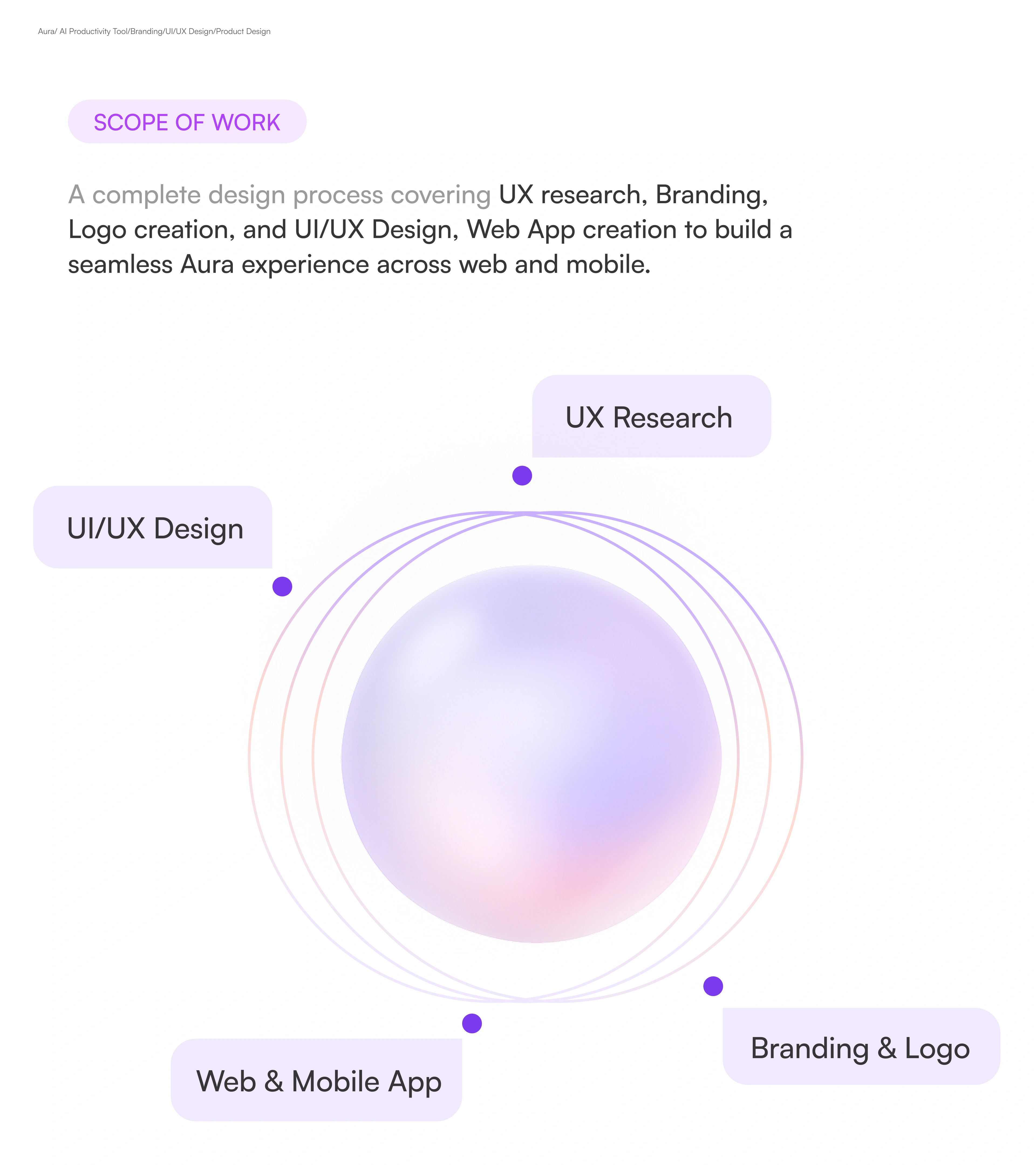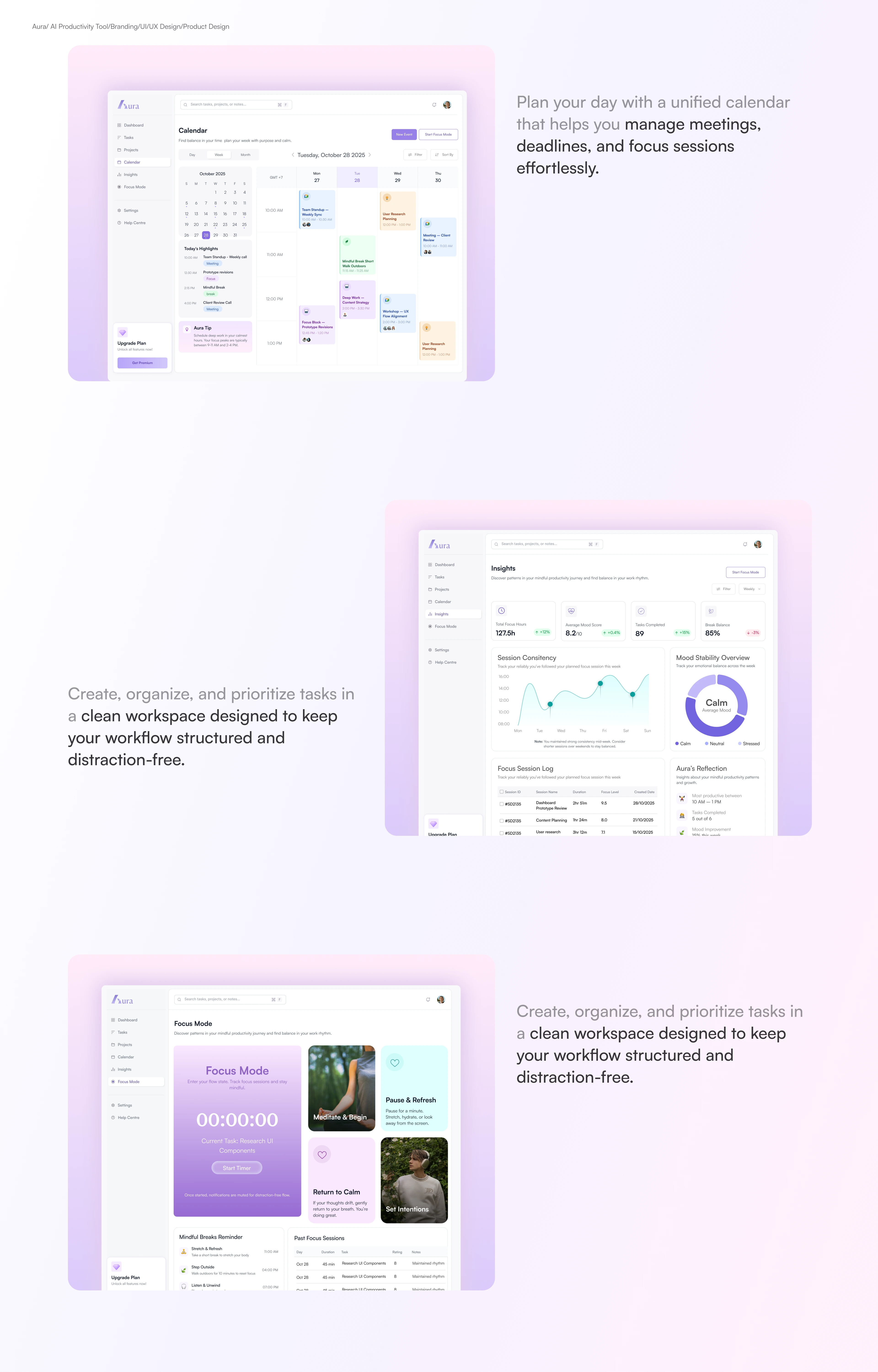 Design Language — Soft gradients, generous whitespace, rounded components. Every detail was chosen because Aura's users are already staring at harsh interfaces all day. This one needed to feel like relief the moment it loaded.