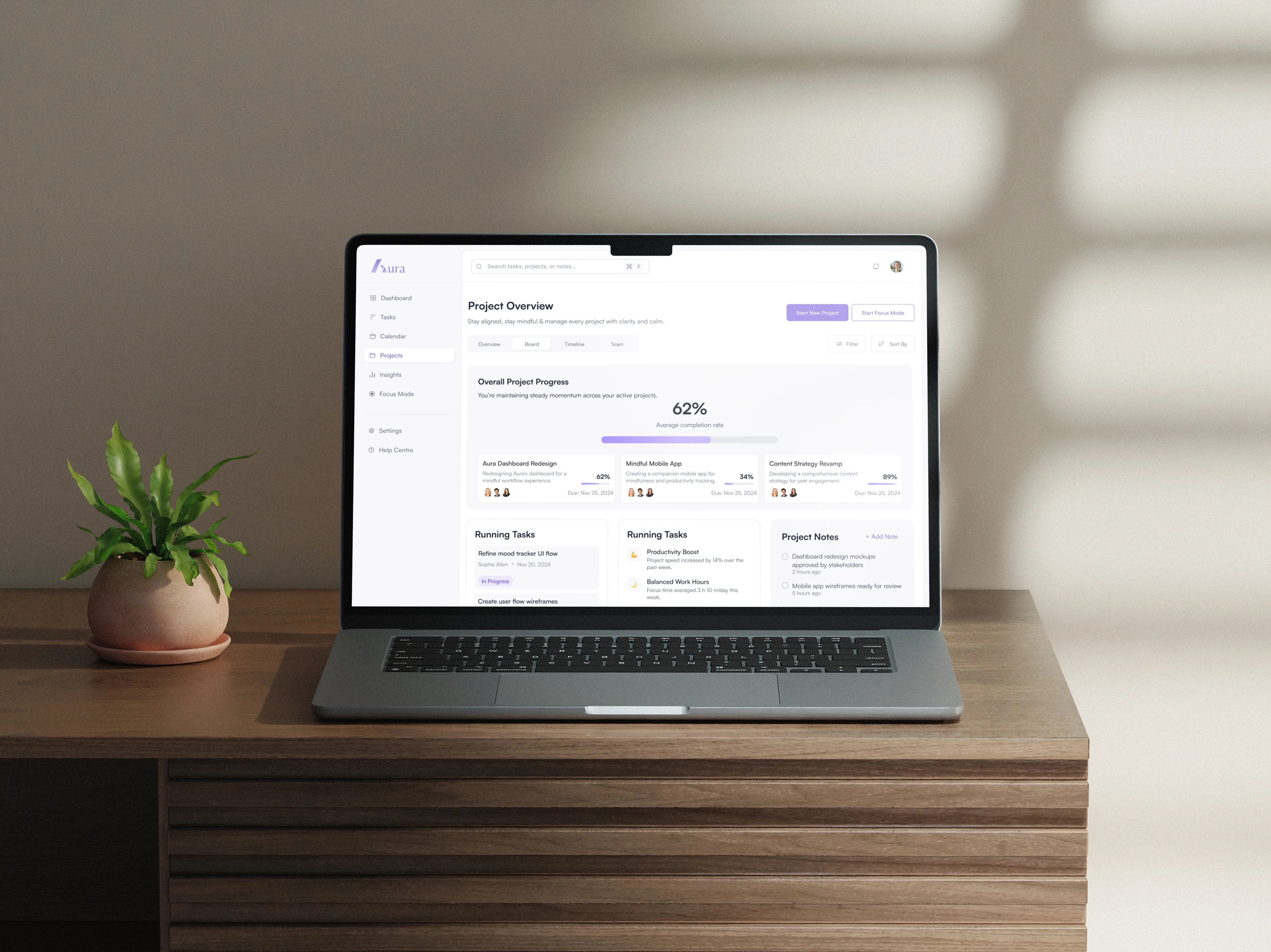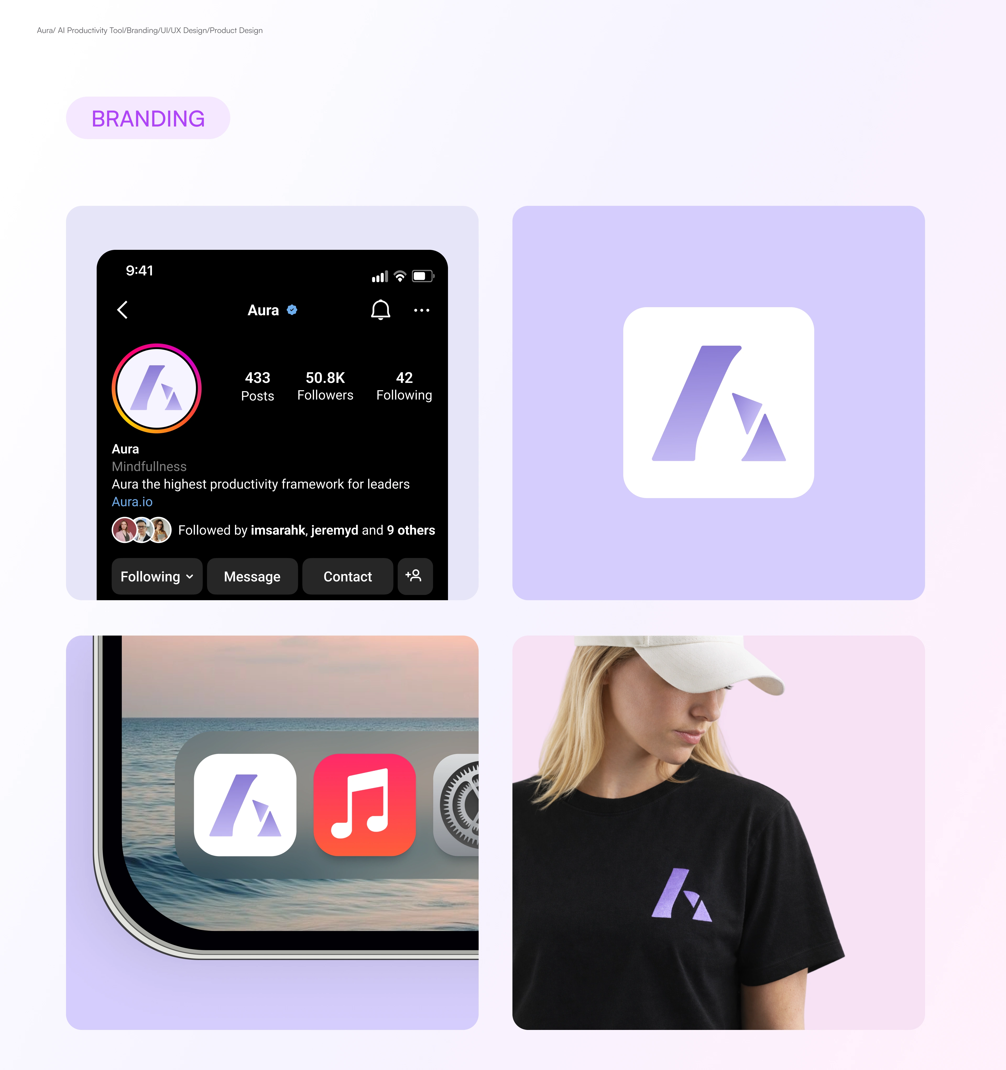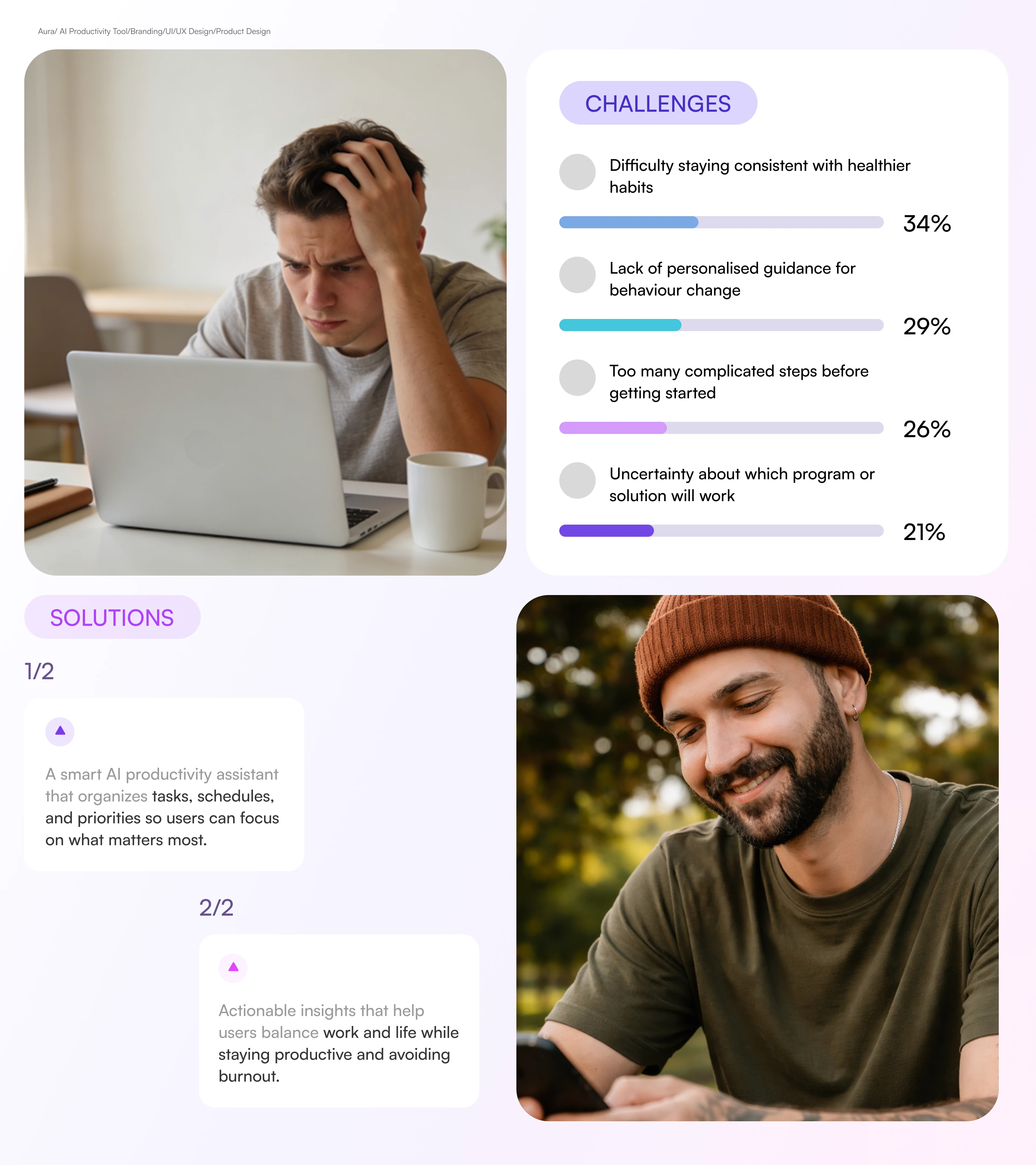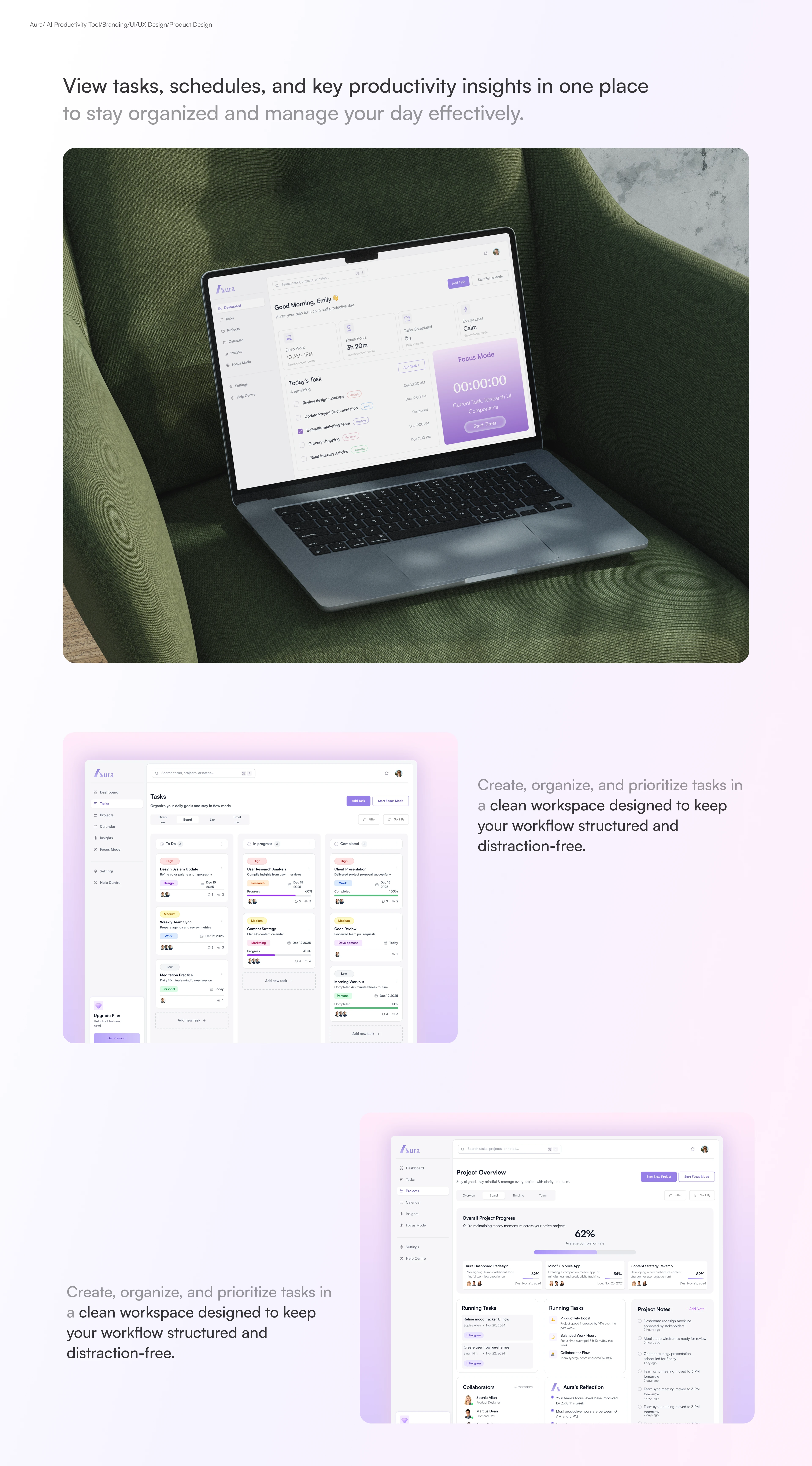 Design Language — Soft gradients, generous whitespace, rounded components. Every detail was chosen because Aura's users are already staring at harsh interfaces all day. This one needed to feel like relief the moment it loaded.