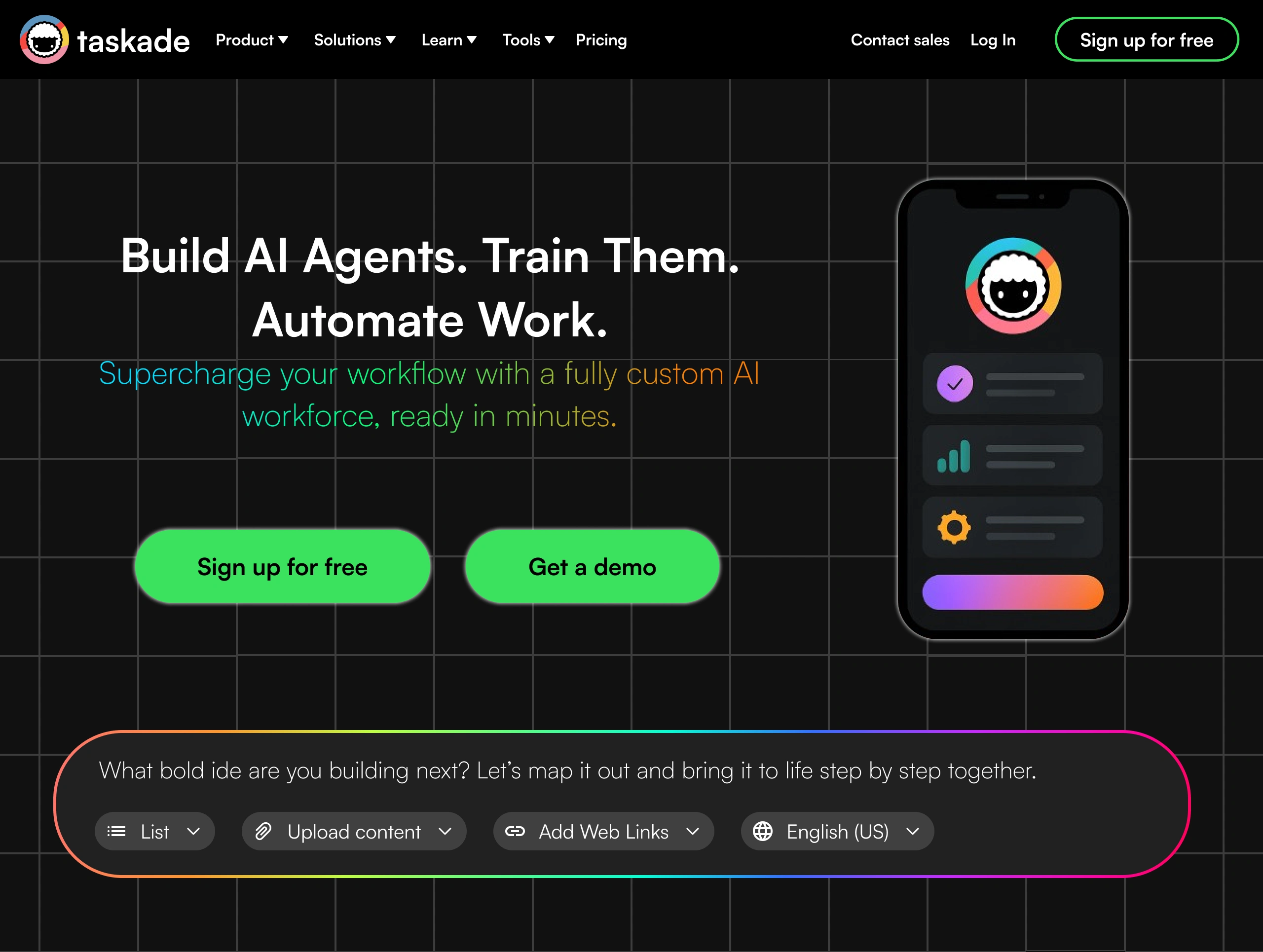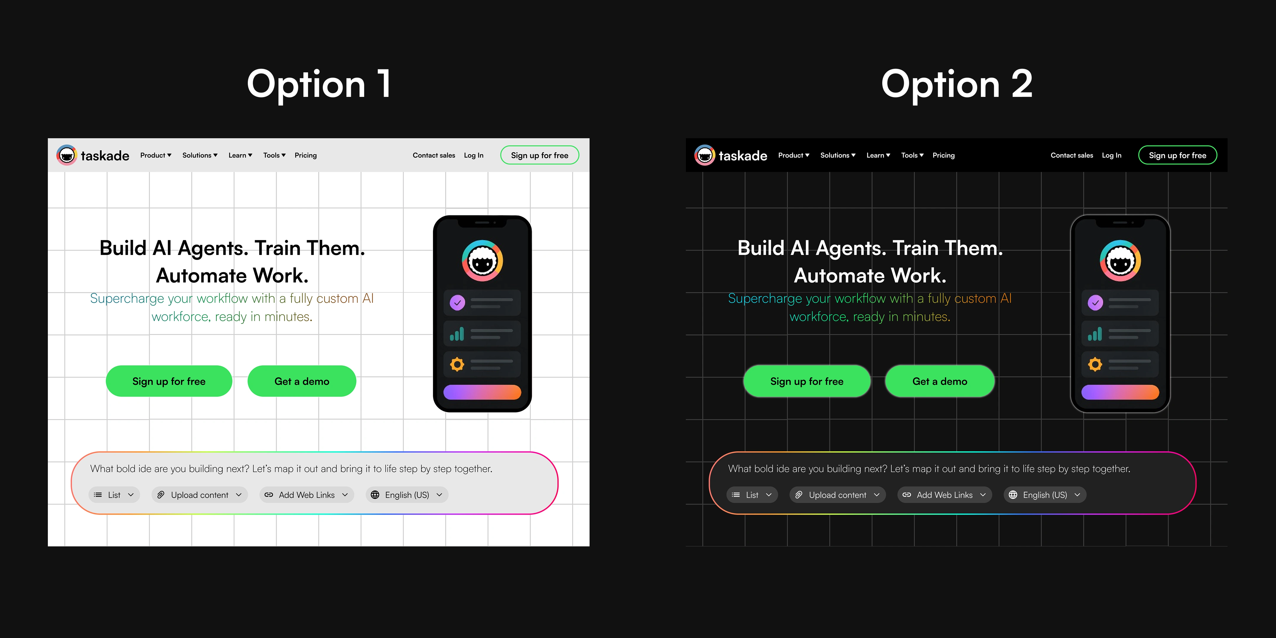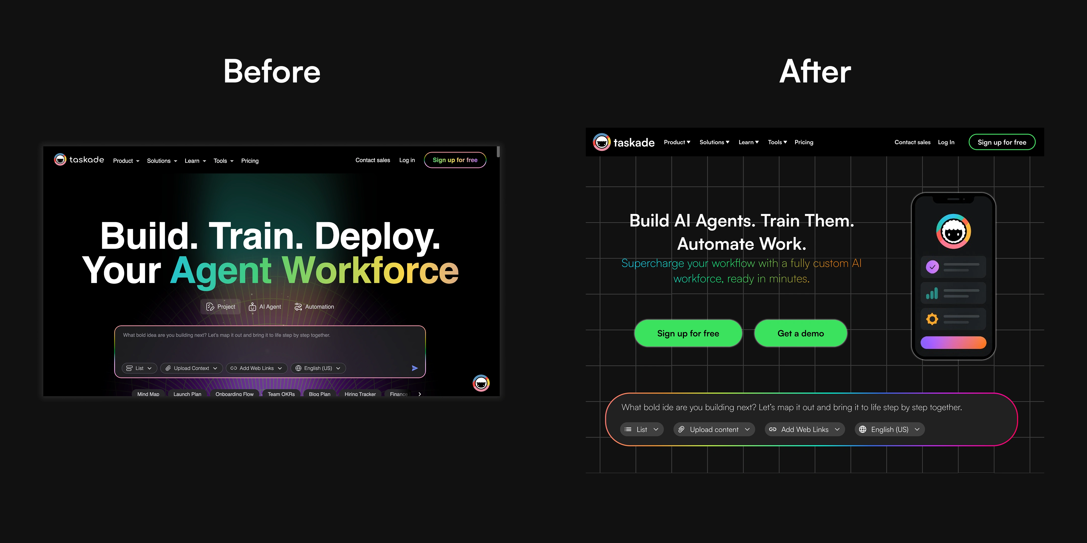 Taskade’s original design featured bold typography and strong CTA elements, but lacked refined structure and clarity. My redesign focused on transforming the hero section into a high-converting, motion-friendly layout that introduces the product with confidence and clarity. I applied a stronger grid system, cleaner font pairings, and an interactive agent visual to make the message more intuitive. The layout was built with Framer in mind - fast, animated, and conversion-focused.