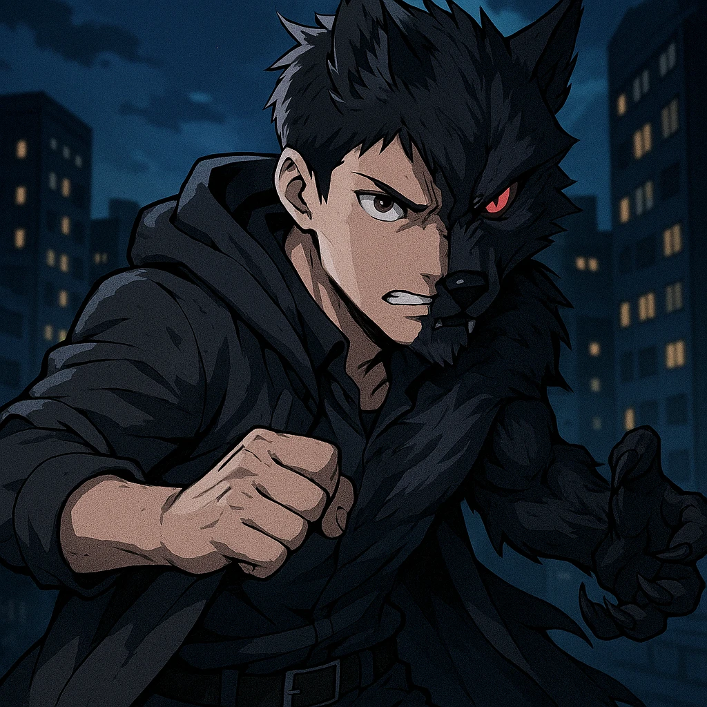 A dark and intense anime-style illustration capturing the raw power of transformation. Set against the glowing skyline of a nighttime city, this character stands mid-battle, caught between his human and beastly forms. With short, dark hair and a modern outfit layered with a flowing black cloak, his stance radiates strength and resolve. The left half of his body erupts with the features of a fierce werewolf—black fur, sharpened claws, and a piercing red eye that glows with primal fury.