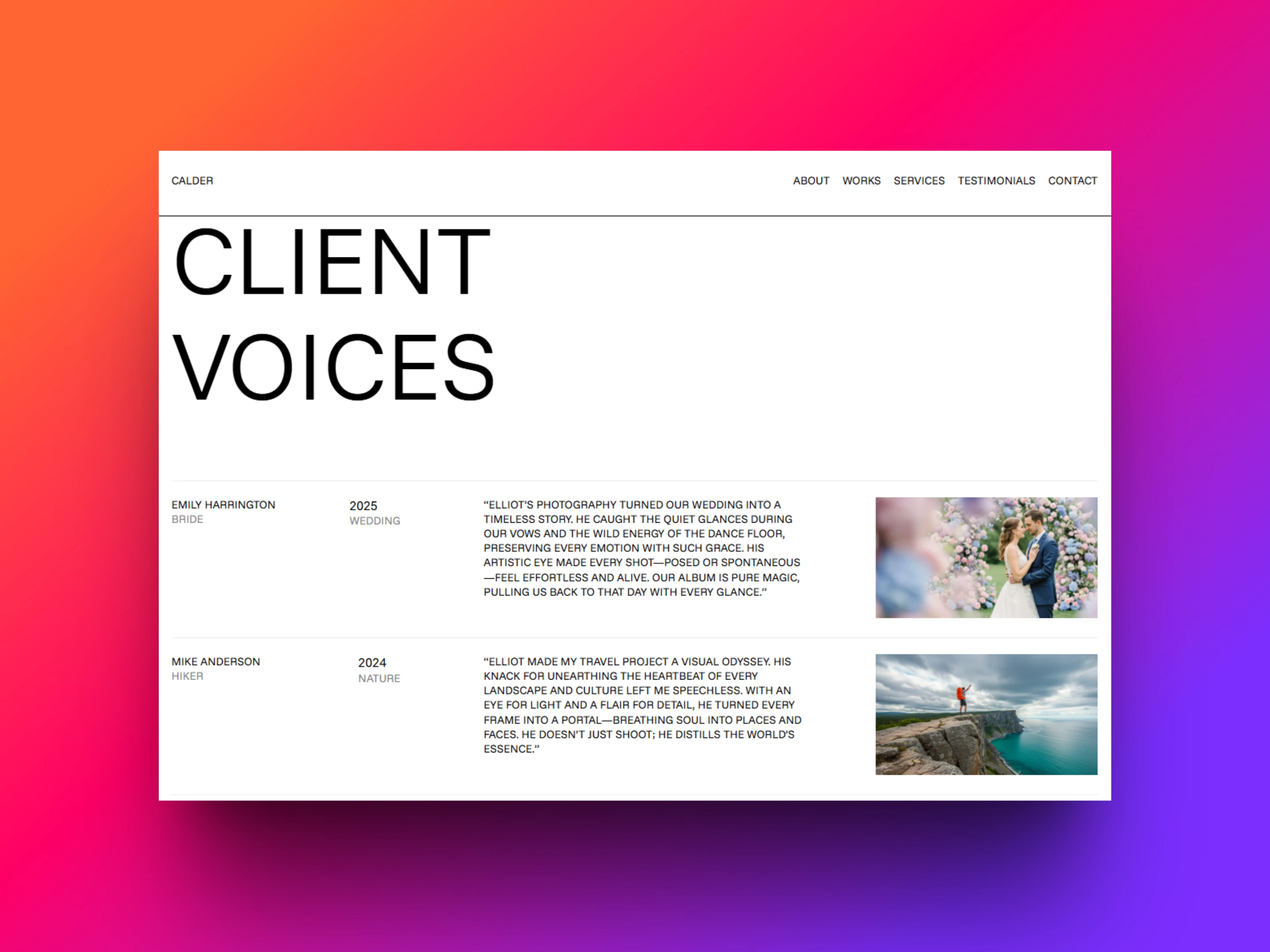 Elliot Calder Photography is a creative brand that connects individuals and businesses with striking, story-driven photography. The brand specializes in capturing timeless visuals for personal, commercial, and editorial use, offering a seamless client experience from concept to delivery.