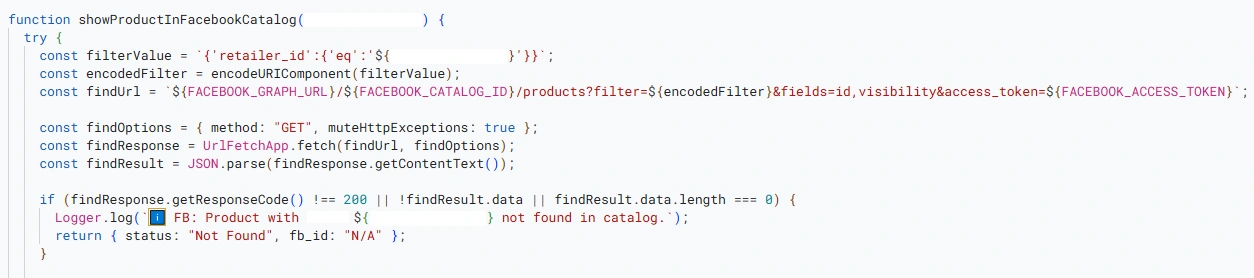 I developed a Google Sheets + Apps Script automation system that integrates directly with APIs from e-commerce storefront, fulfillment center, and meta product catalog.