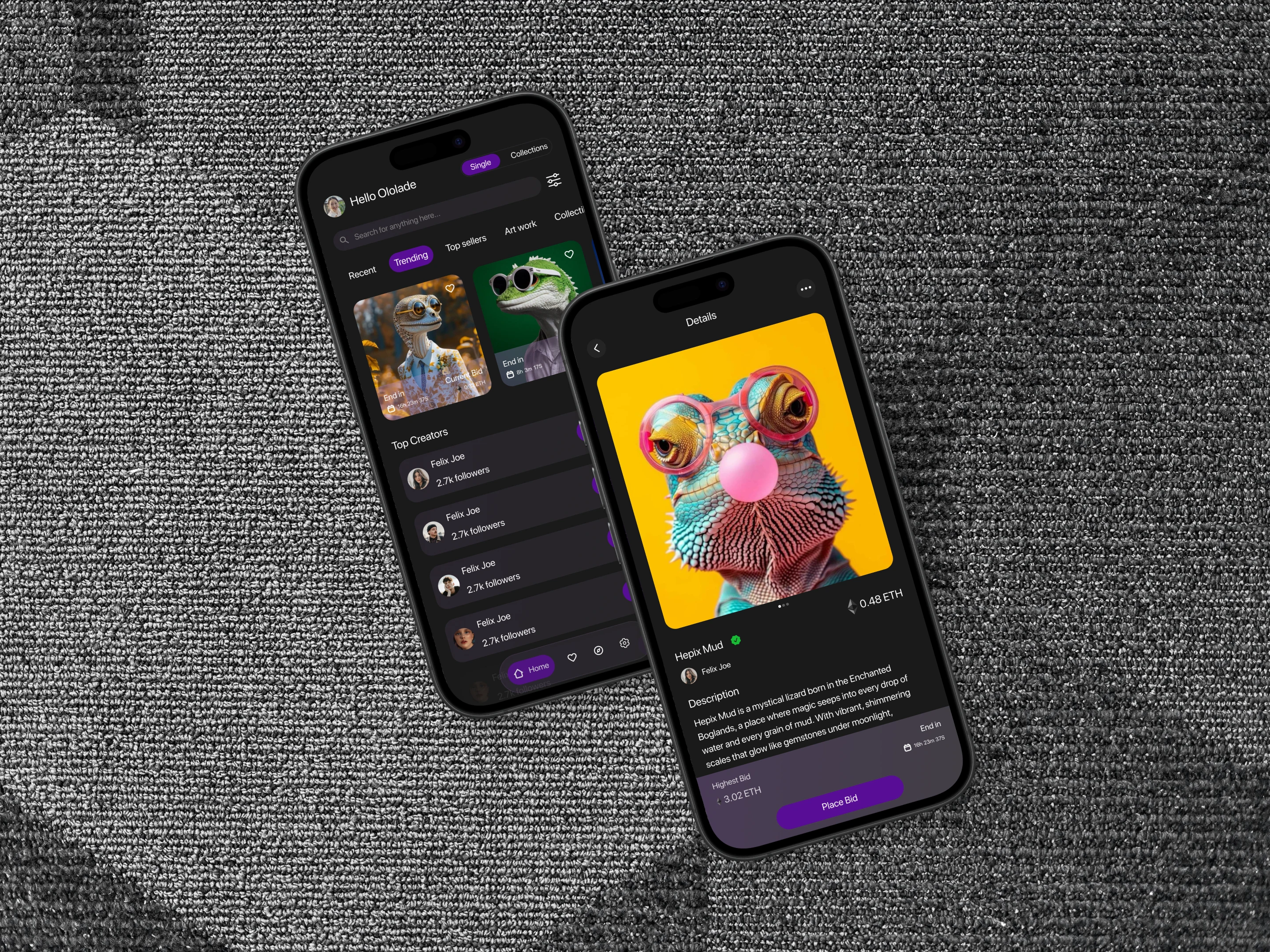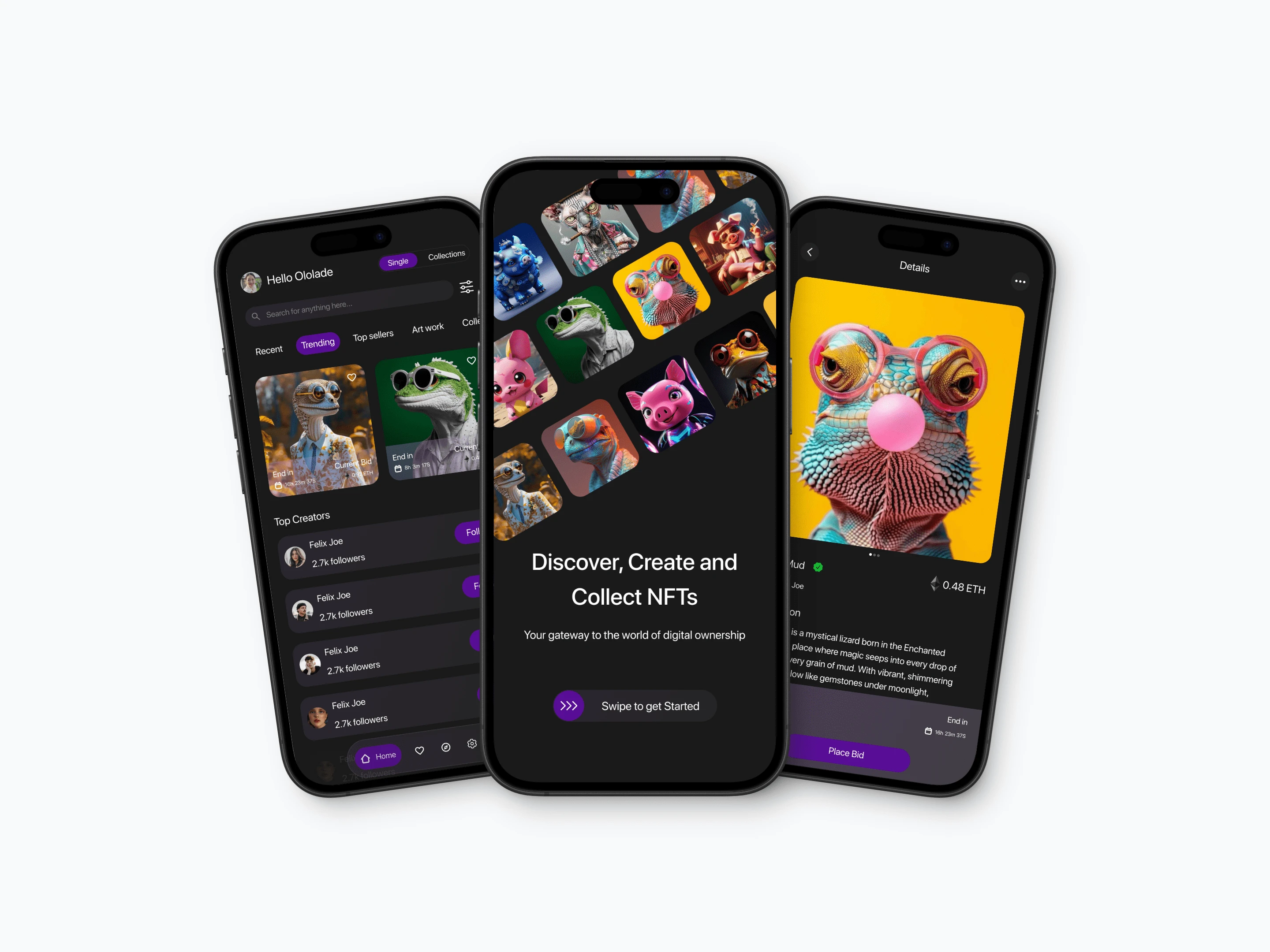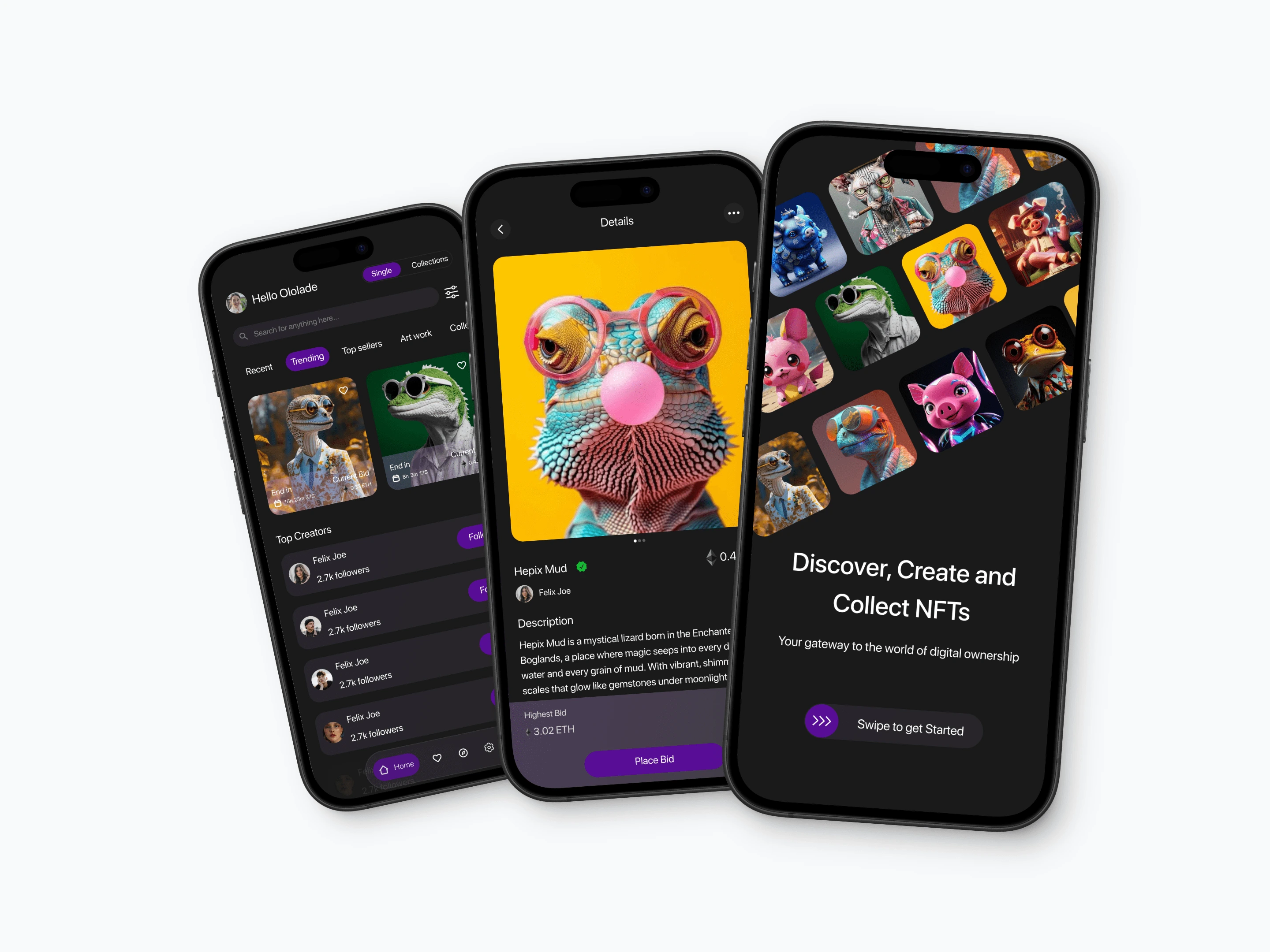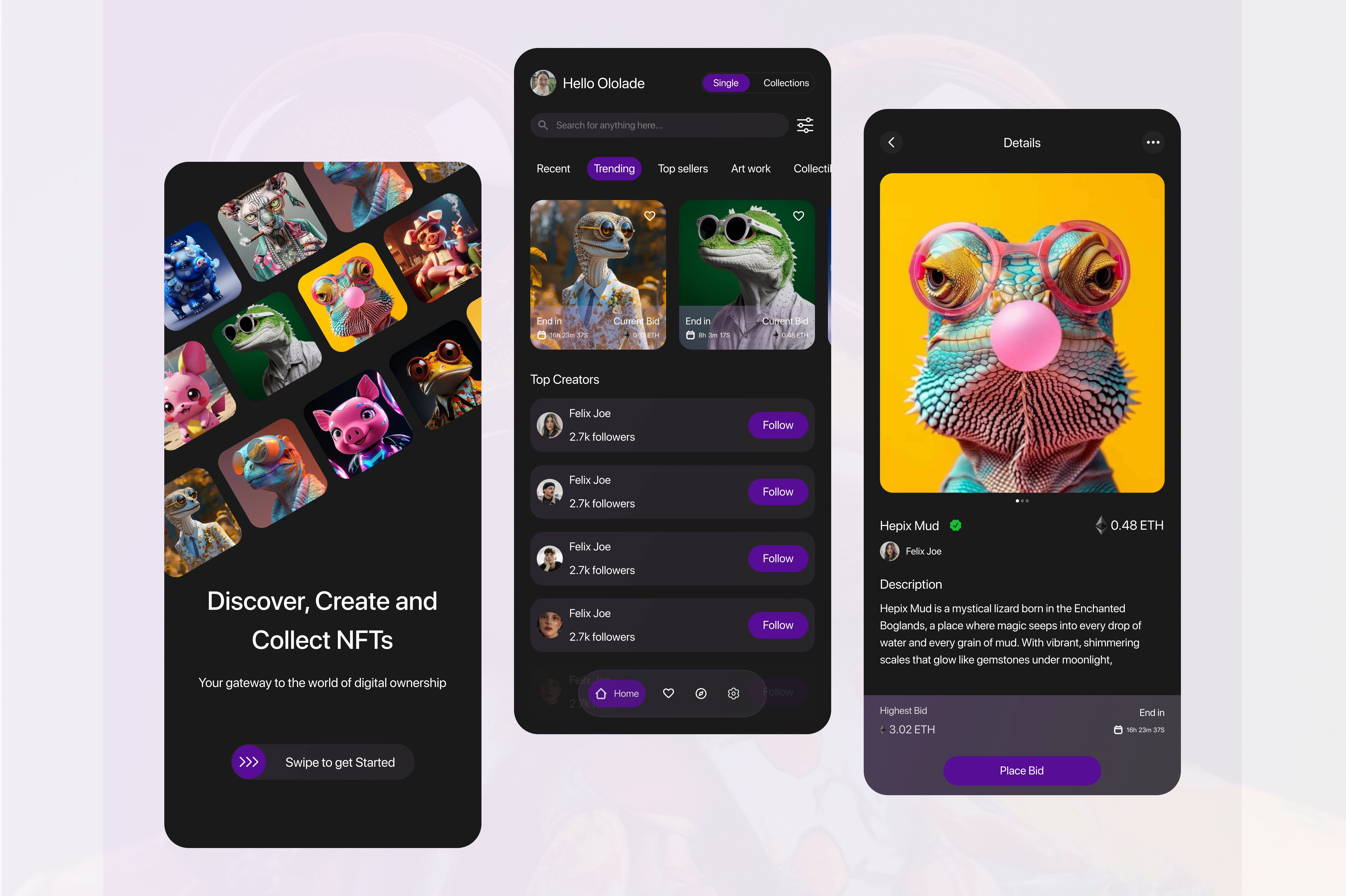 The app was designed with a focus on simplicity and user empowerment. I implemented a clear, step-by-step onboarding process to guide users smoothly into the NFT ecosystem. The home screen offers intuitive navigation, allowing users to easily access their collections, discover new NFTs, and create their own with minimal effort. The NFT details page is clean and straightforward, providing essential information without clutter. This approach ensures that both new and existing collectors can easily navigate the platform without feeling overwhelmed, enhancing engagement and retention.