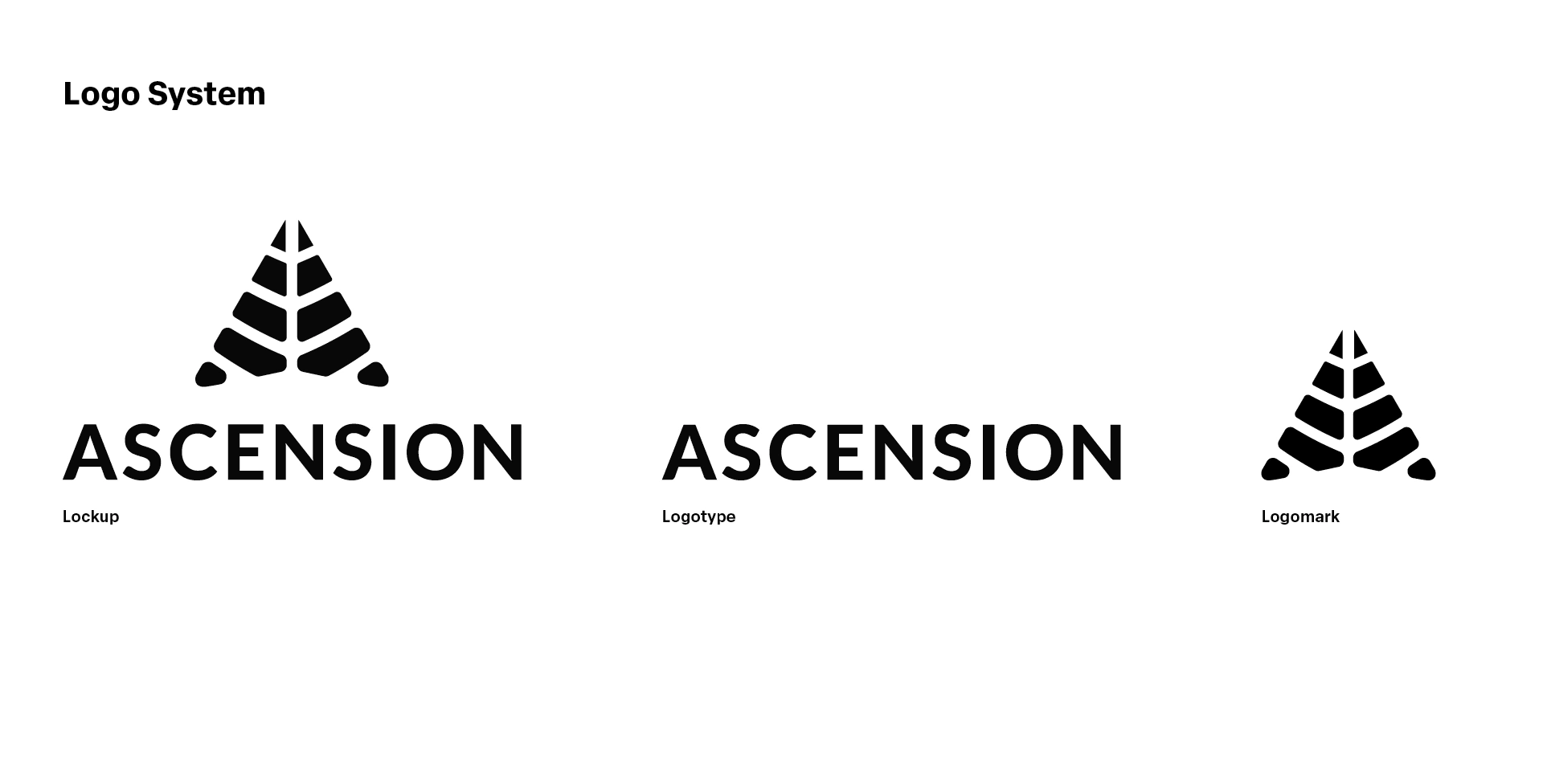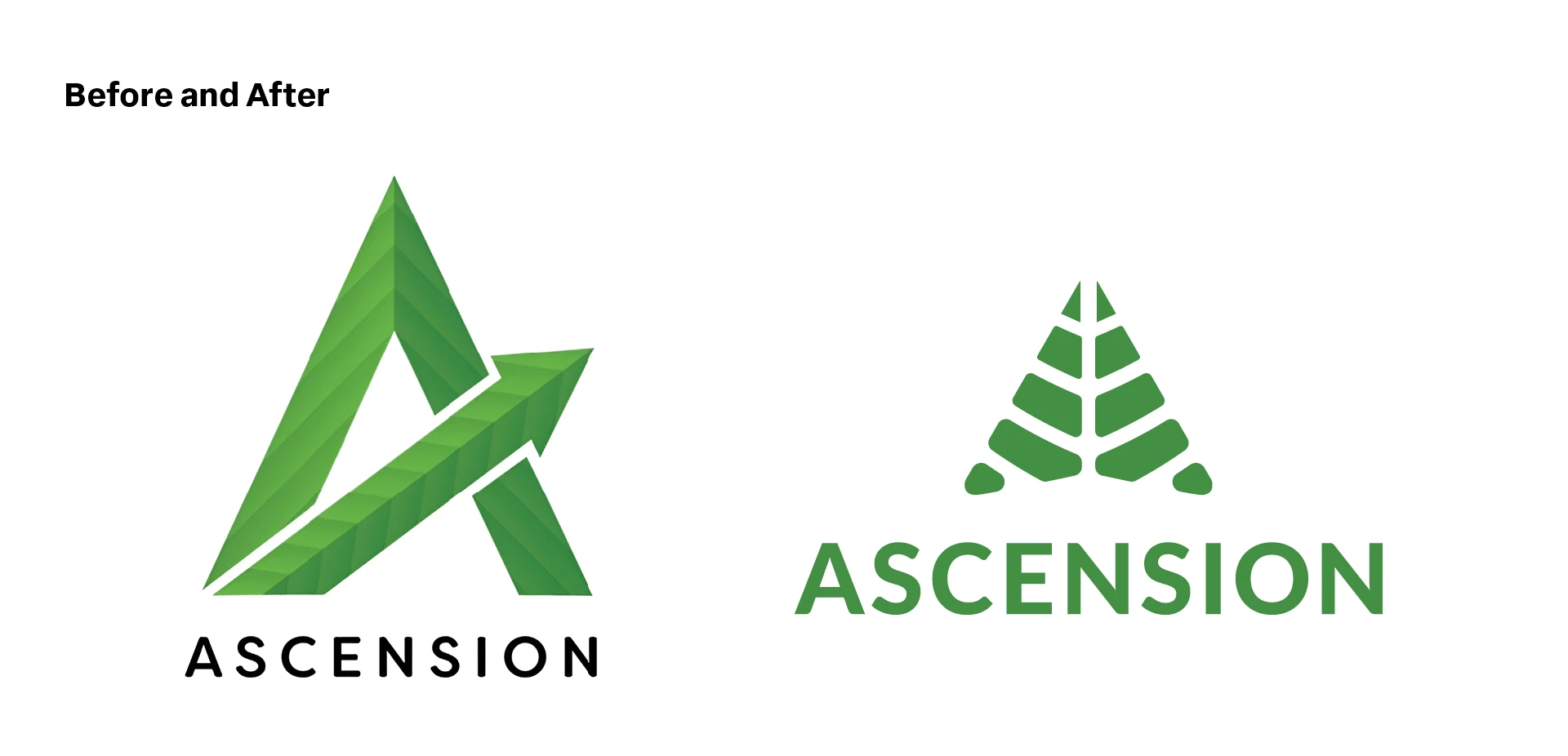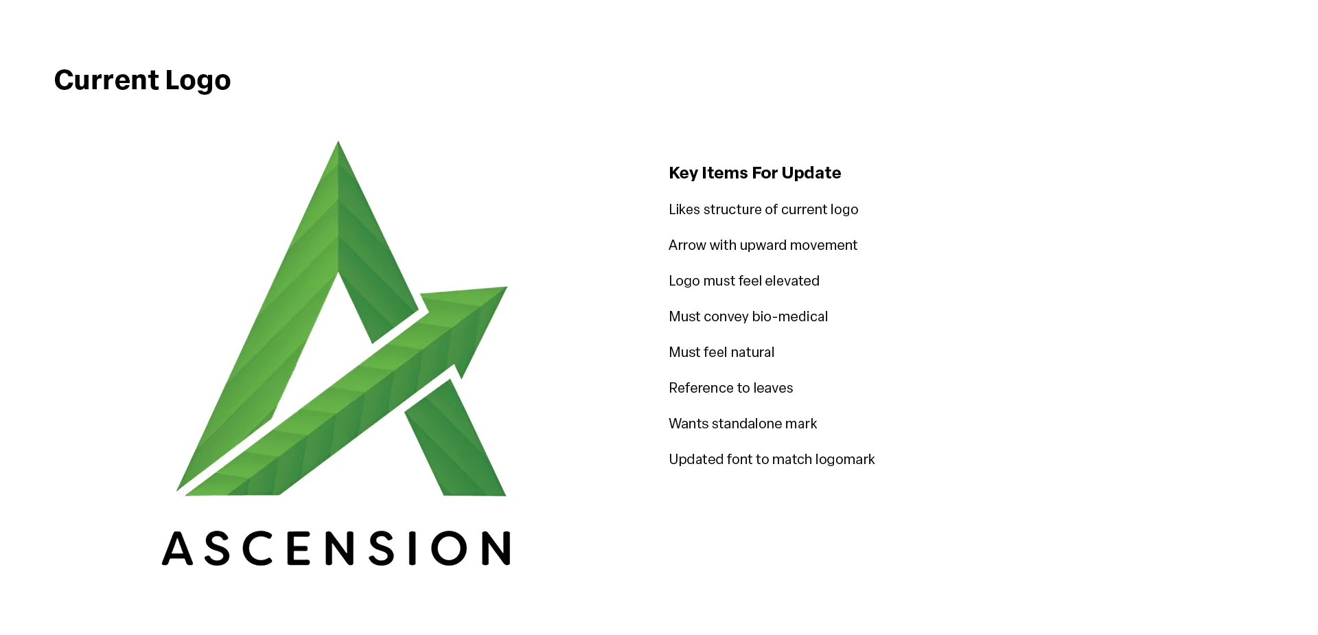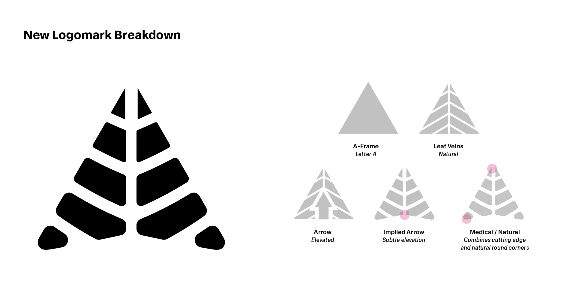 The logomark integrates four core themes aligned with Ascension's brand: the letter “A,” a natural essence, an upward arrow symbolizing product elevation, and a subtle medical influence. The visual breakdown above details how each concept is embedded within the design.