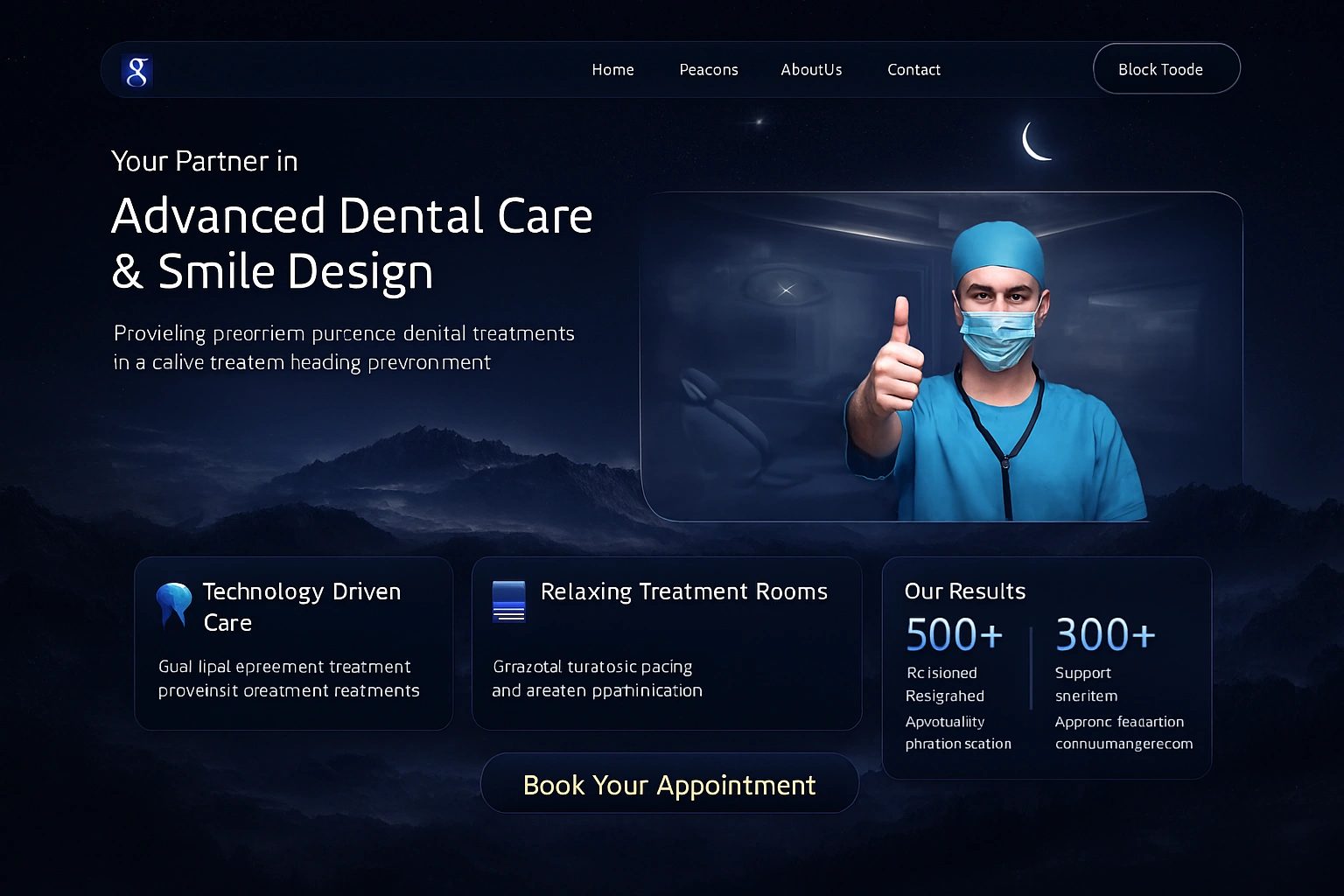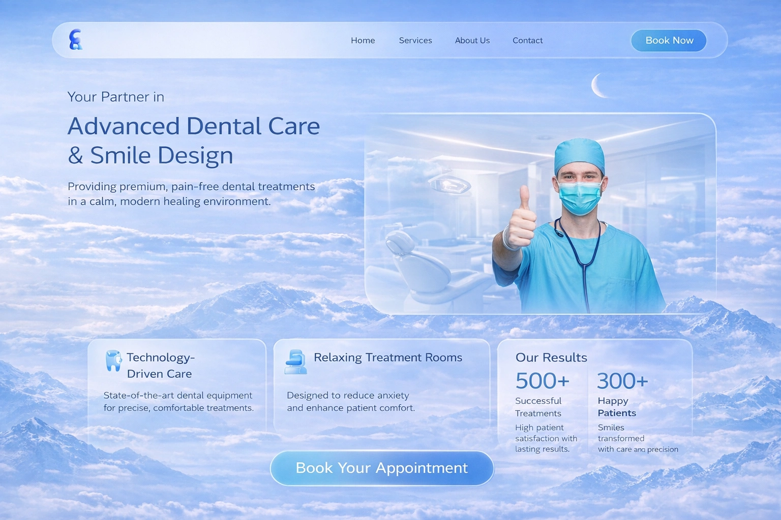 Clean modern dental clinic website focused on patient comfort trust and clear booking experience using soft visuals and structured layout