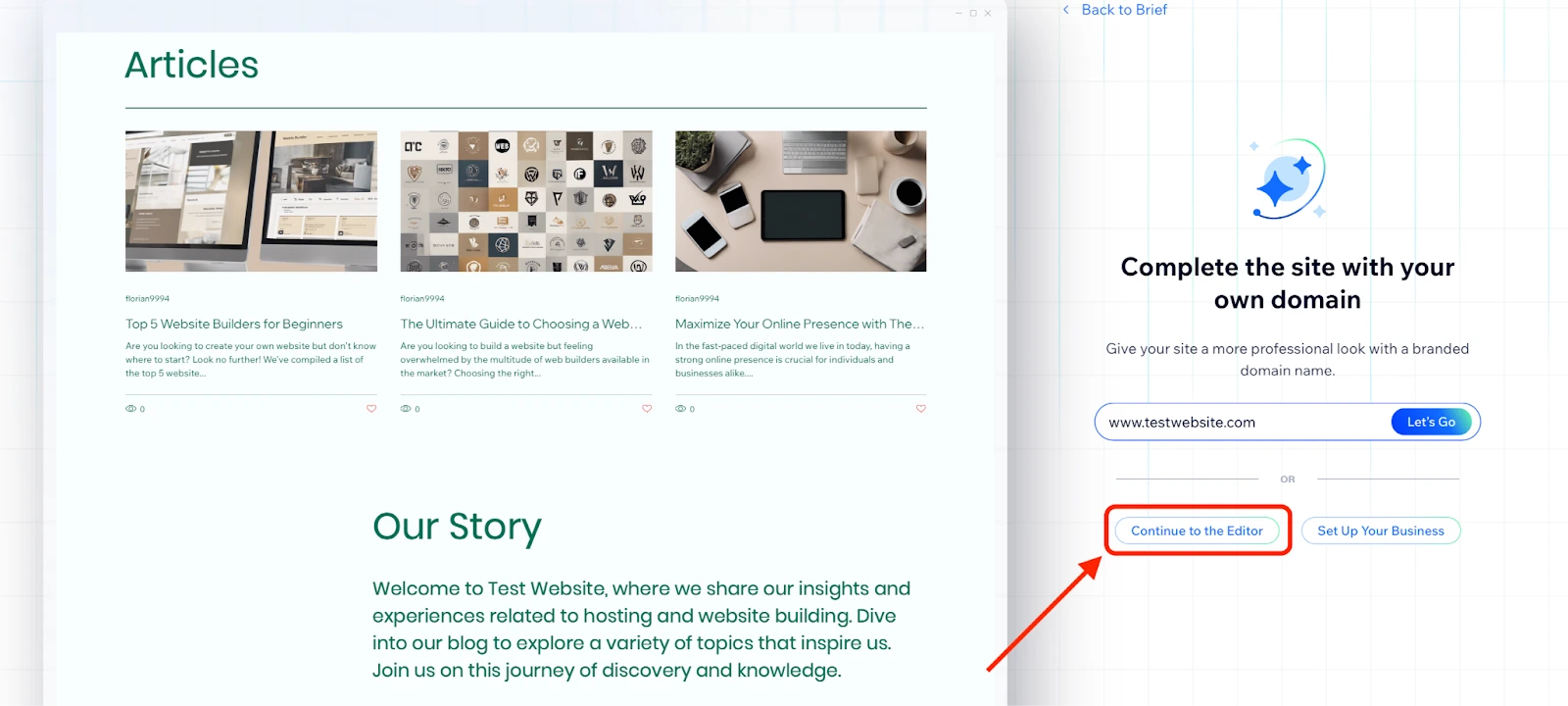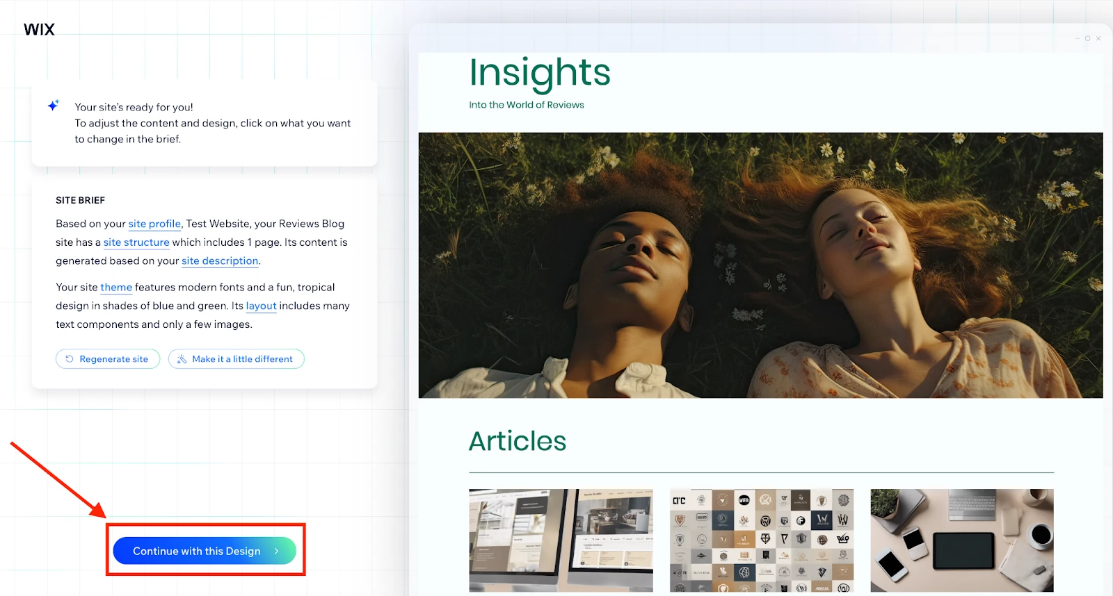 Wix AI provides a site brief and generates a template. You can further customize your site design by editing the site brief, clicking on Regenerate Site, or selecting Make it a little different. Once you are satisfied with the look of your generated site, click Continue with this design to proceed.