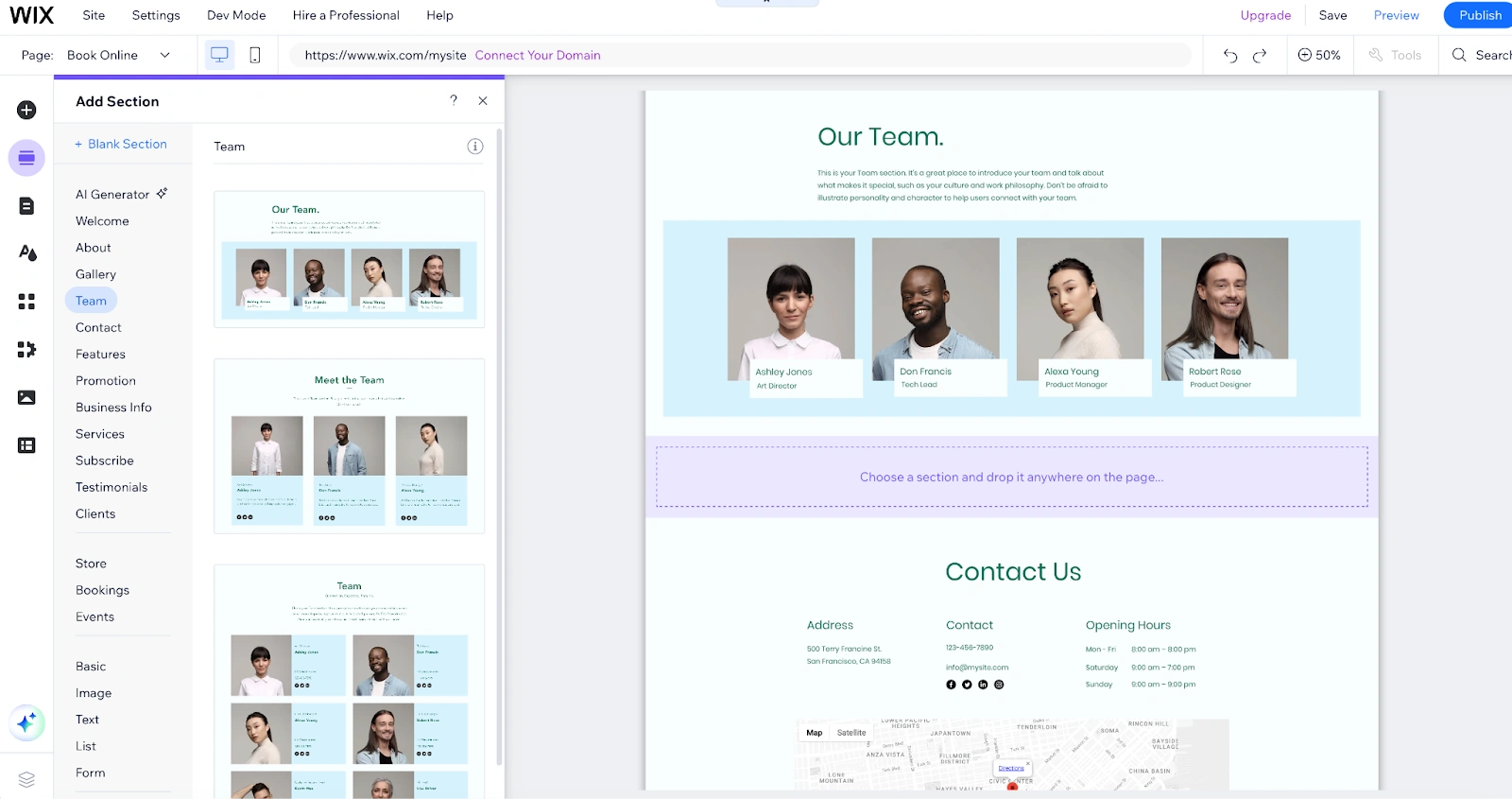 AI will write your text, design your images, and create a layout. You can then choose your favorite from the generated sections and add it to your site page.